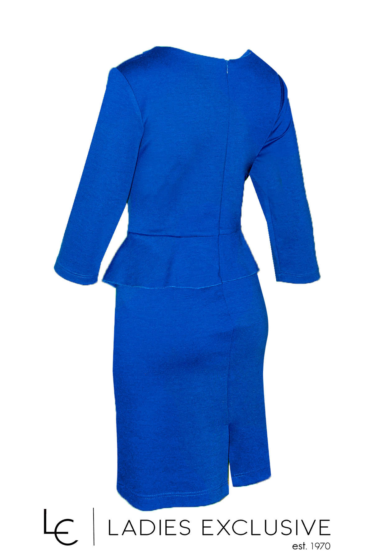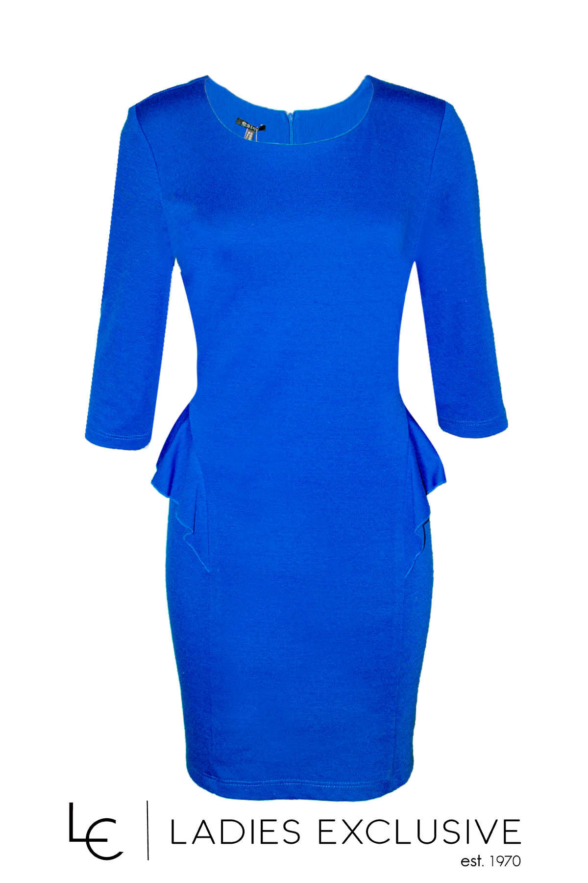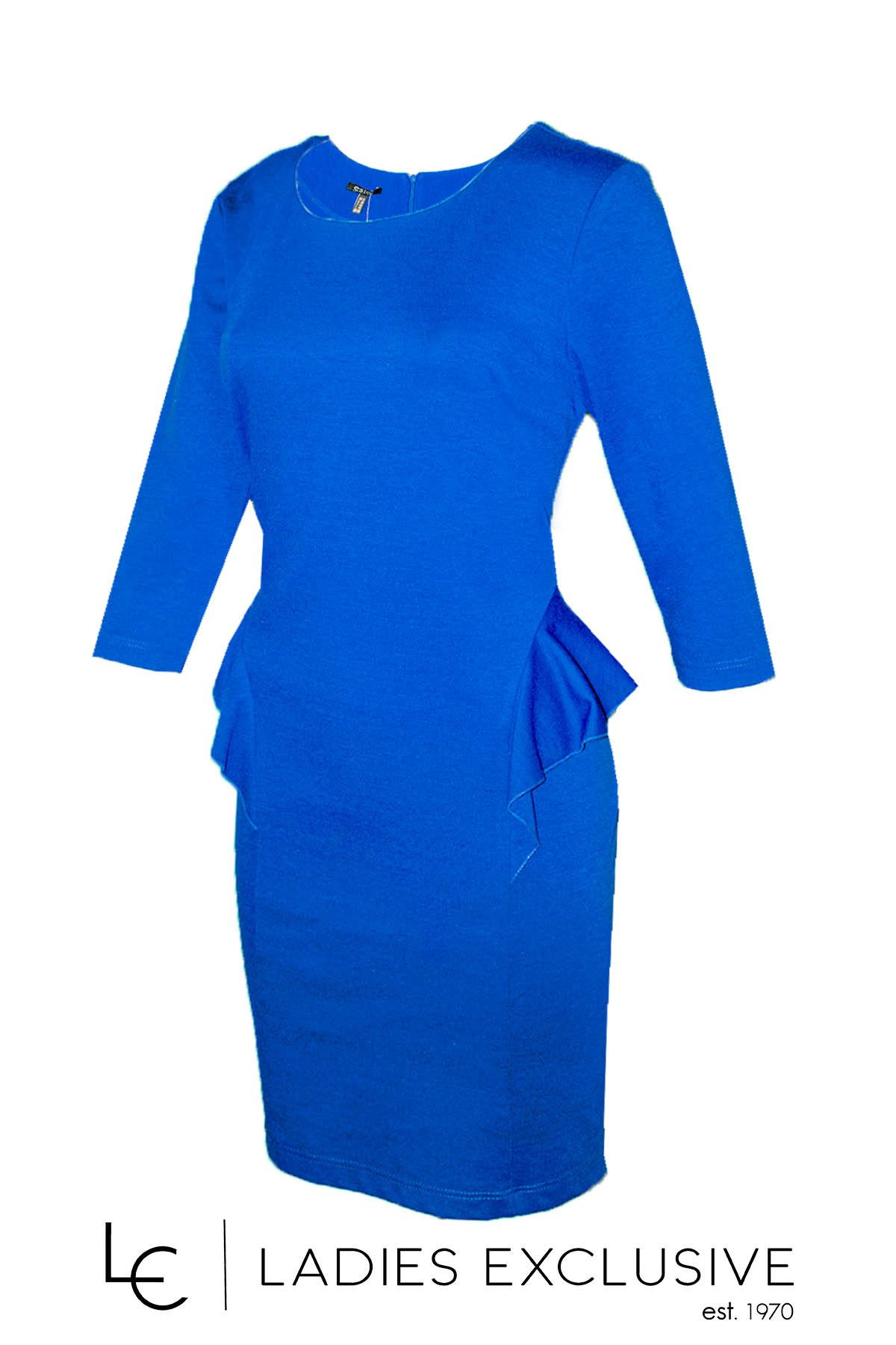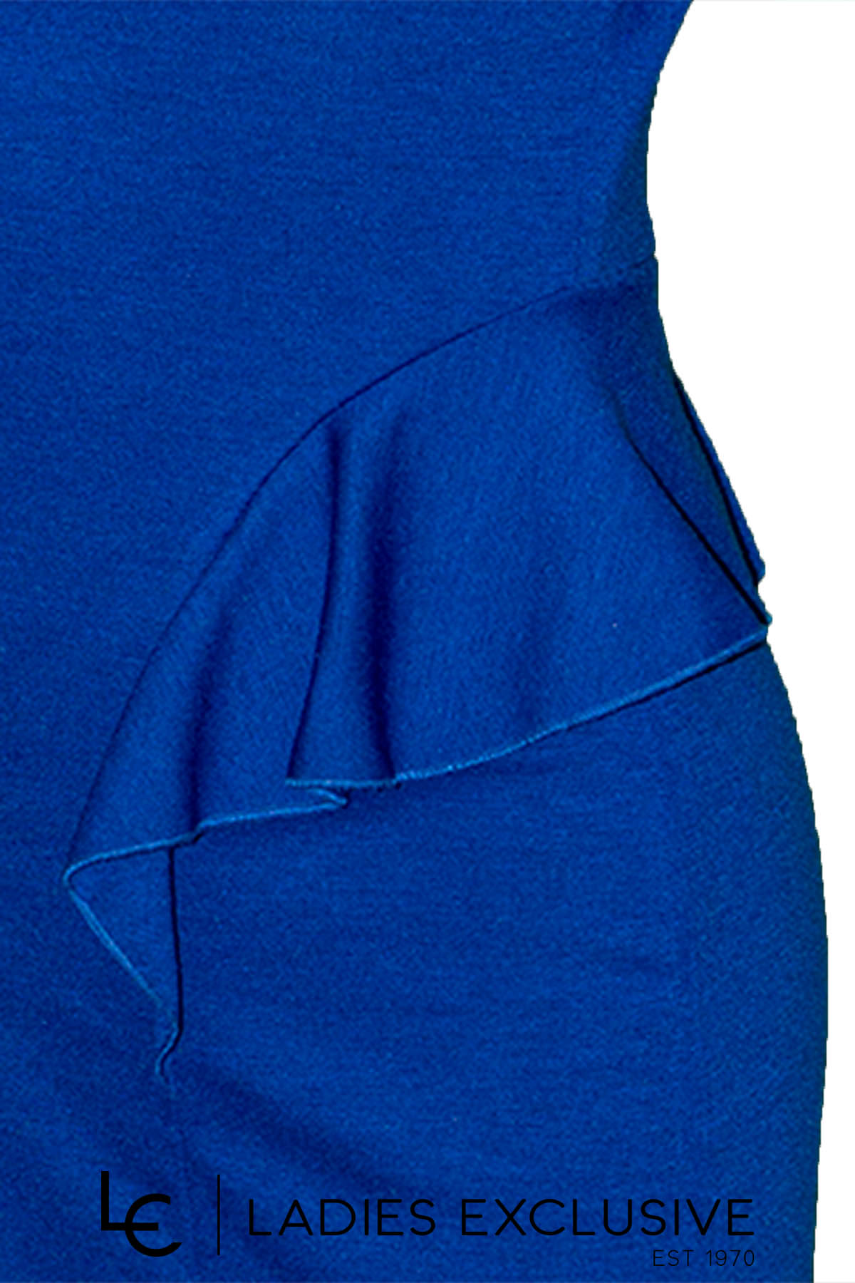 ESTEL Φόρεμα μπλε ρουά ελαστικό σε ίσια γραμμή ως το γόνατο με διακοσμητικά βολάν στα πλαϊνά. Συνοδεύεται από εντυπωσιακό κολιέ.
