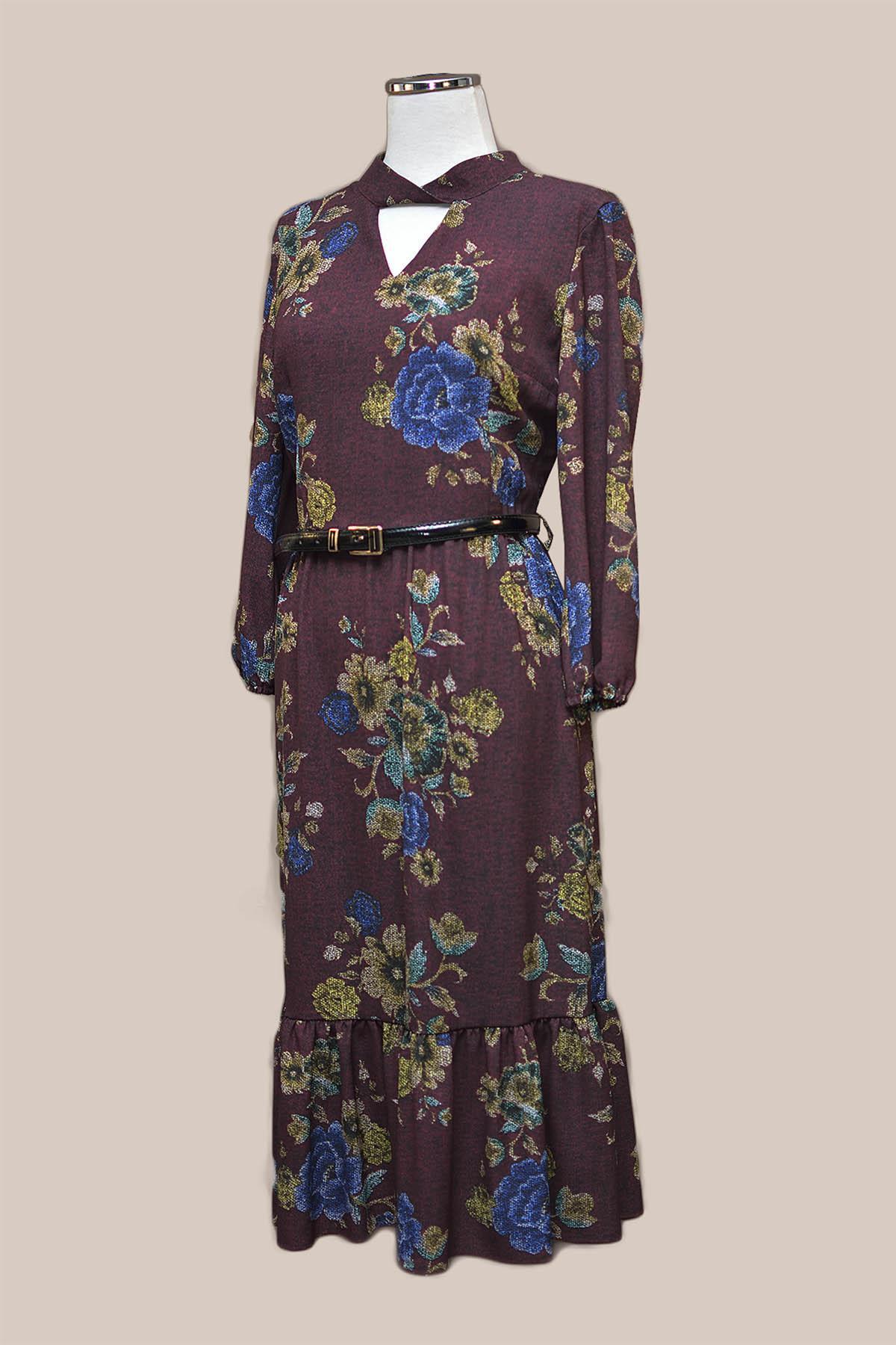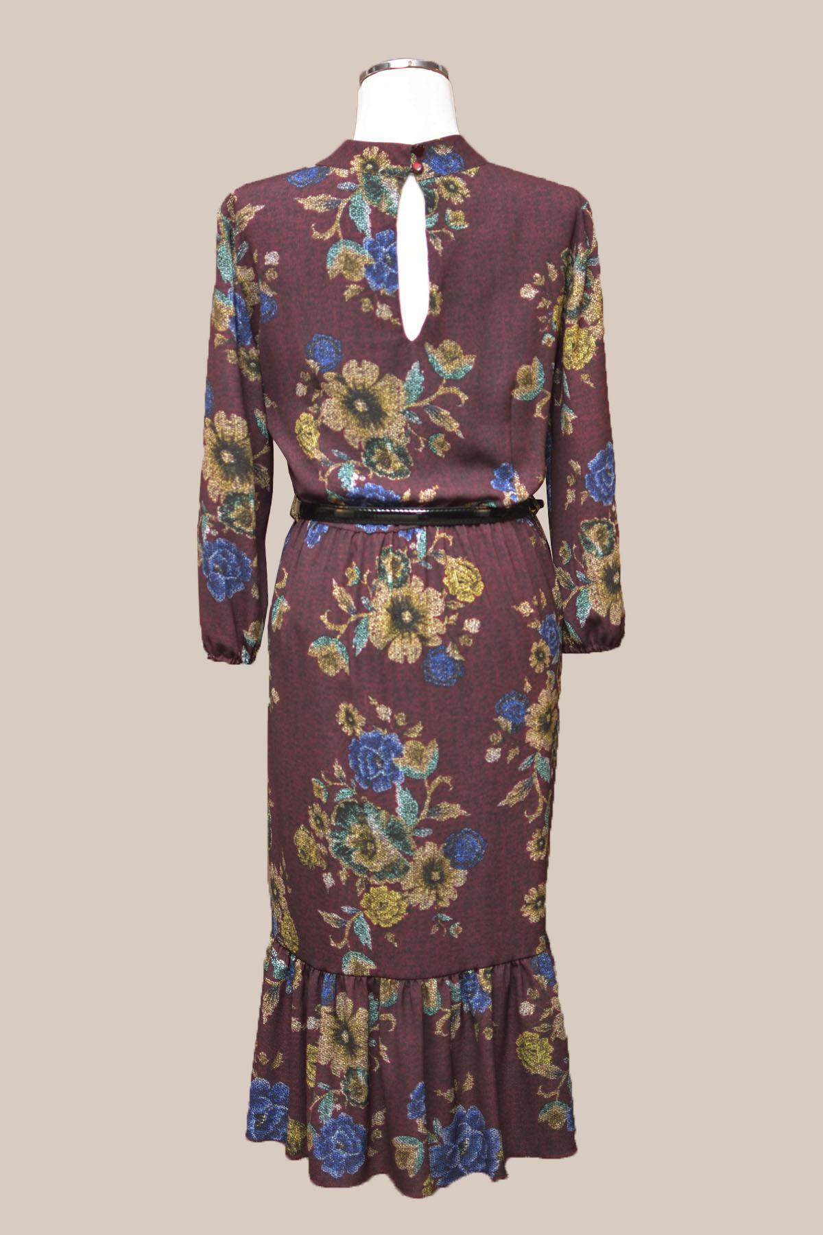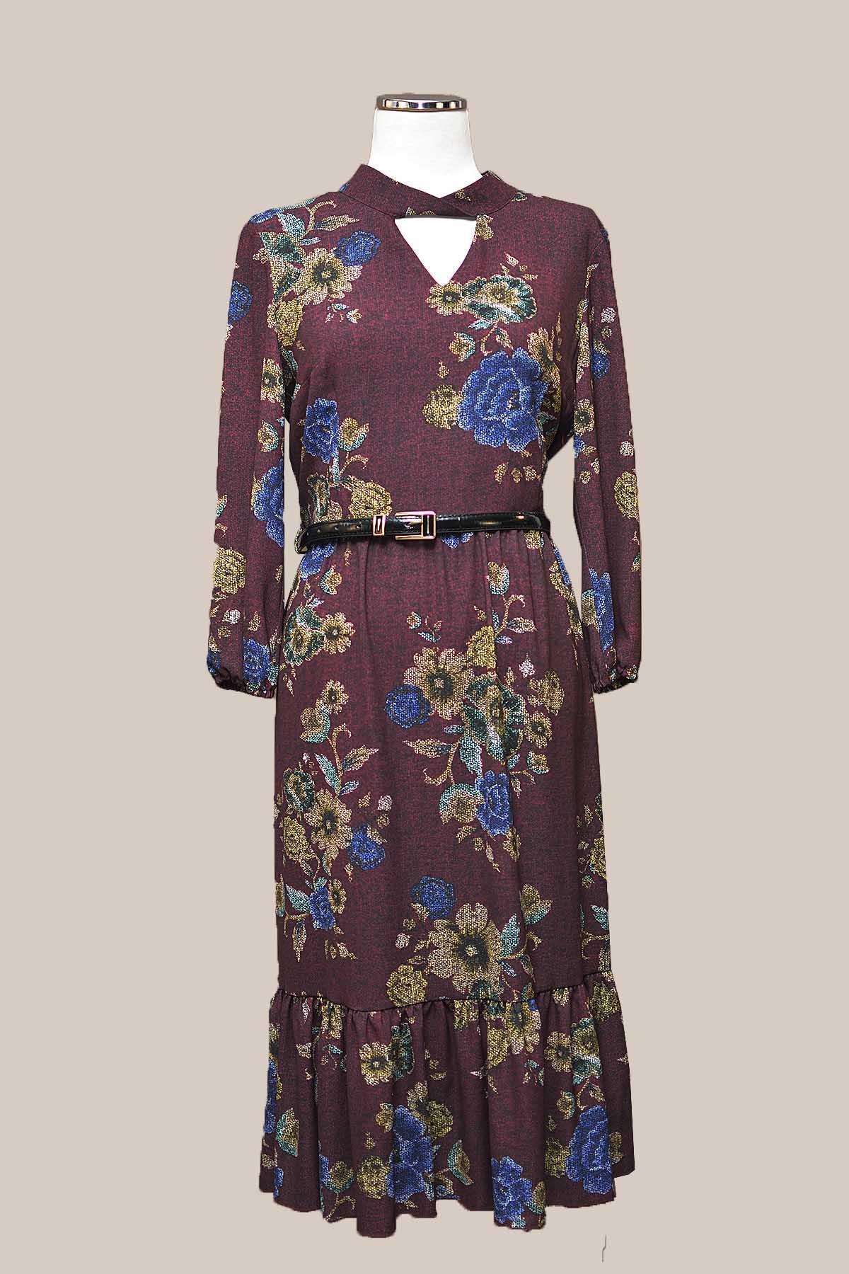 ESTEL Φόρεμα φλοράλ μίντι με 3/4 μανίκι και βολάν στο κάτω μέρος της φούστας. Ιδιαίτερη λεπτομέρεια το σχέδιο στο λαιμό.