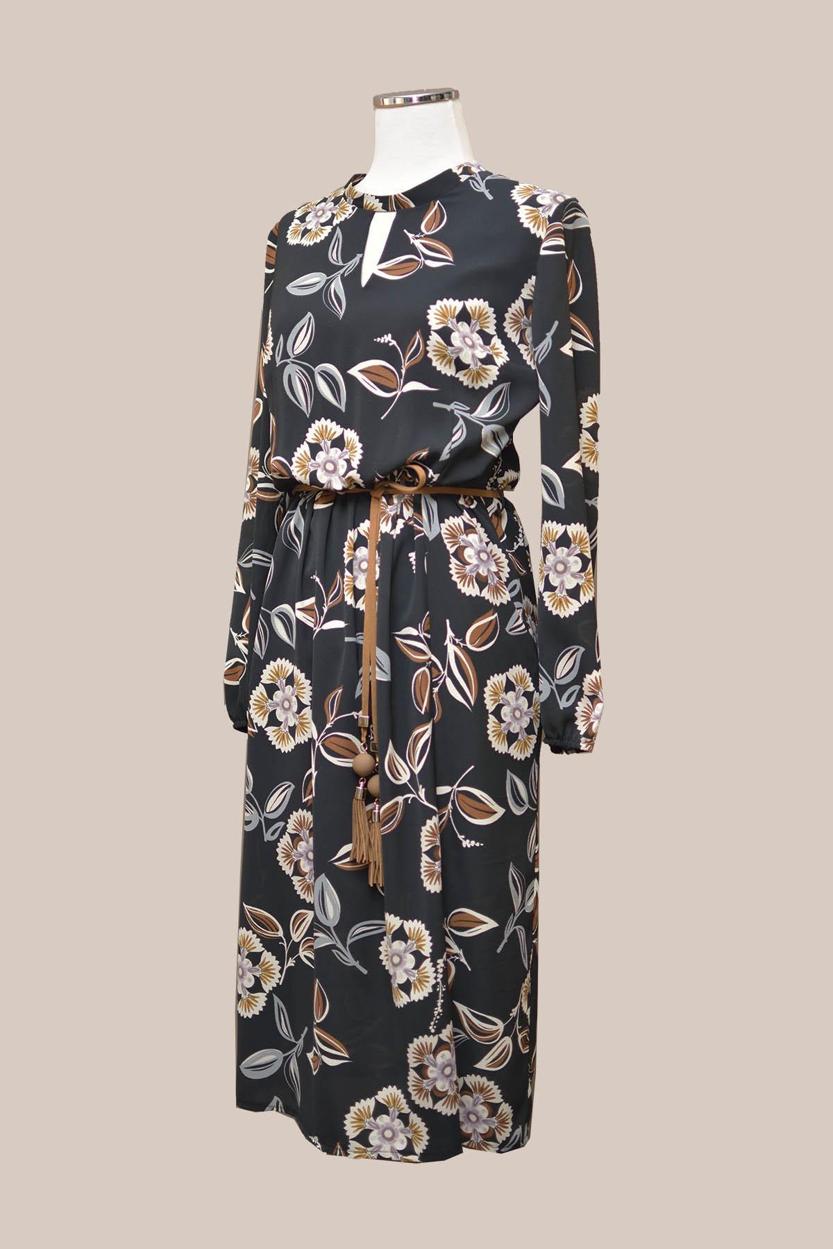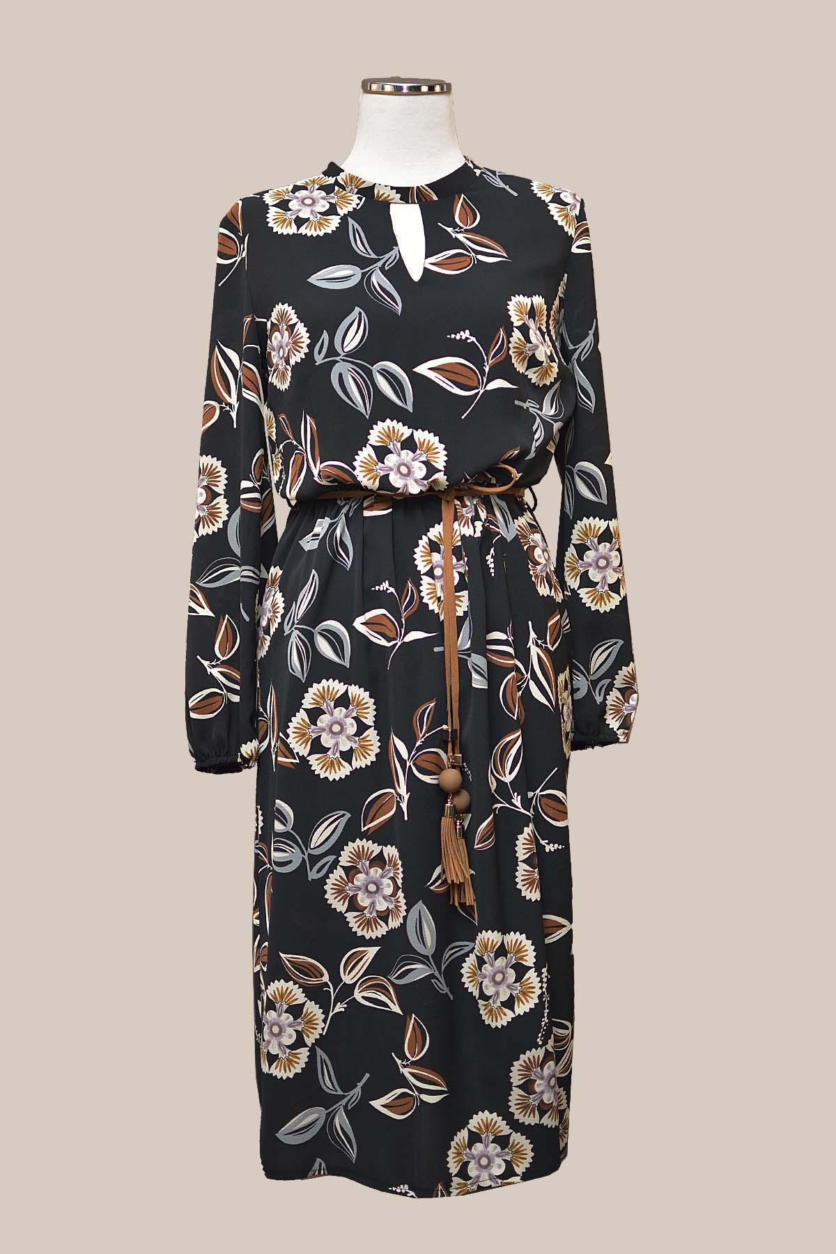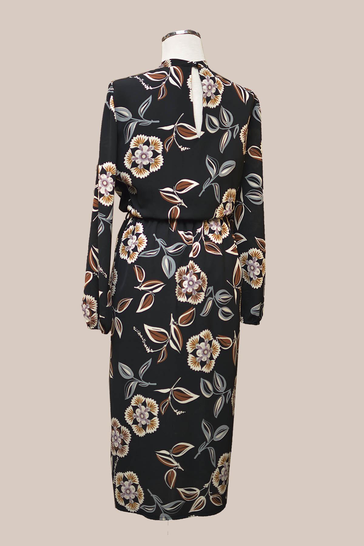 ESTEL Φόρεμα μίντι φλοράλ με μακρύ μανίκι και σκίσιμο στη φούστα. Στη μέση έχει λάστιχο και διακοσμητικό ζωνάκι και στο λαιμό κλείνει με κουμπί στο πίσω μέρος.