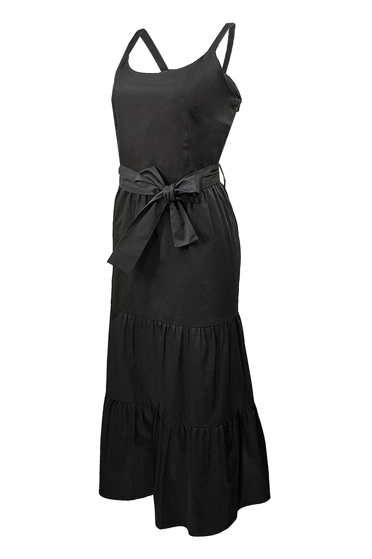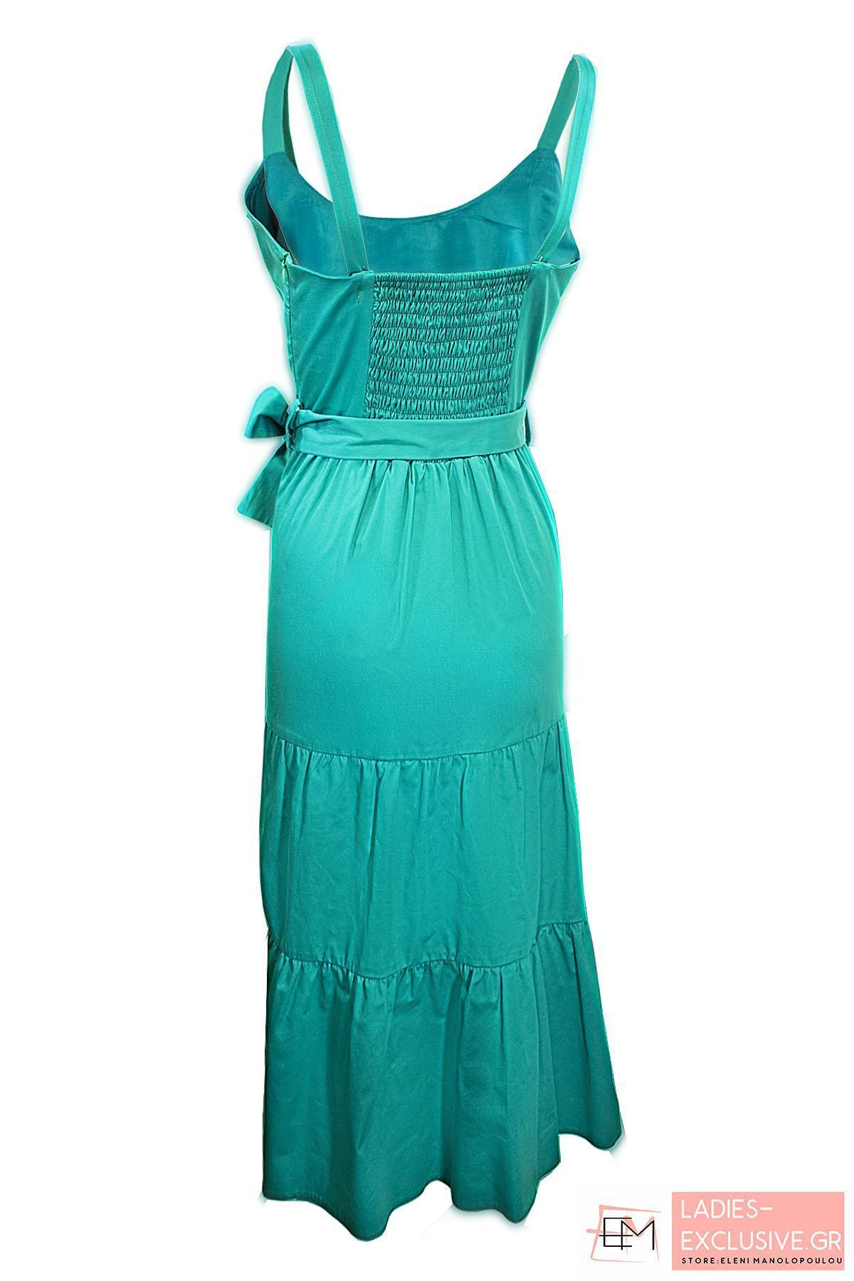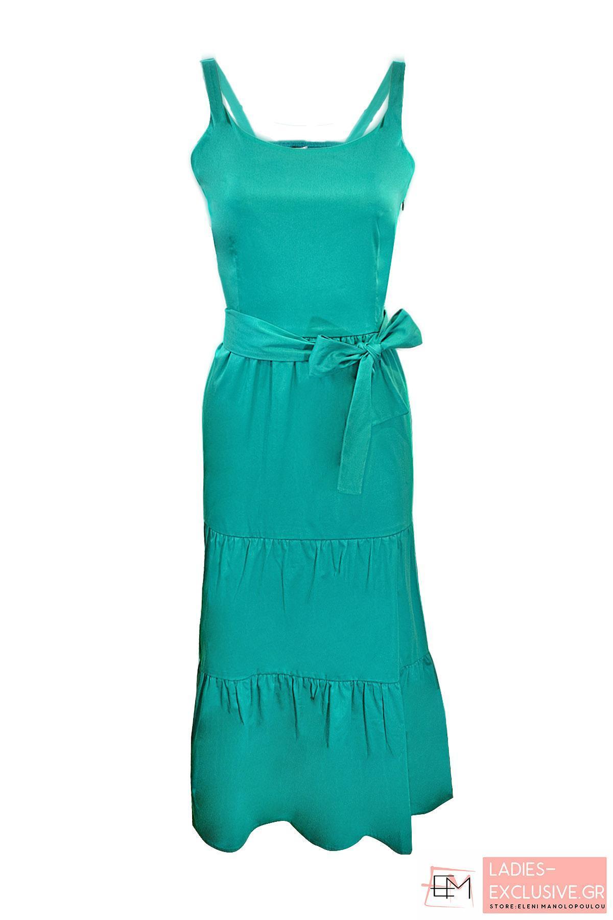 ESTEL Φόρεμα από βαμβάκι σατινέ με τιράντες, σφηκοφωλιά στην πλάτη, ζώνη και βολάν στη φούστα.
