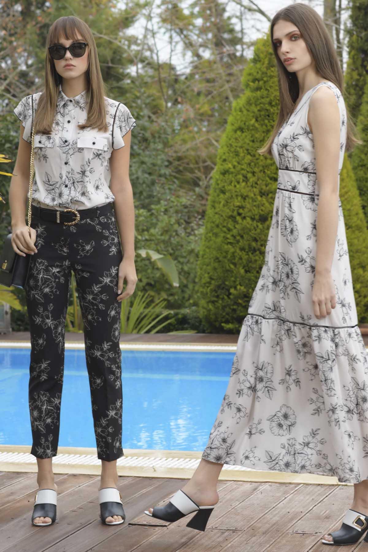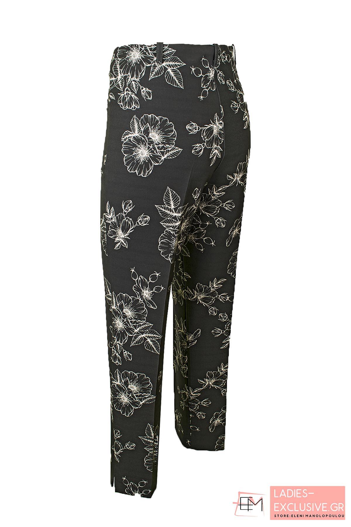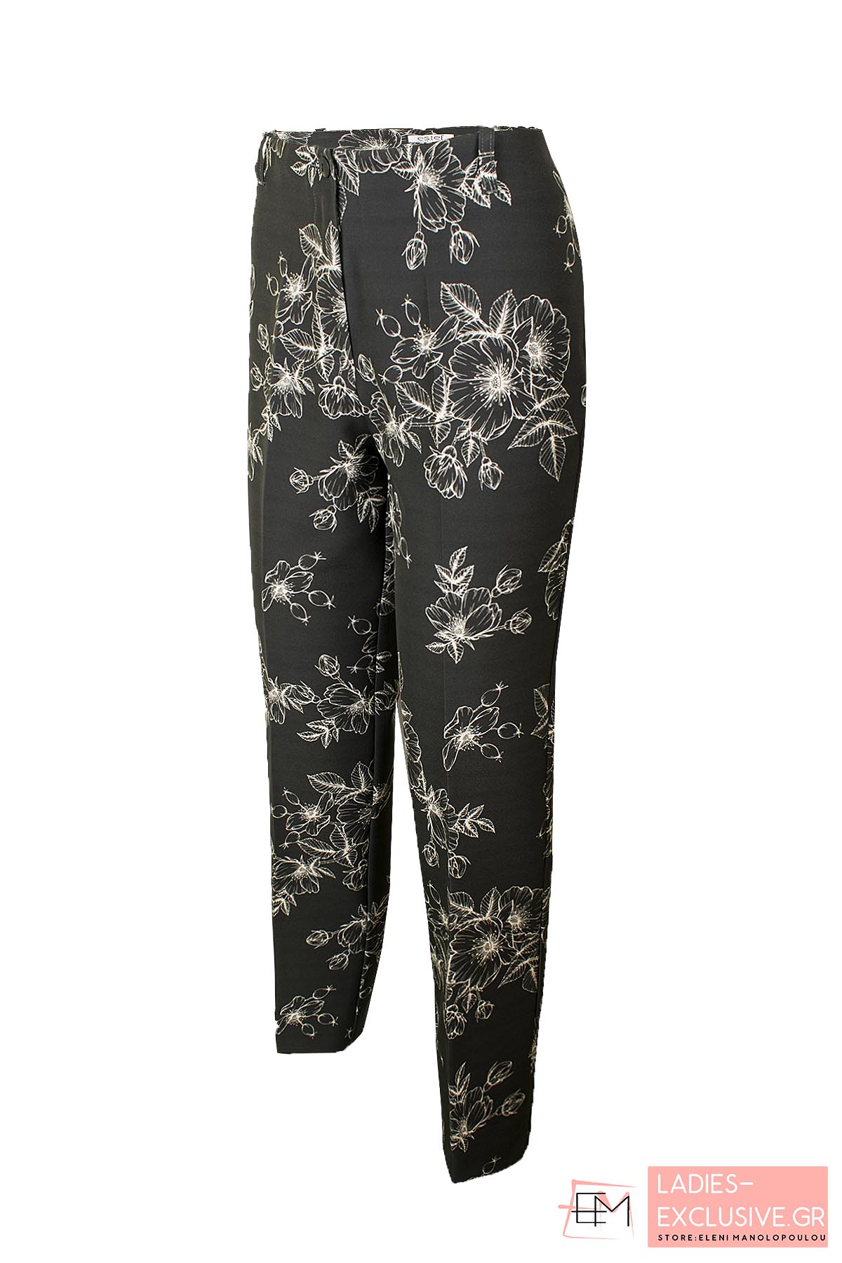 ESTEL Παντελόνι εμπριμέ ανοιξιάτικο σε ίσια γραμμή, μαύρο με μοτίβο μπεζ λουλούδια.