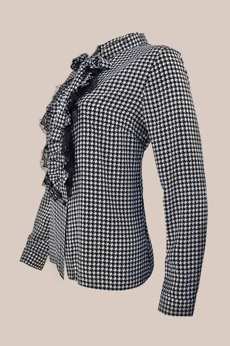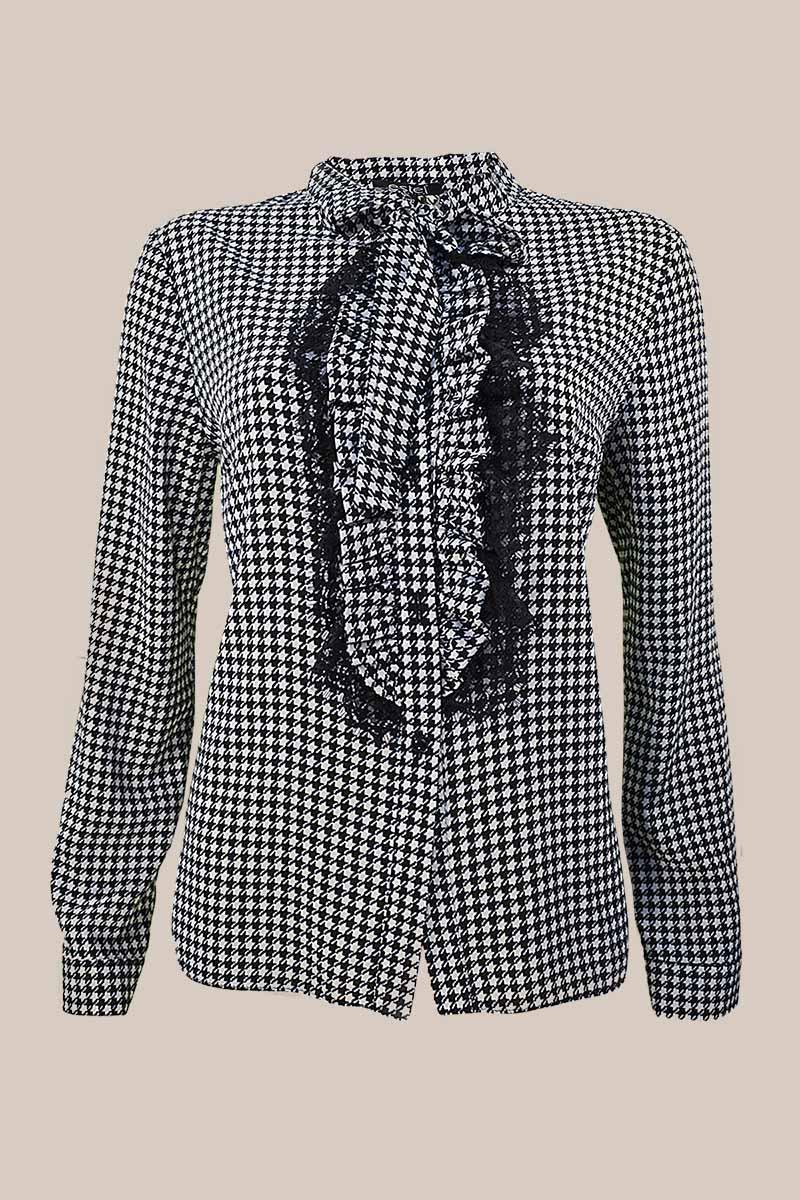 ESTEL Πουκάμισο μακρυμάνικο ασπρόμαυρο pied de poule με βολάν και δαντέλα και δέσιμο 'γραβάτα' στο λαιμό.