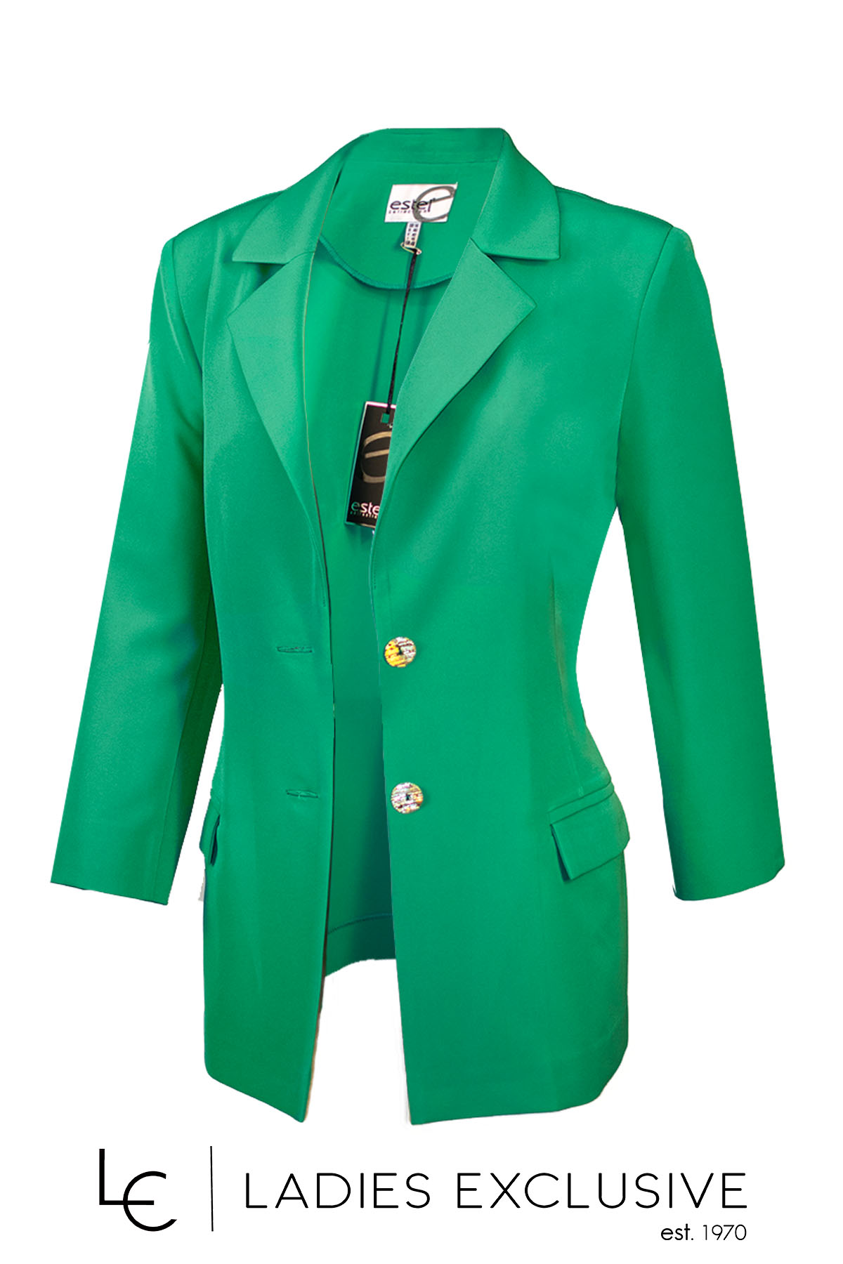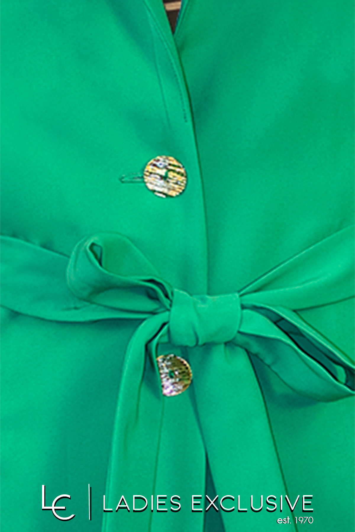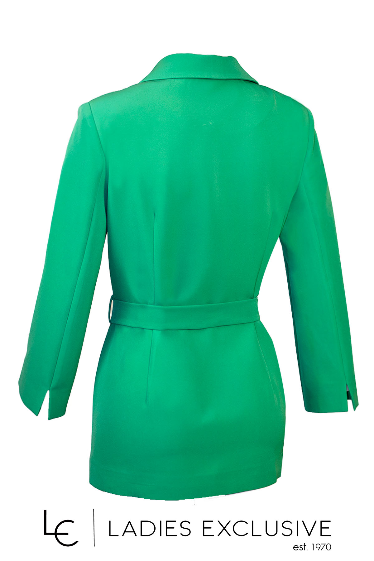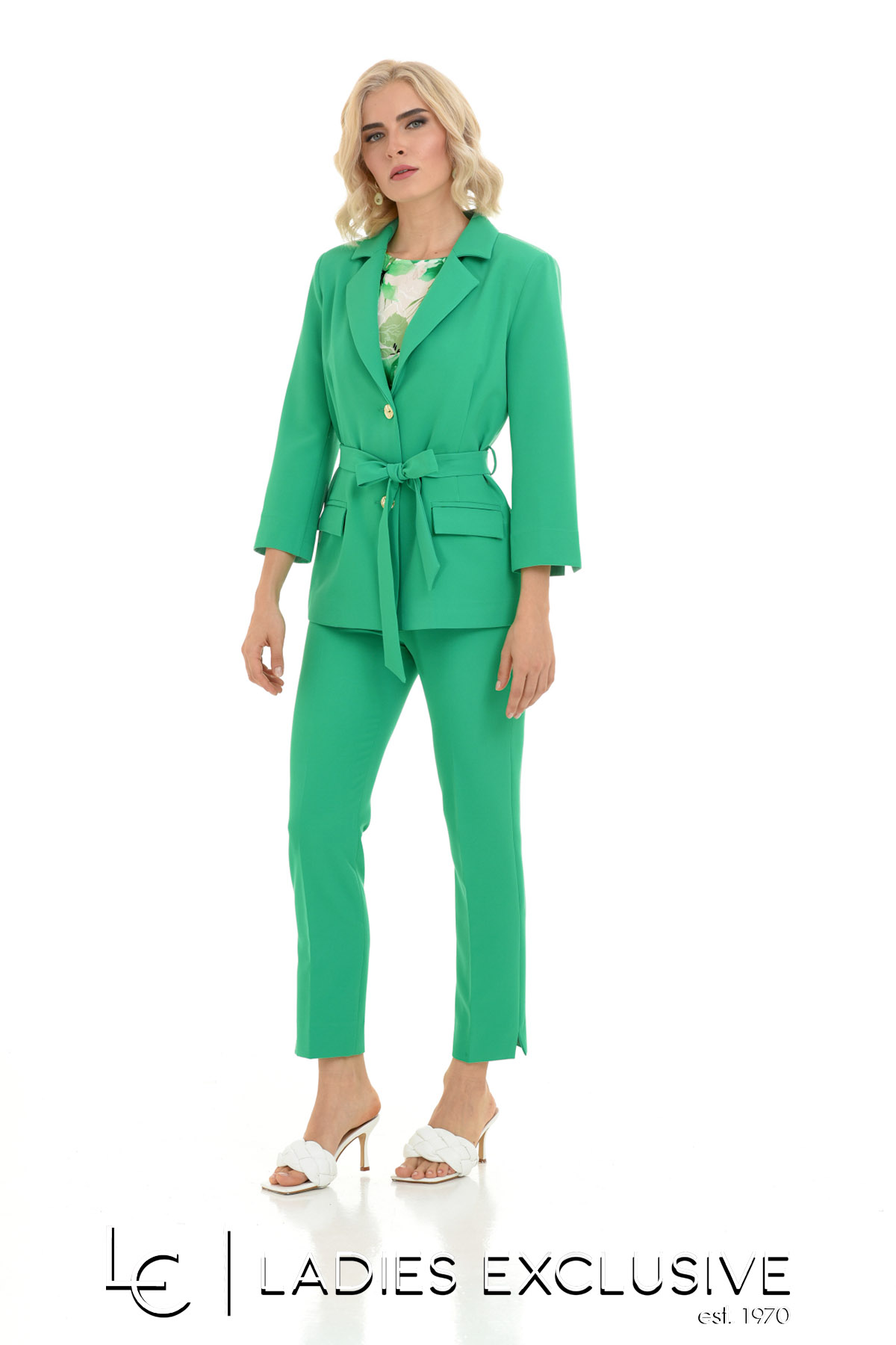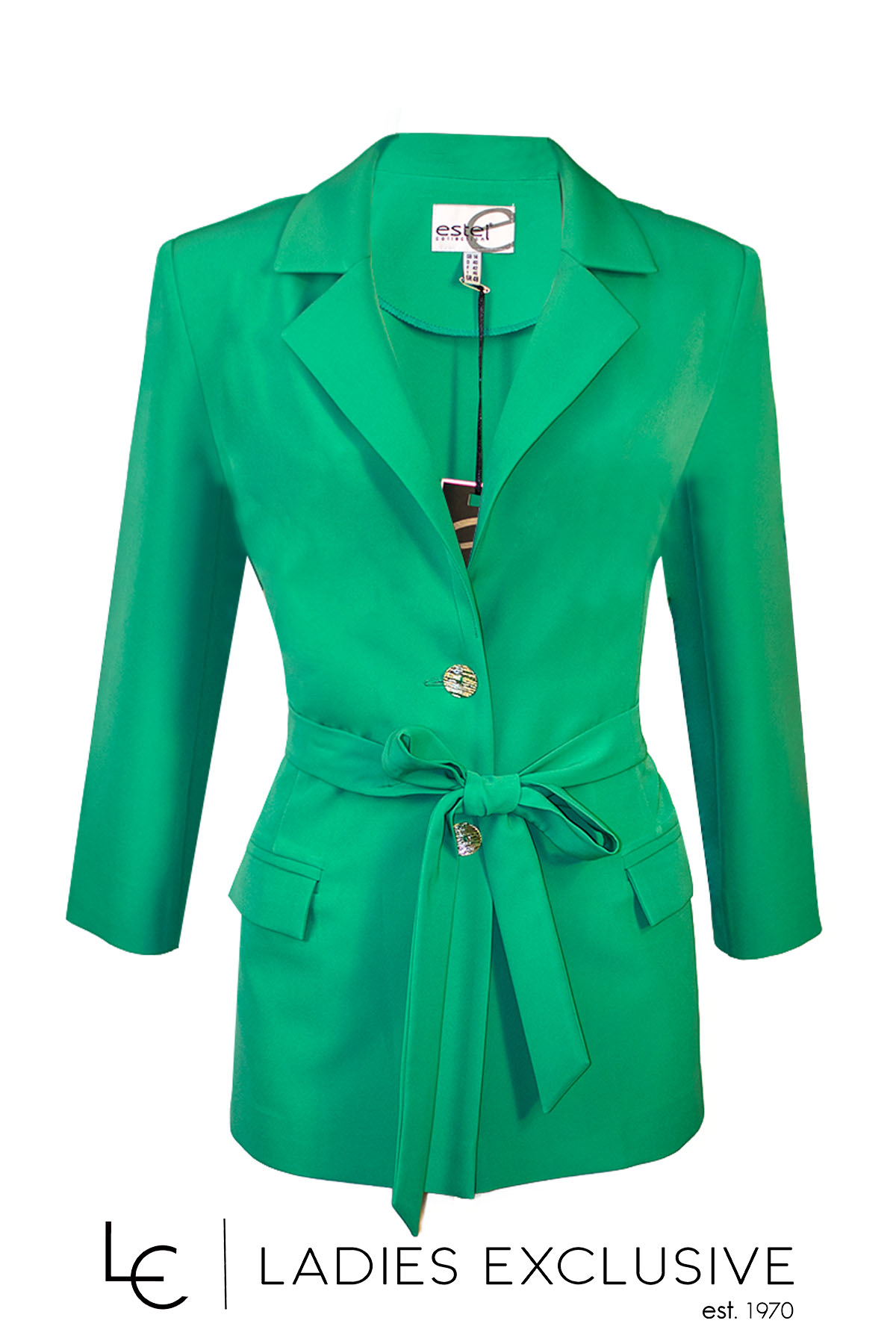 ESTEL Σακάκι πράσινο κρεπ με ζώνη και τσέπες με καπάκια. Γίνεται σετ με το παντελόνι με κωδικό 07406-00.04.