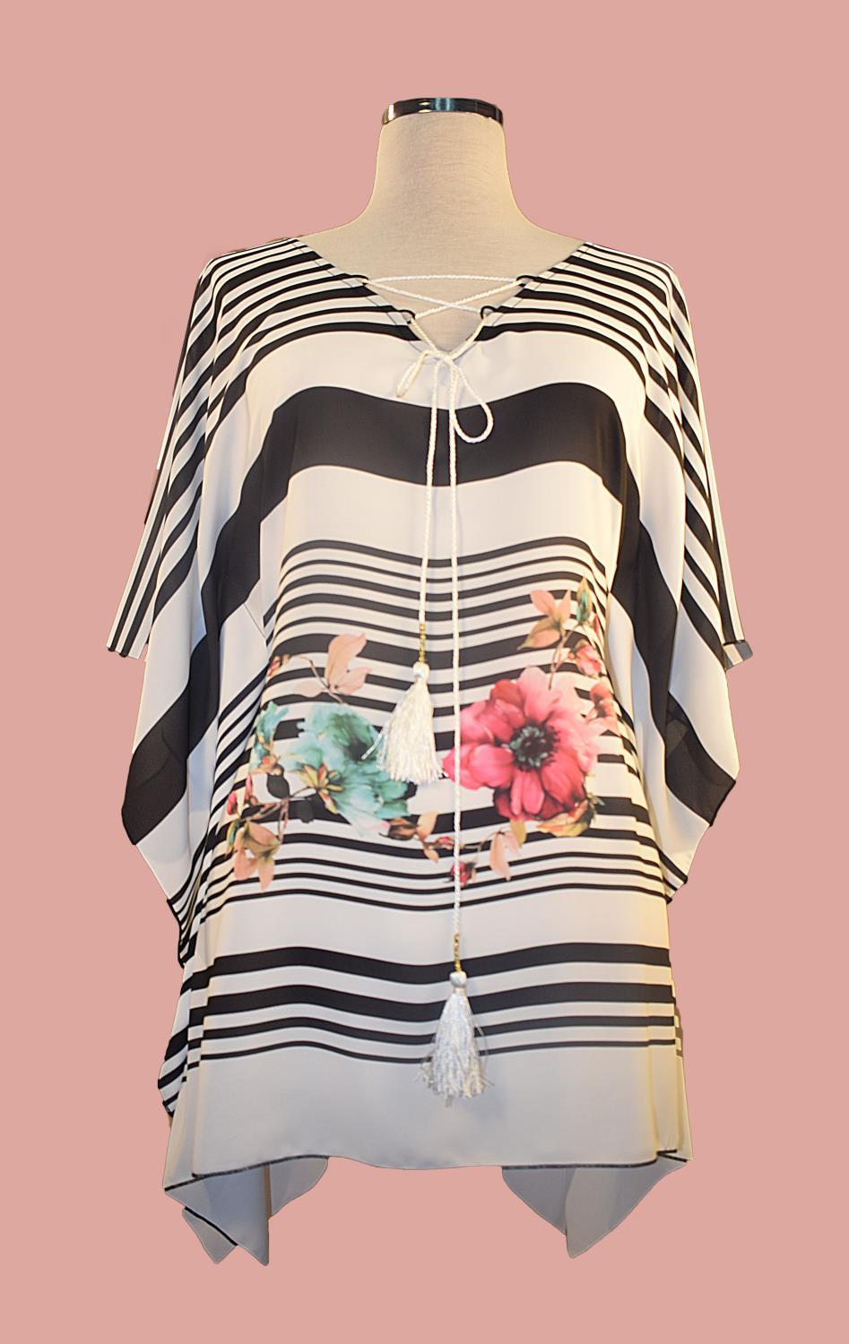 ESTEL Τουνίκ με άνοιγμα V από εμπριμέ μουσελίνα με κορδόνι στο λαιμό.