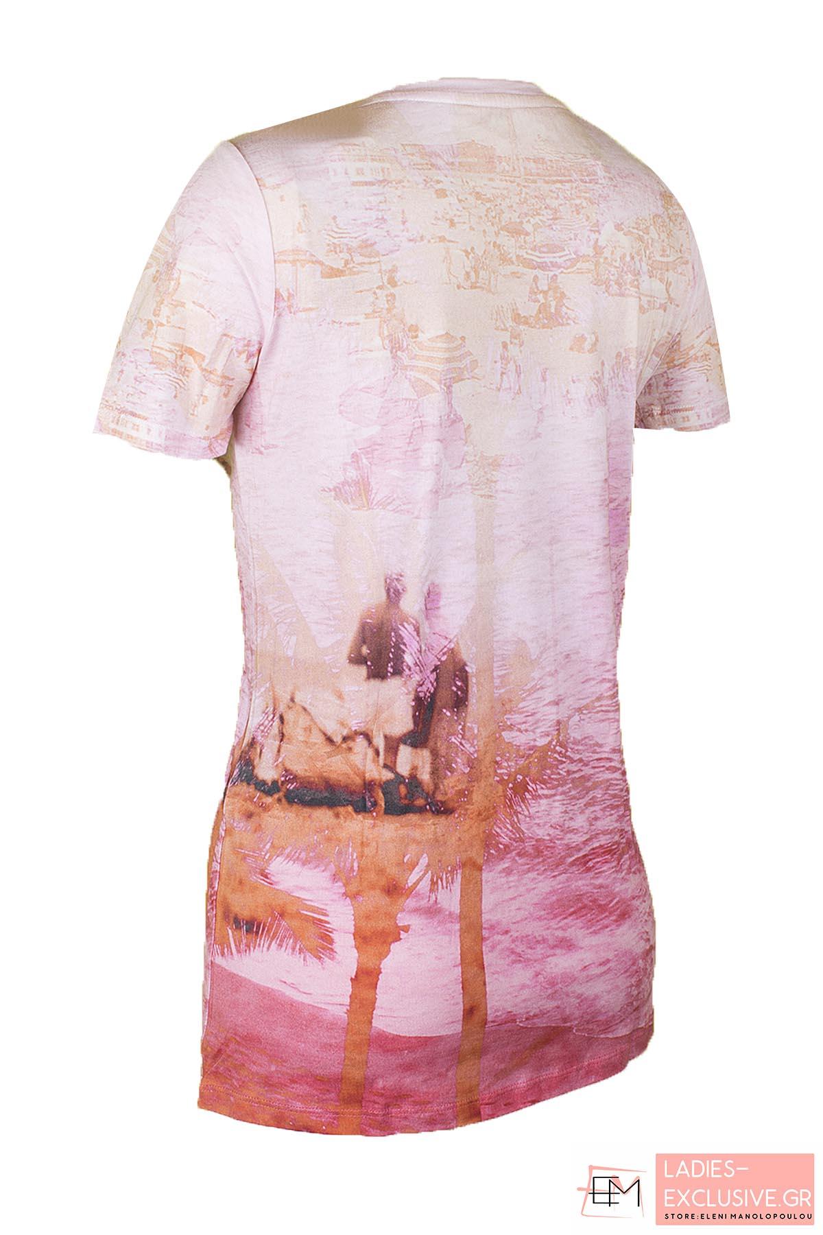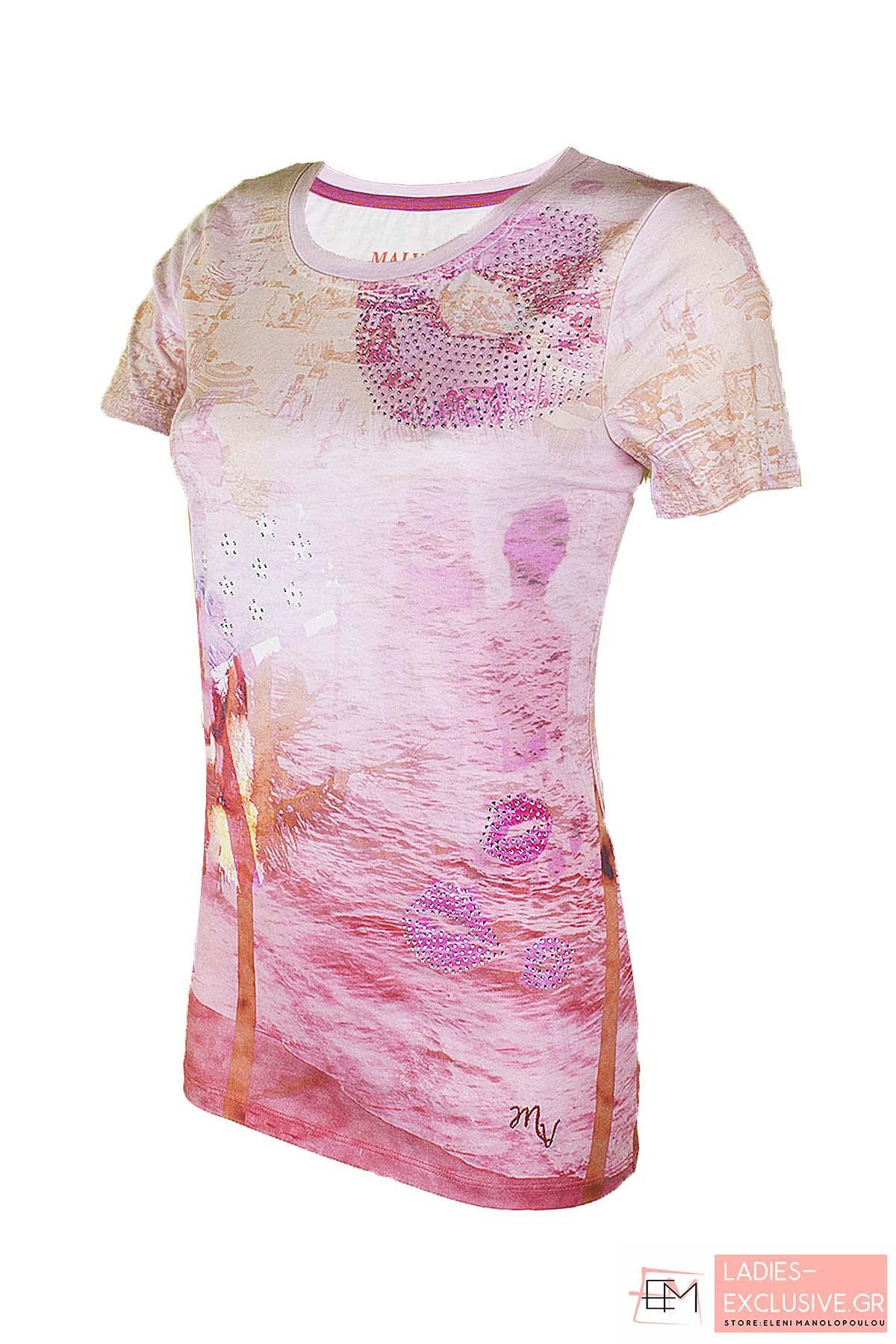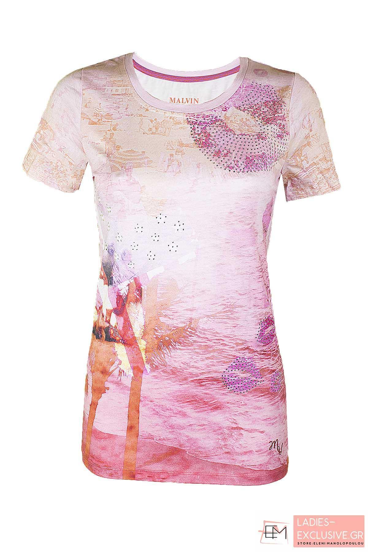 MALVIN Μπλούζα εμπριμέ κοντομάνικη με λαιμόκοψη και ιδιαίτερο σχέδιο με στρας στο μπροστινό μέρος.
