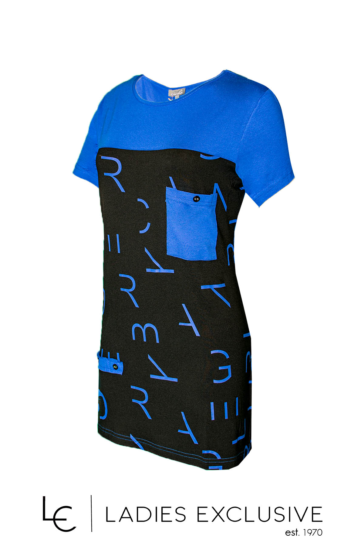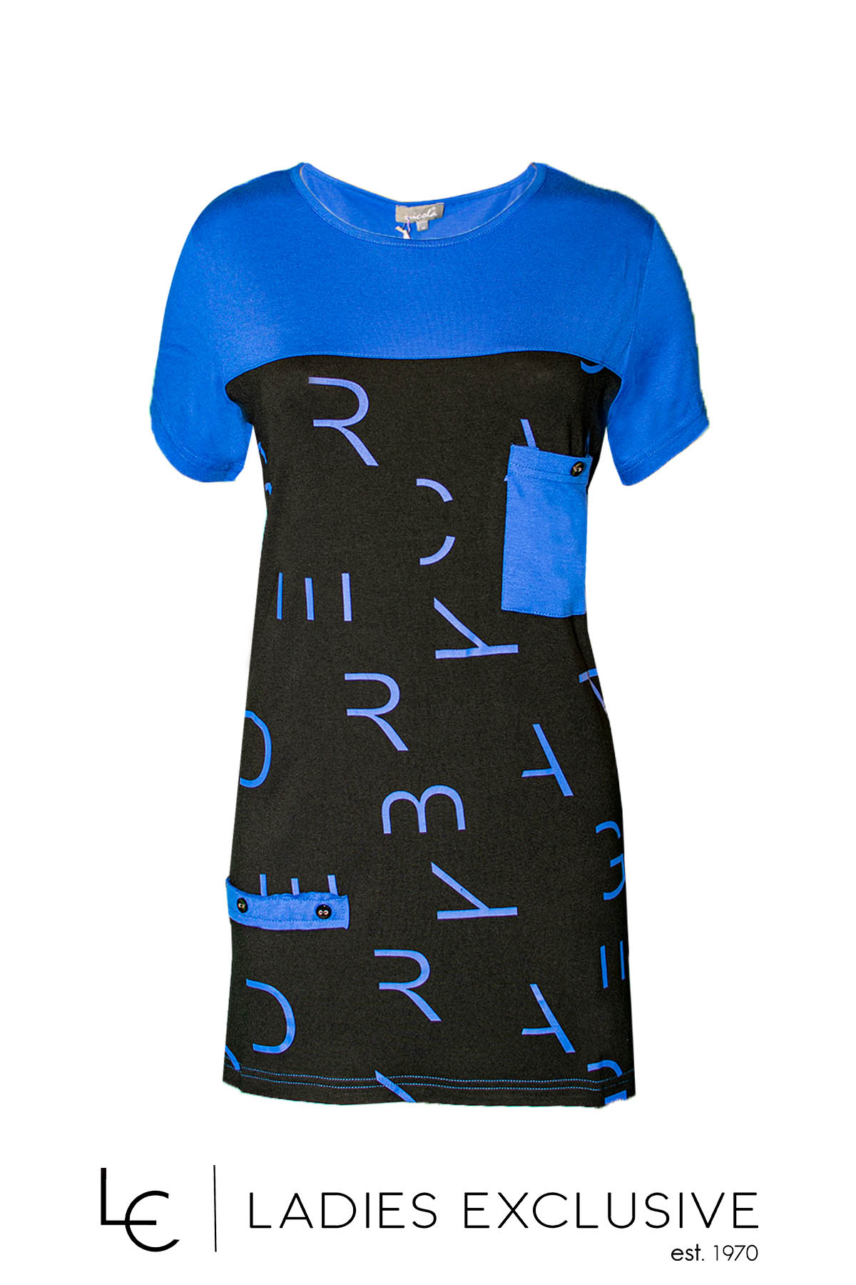 NICOLA Μπλούζα κοντομάνικη ελαφρώς μακριά σε χρώματα μπλε ρουά μαύρο, με διακοσμητικές τσέπες στο μπροστινό μέρος.