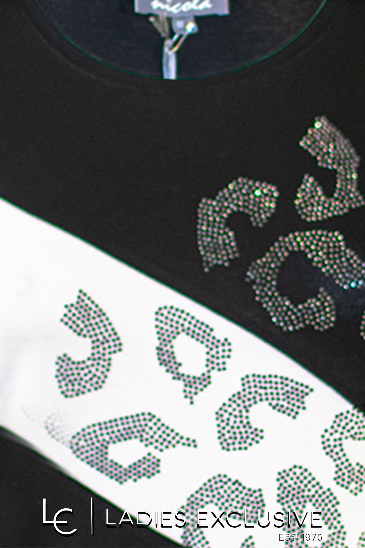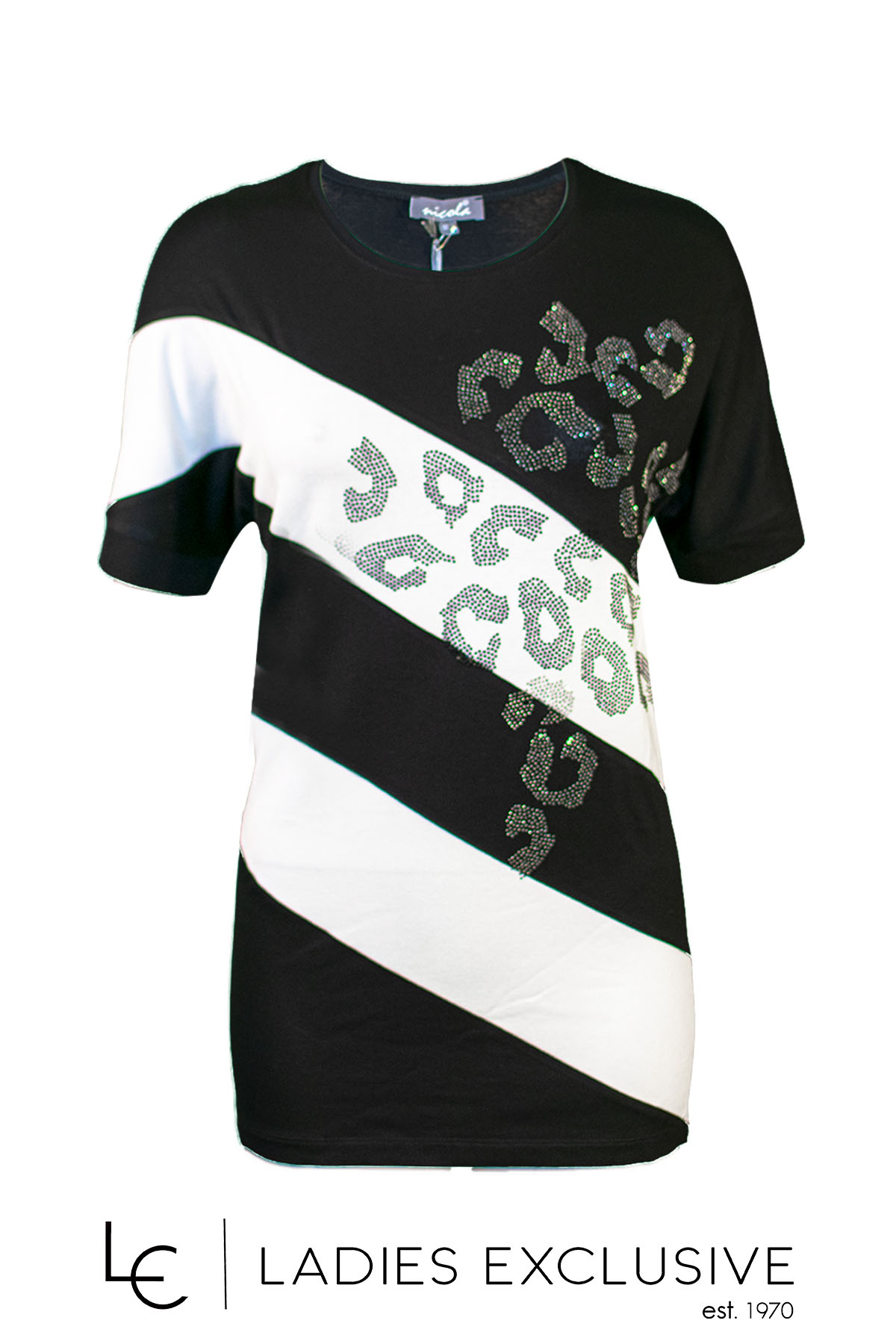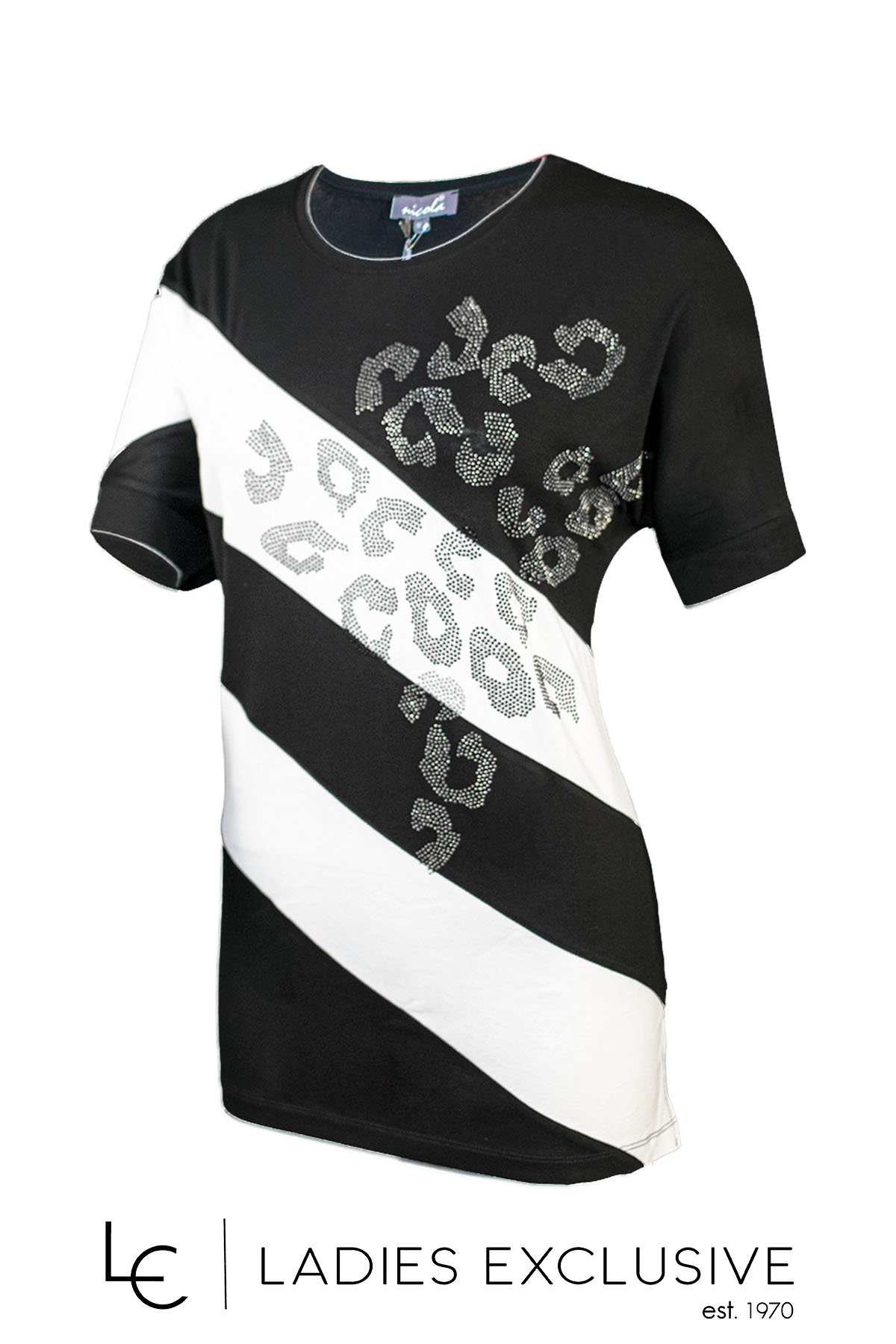 NICOLA Μπλούζα κοντομάνικη ασπρόμαυρη με πλάγιες μεγάλες ρίγες και στρας.