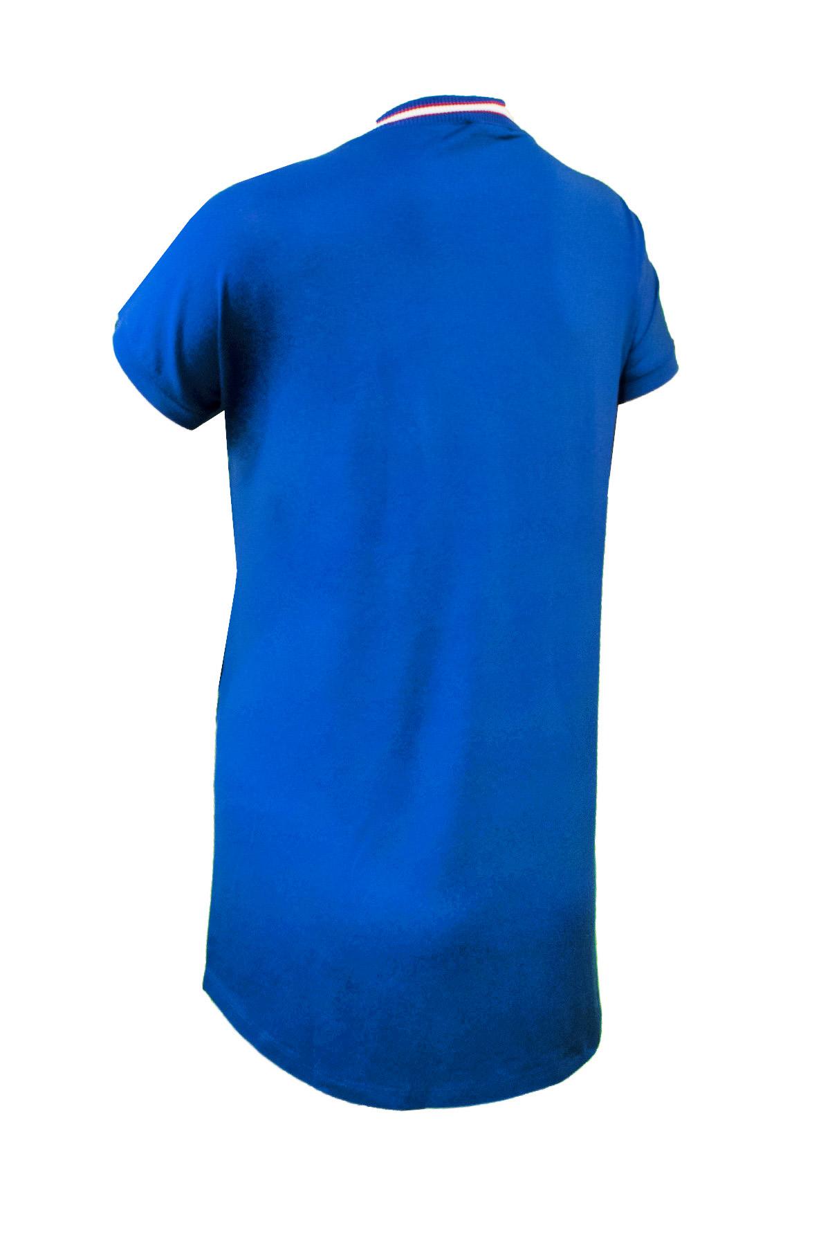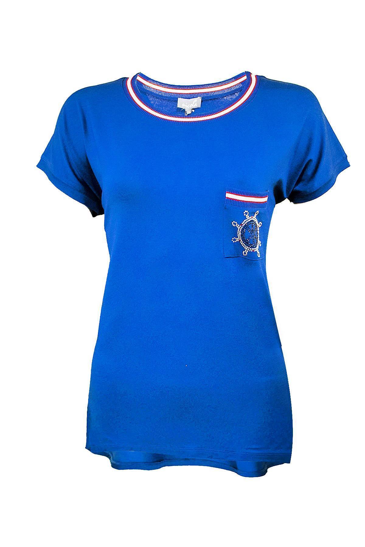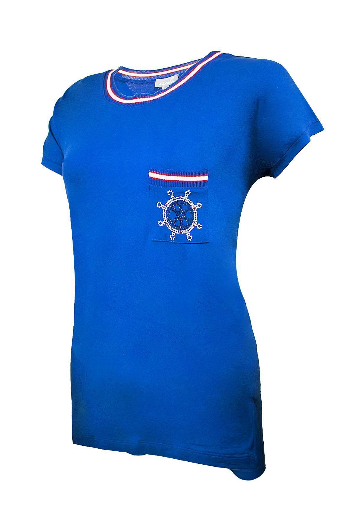 NICOLA Μπλούζα σε ναυτικό στυλ με κοντό μανίκι χωρίς μανικοκόλληση, τσεπάκι διακοσμημένο με στρας και ριγέ λεπτομέρειες. Είναι ασύμμετρη, πιο μακριά στο πίσω μέρος.