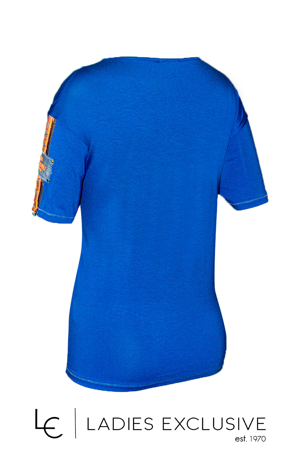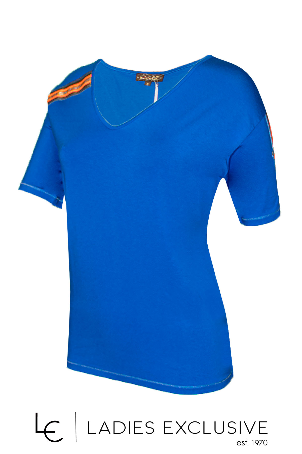 NICOLA Μπλούζα κοντομάνικη μπλε ρουά με άνοιγμα v και χρωματιστές λεπτομέρειες στο μανίκι και μπροστά.