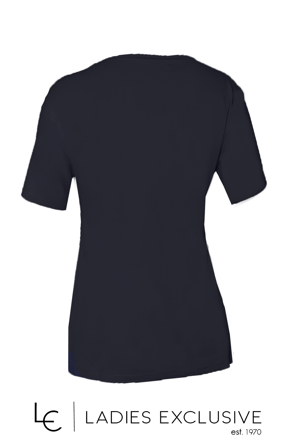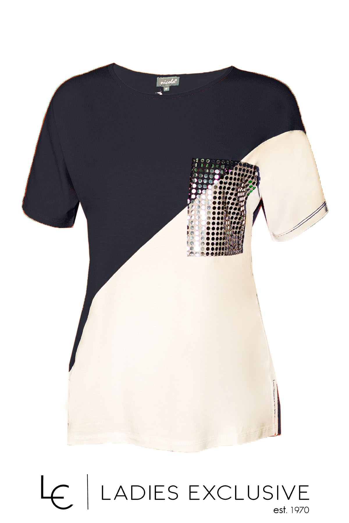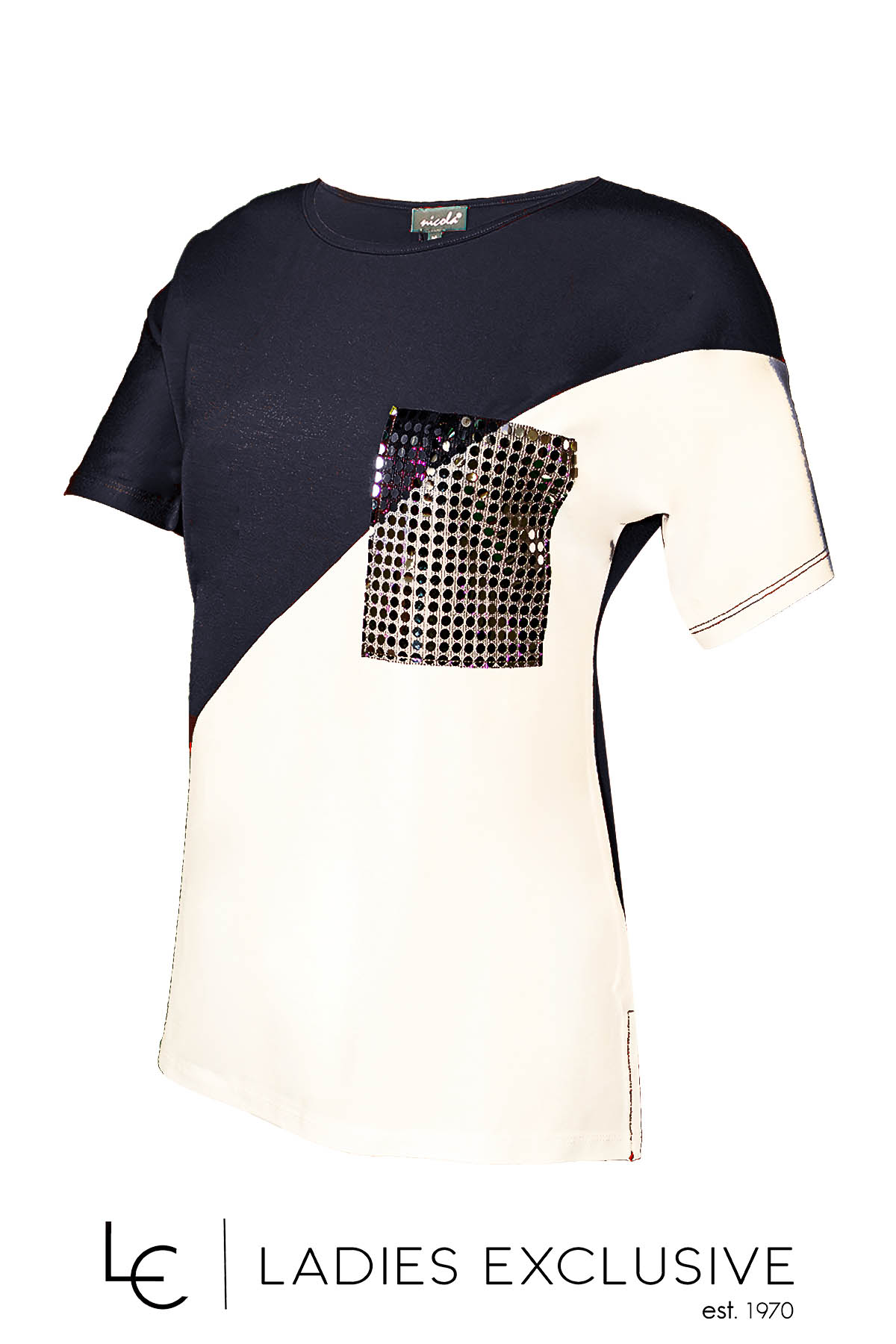 NICOLA Μπλούζα κοντομάνικη σε αποχρώσεις μπλε λευκό, με λαιμόκοψη και τσέπη με ασημένια λεπτομέρεια στο μπροστινό μέρος.