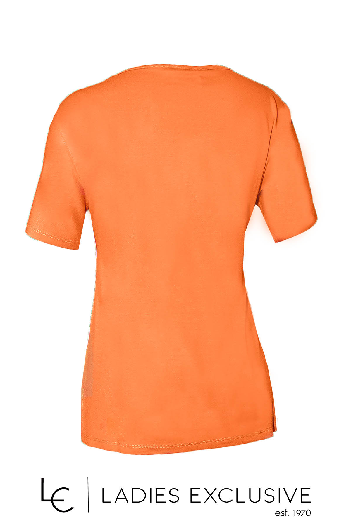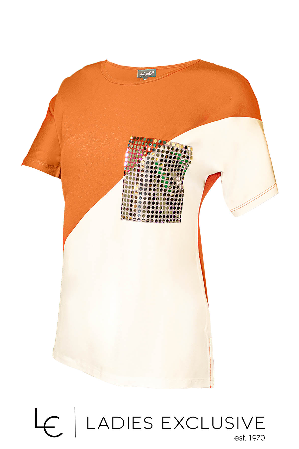 NICOLA Μπλούζα κοντομάνικη σε αποχρώσεις πορτοκαλί λευκό, με λαιμόκοψη και τσέπη με ασημένια λεπτομέρεια στο μπροστινό μέρος.