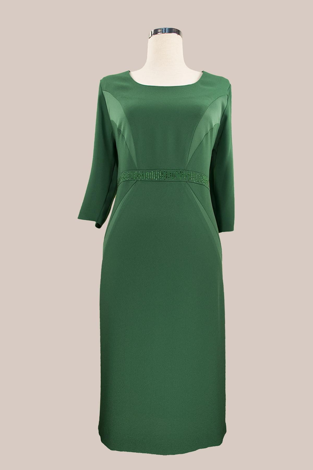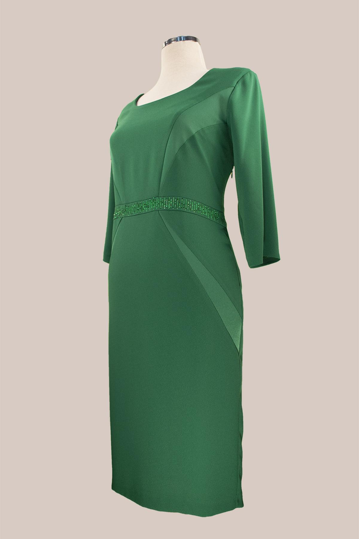 VETO Φόρεμα κρεπ ελαστικό με μανίκι 3/4 ως το γόνατο, με σατέν λεπτομέρειες και οριζόντια λεπτή φάσα με στρας κάτω από το στήθος.