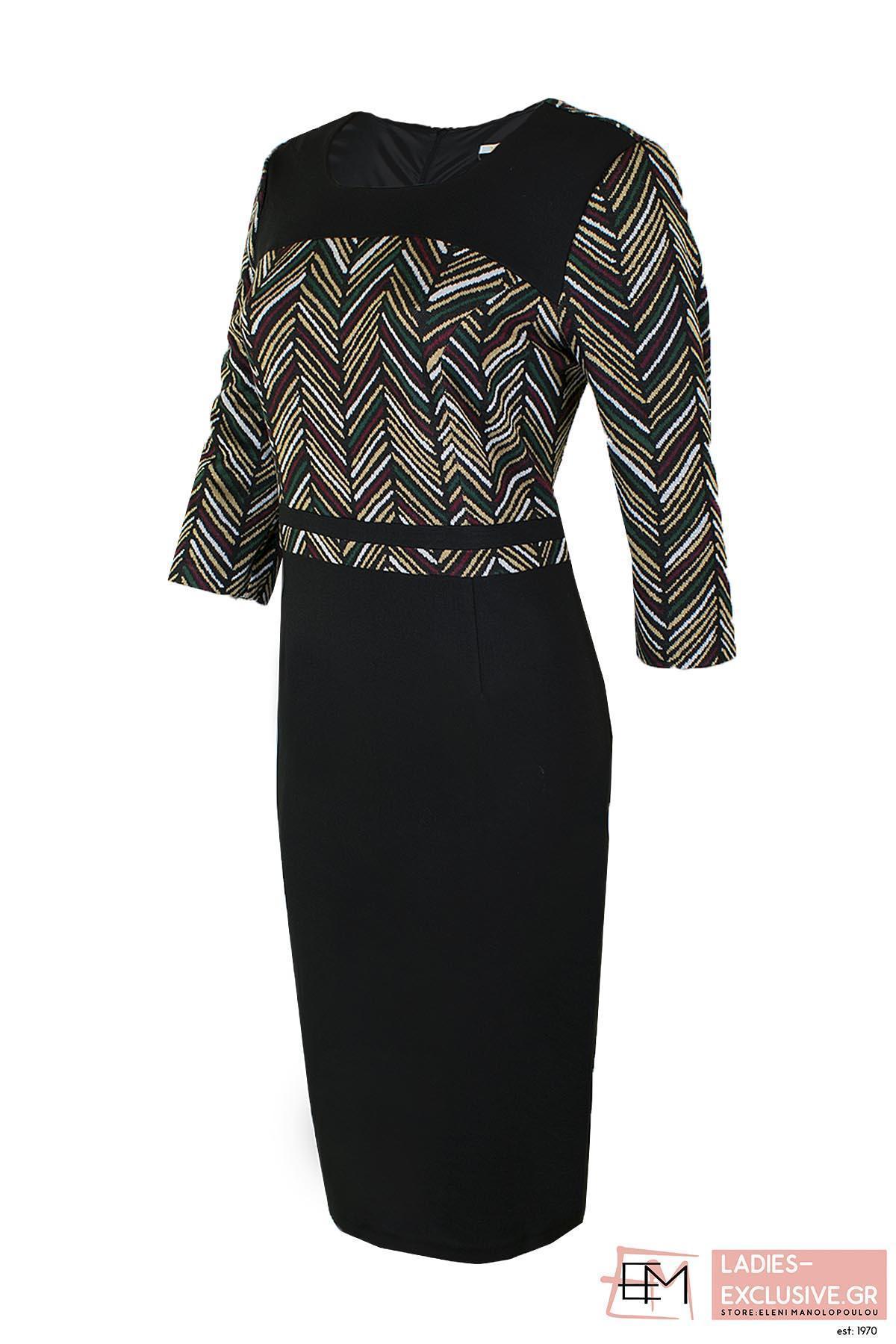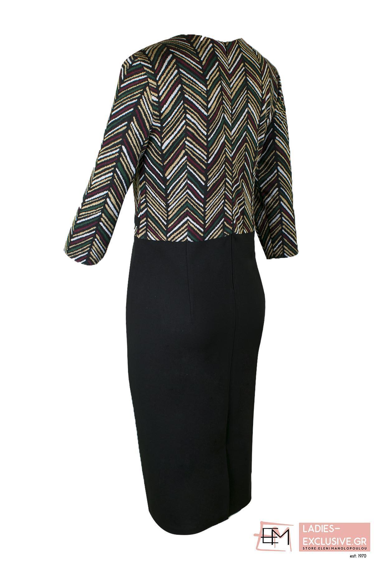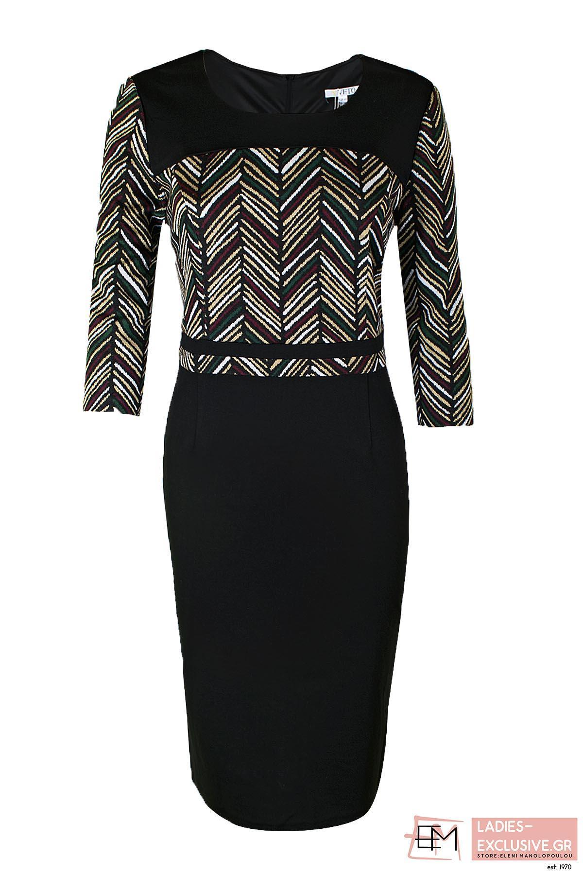 VETO Φόρεμα μαύρο σε ίσια γραμμή με εμπριμέ σχέδιο στο μπροστινό μέρος και μανίκι 3/4.
