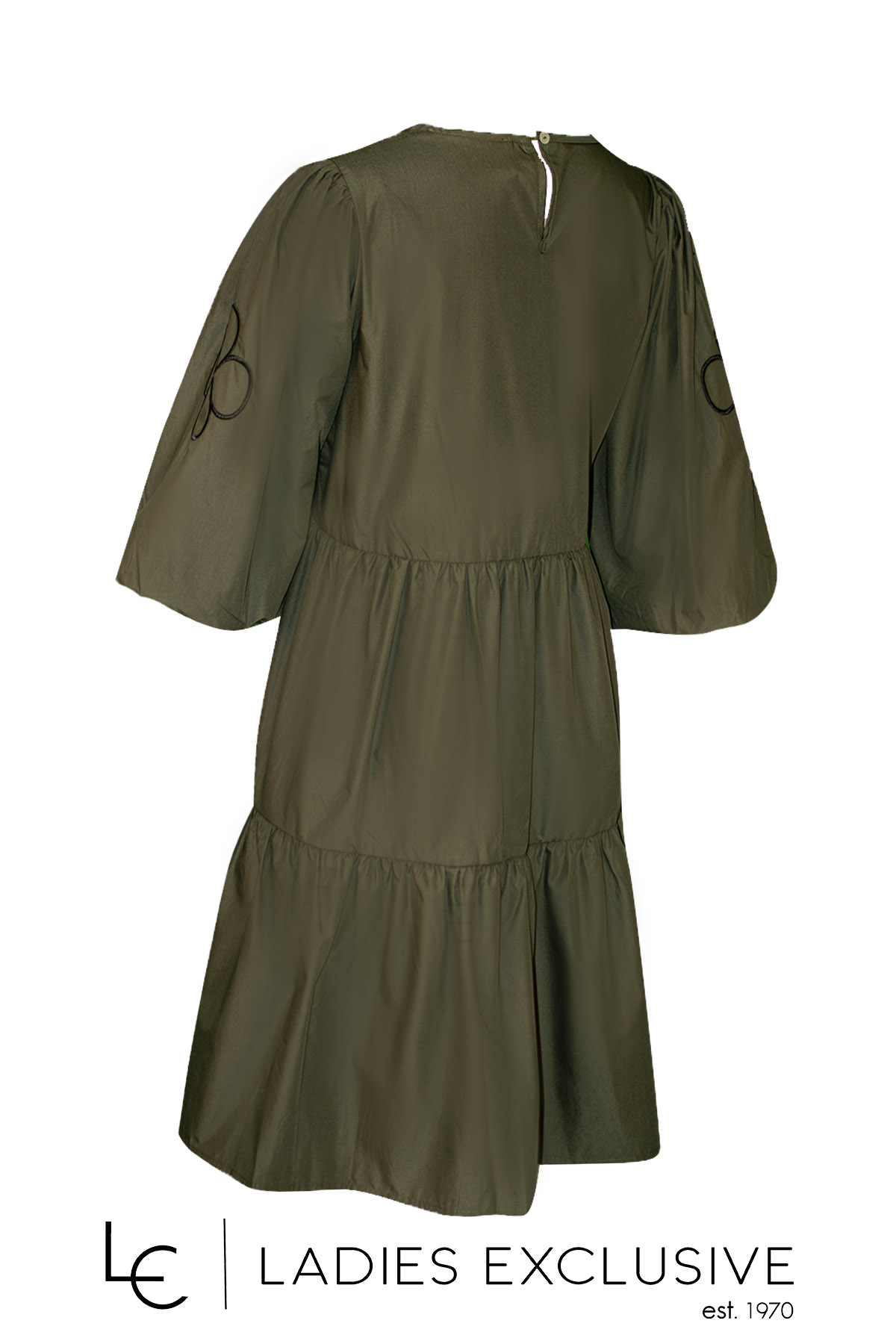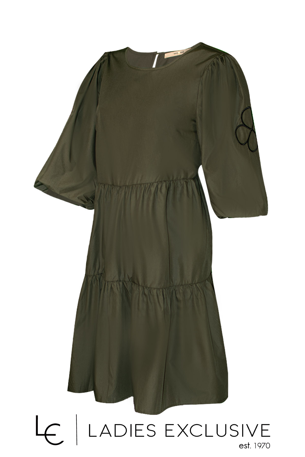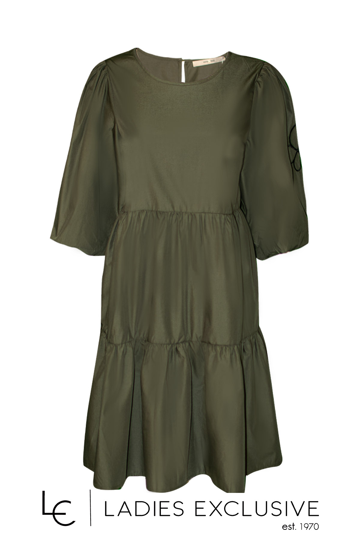COSTA MANI Φόρεμα χακί κοντομάνικο με μανίκι φούσκα με λάστιχο και δυο σειρές βολάν στο κάτω μέρος. Έχει άνετη γραμμή.