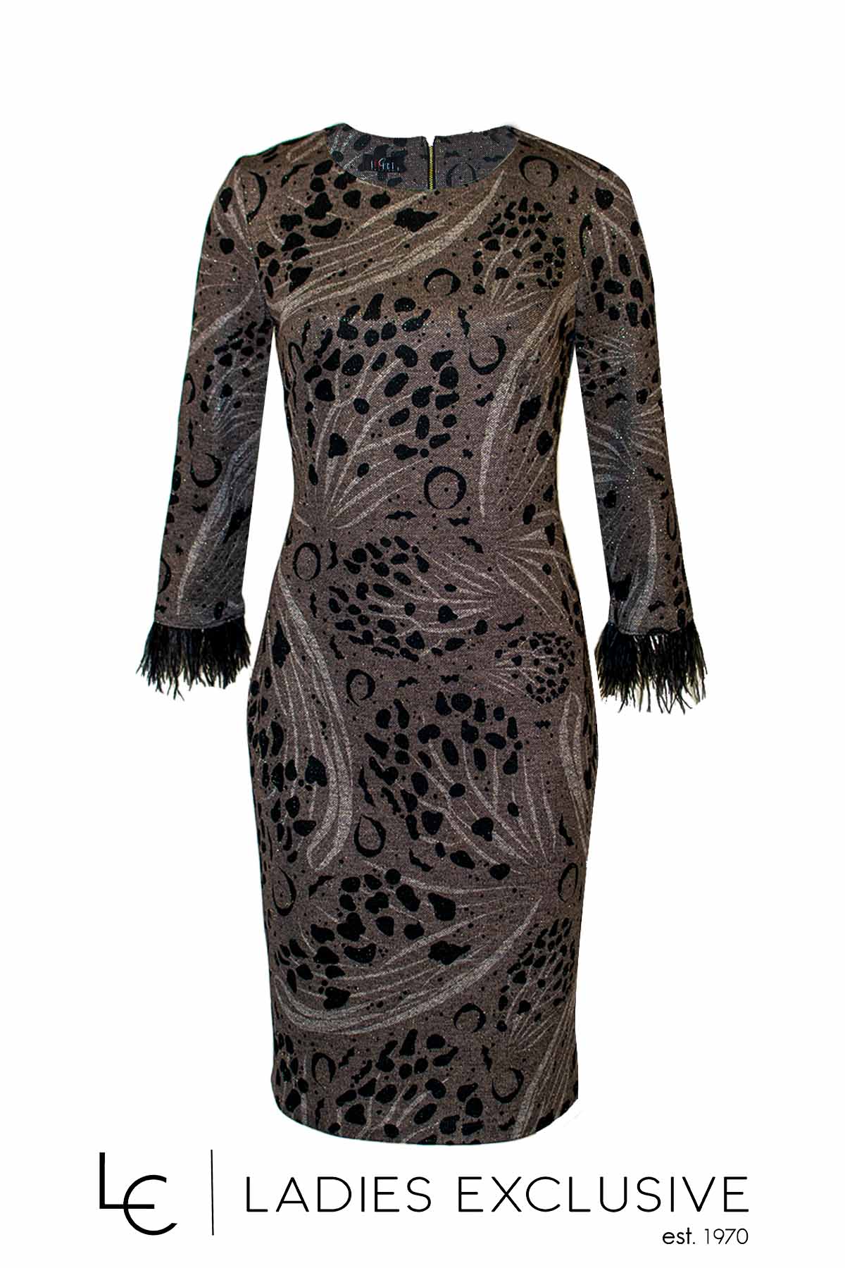 EFFECT Φόρεμα animal print με χρυσοκλωστή στην ύφανση και μανίκι 3/4 με τελείωμα φτερό.