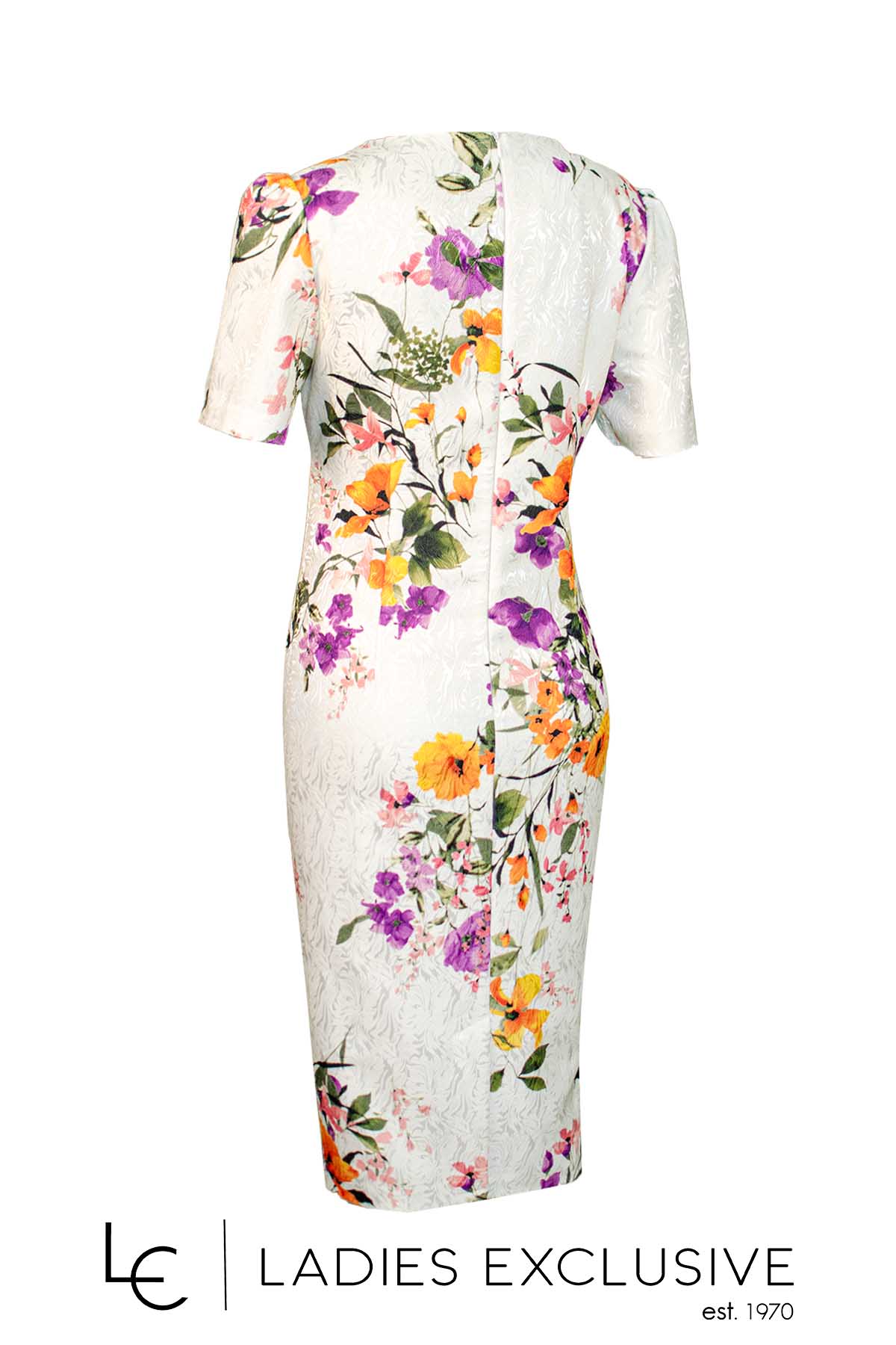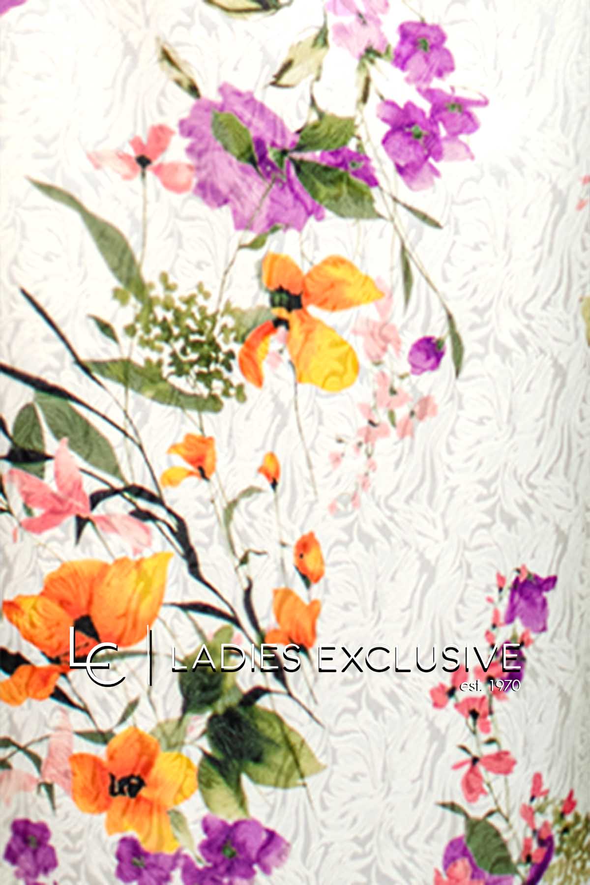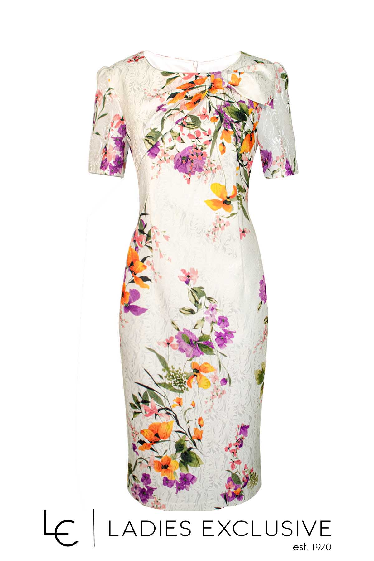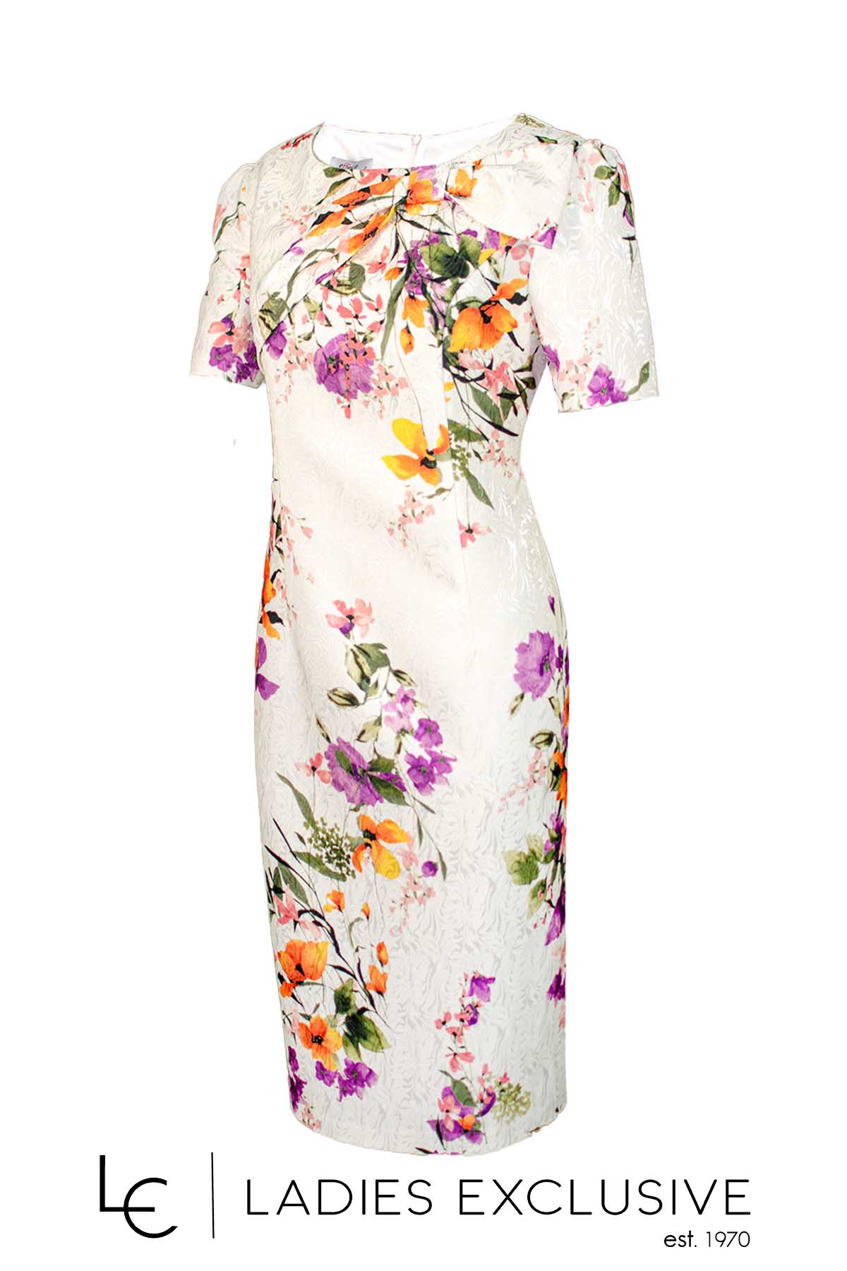 EFFECT Φόρεμα εκρού με πολύχρωμα φλοράλ κοντομάνικο με φιόγκο κάτω από τη λαιμόκοψη σε ίσια γραμμή.