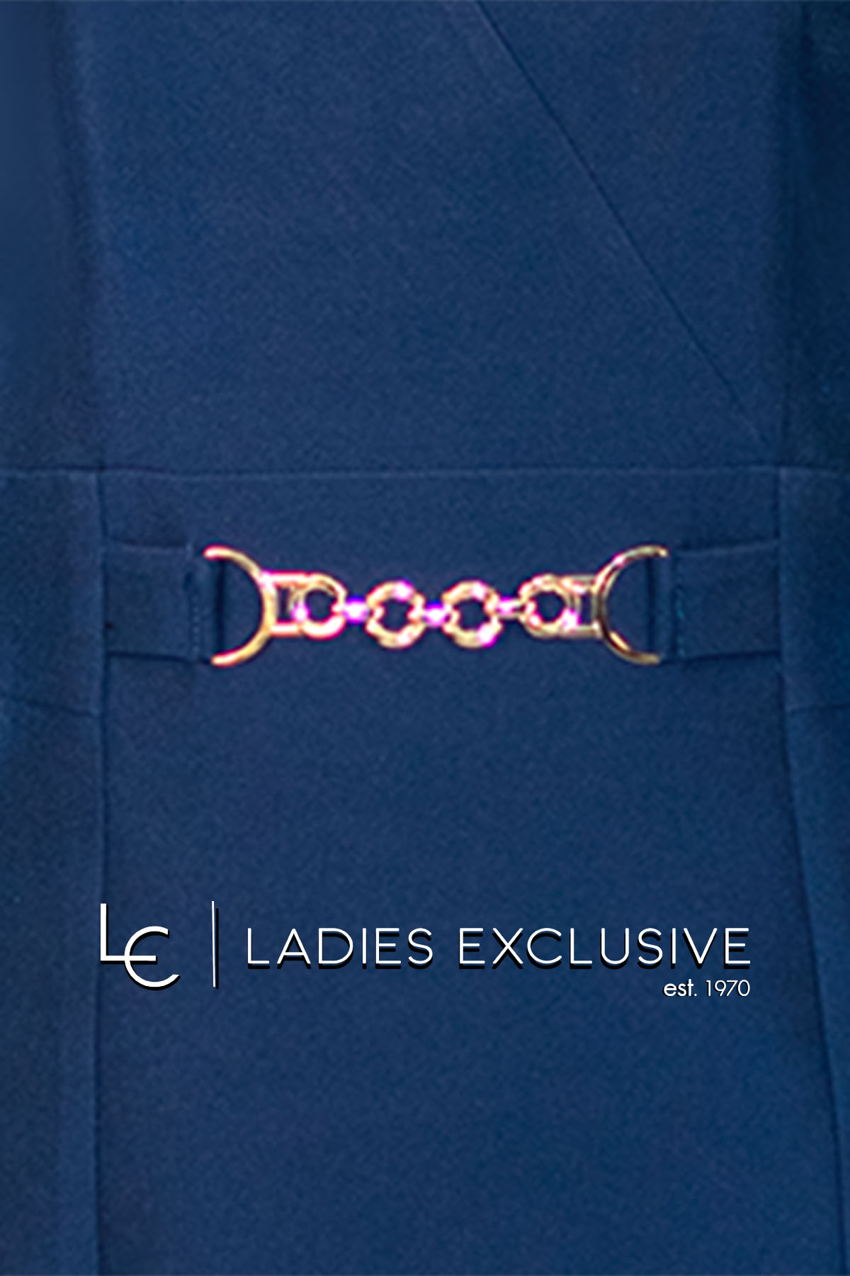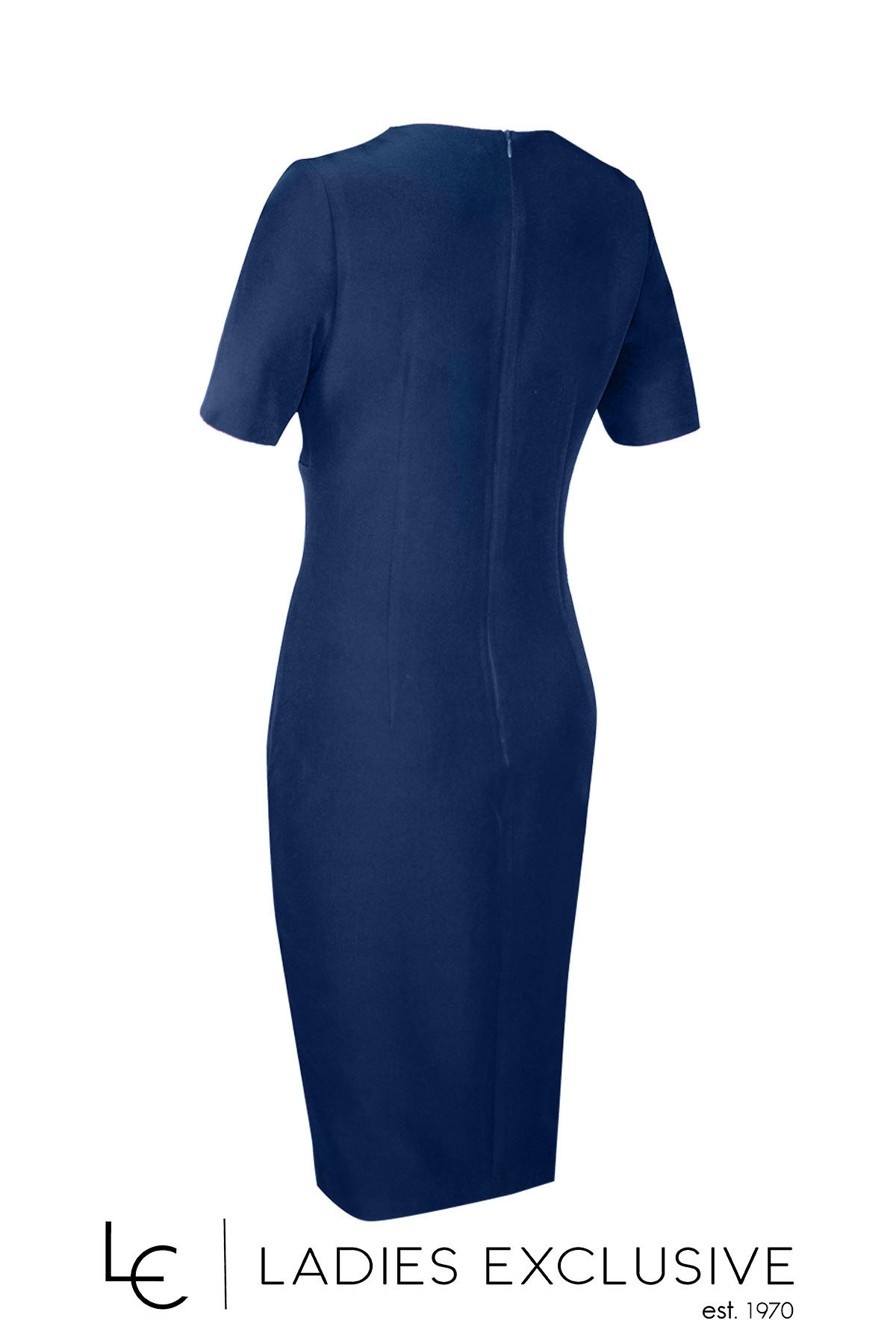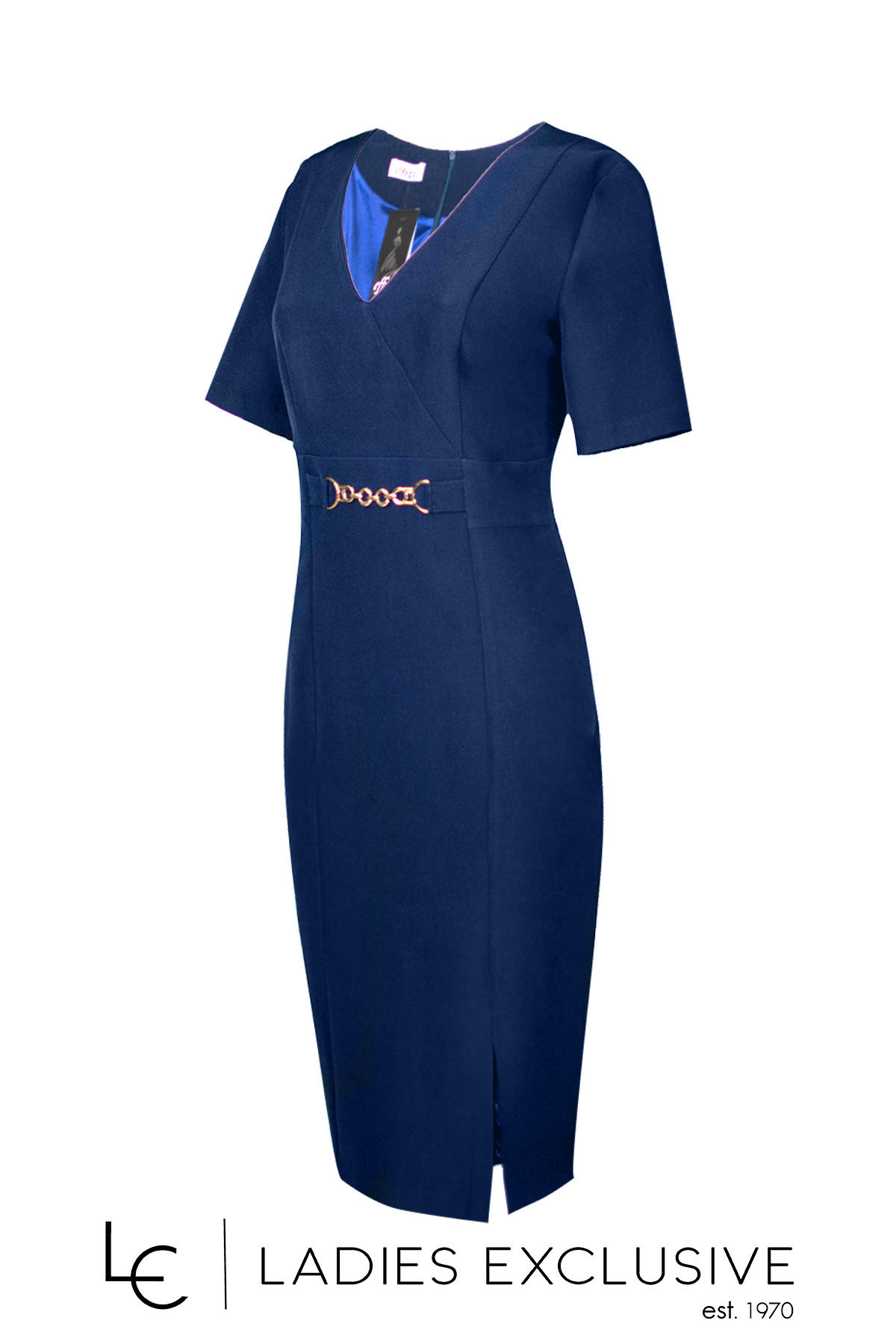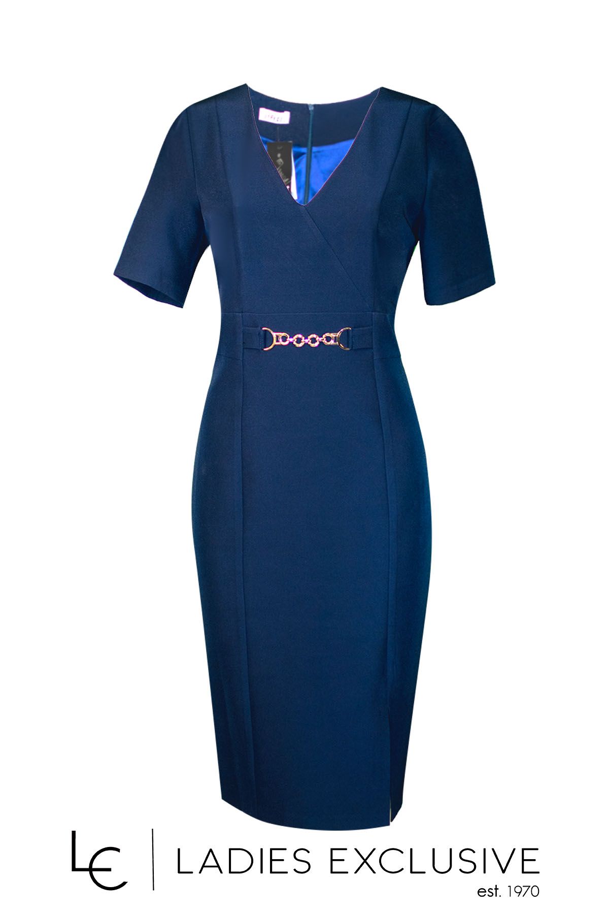 EFFECT Φόρεμα μπλε κρεπ κοντομάνικο σε ίσια γραμμή, με άνοιγμα v και χρυσή αγκράφα.