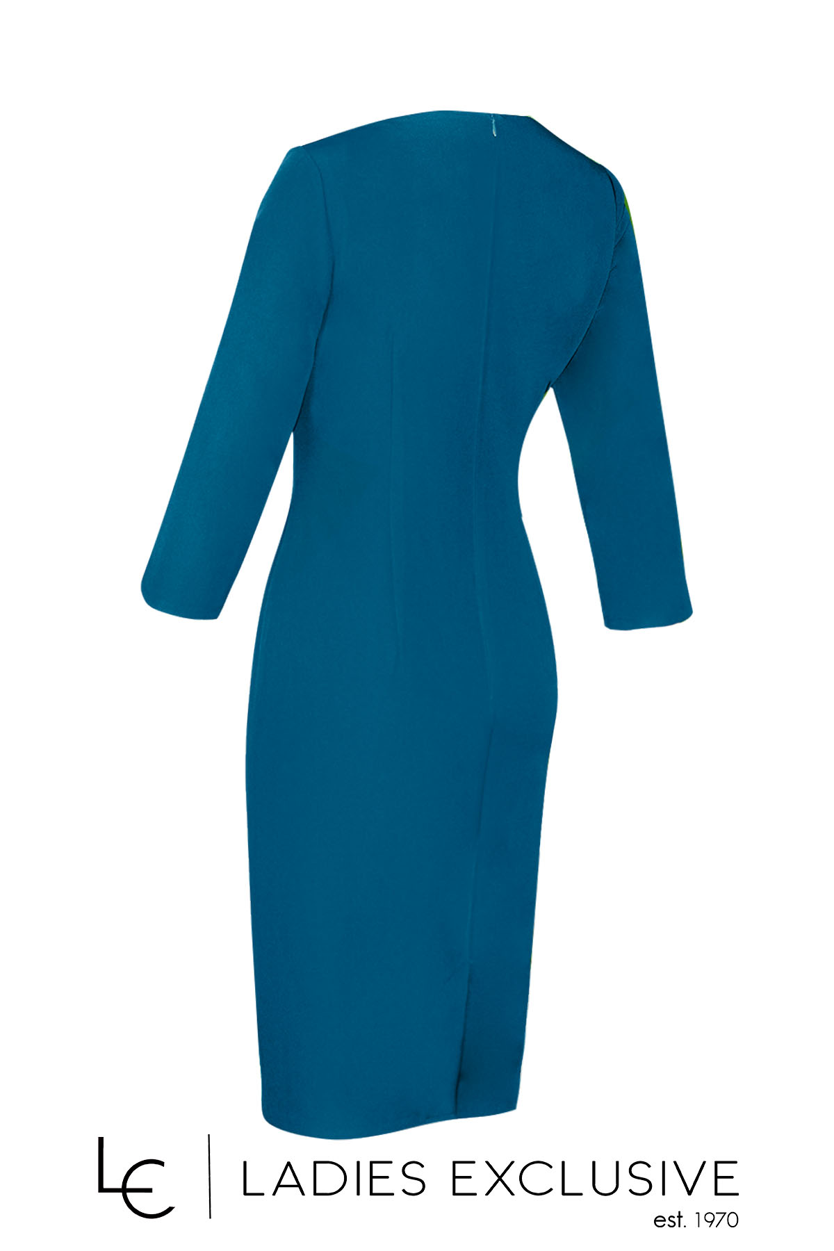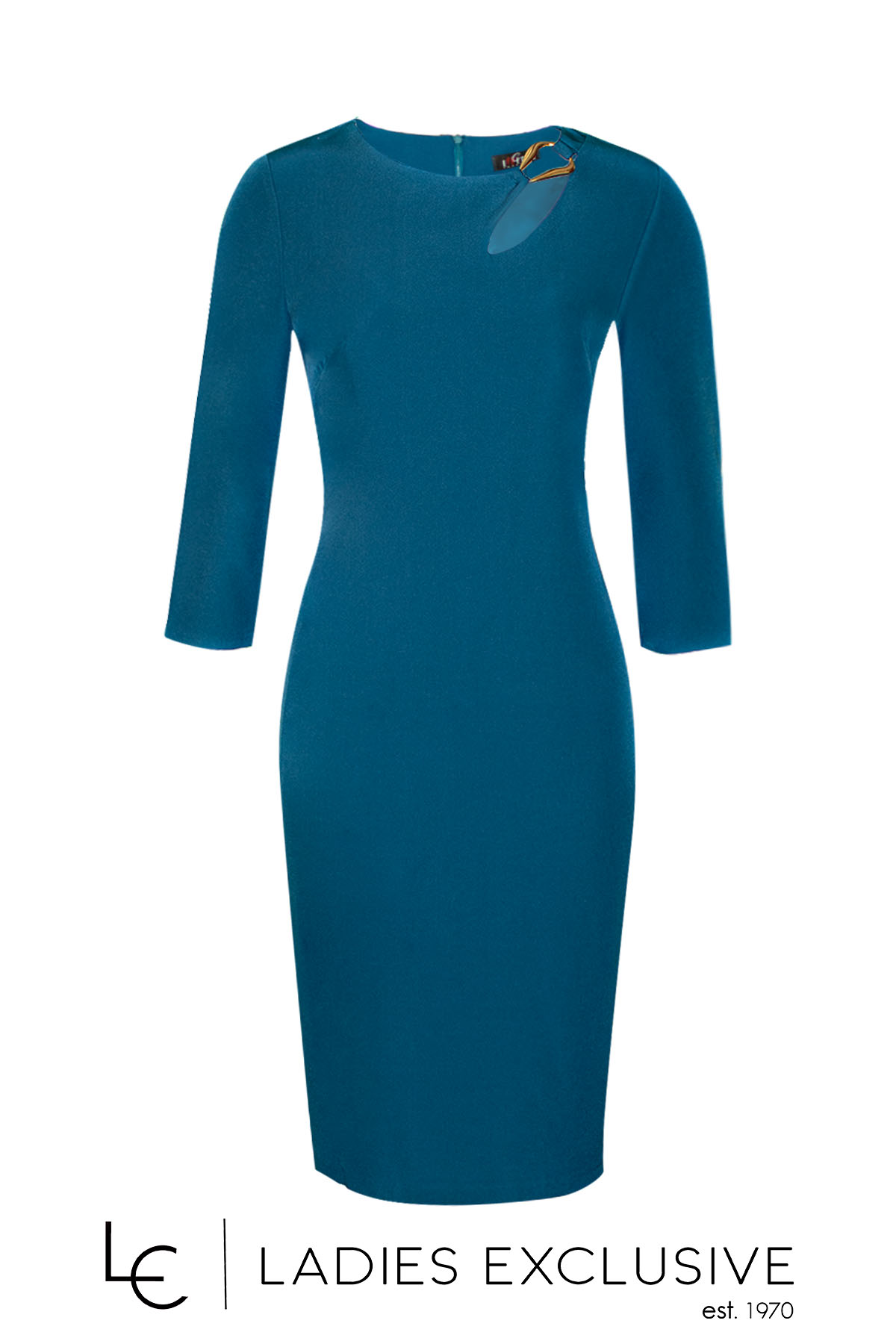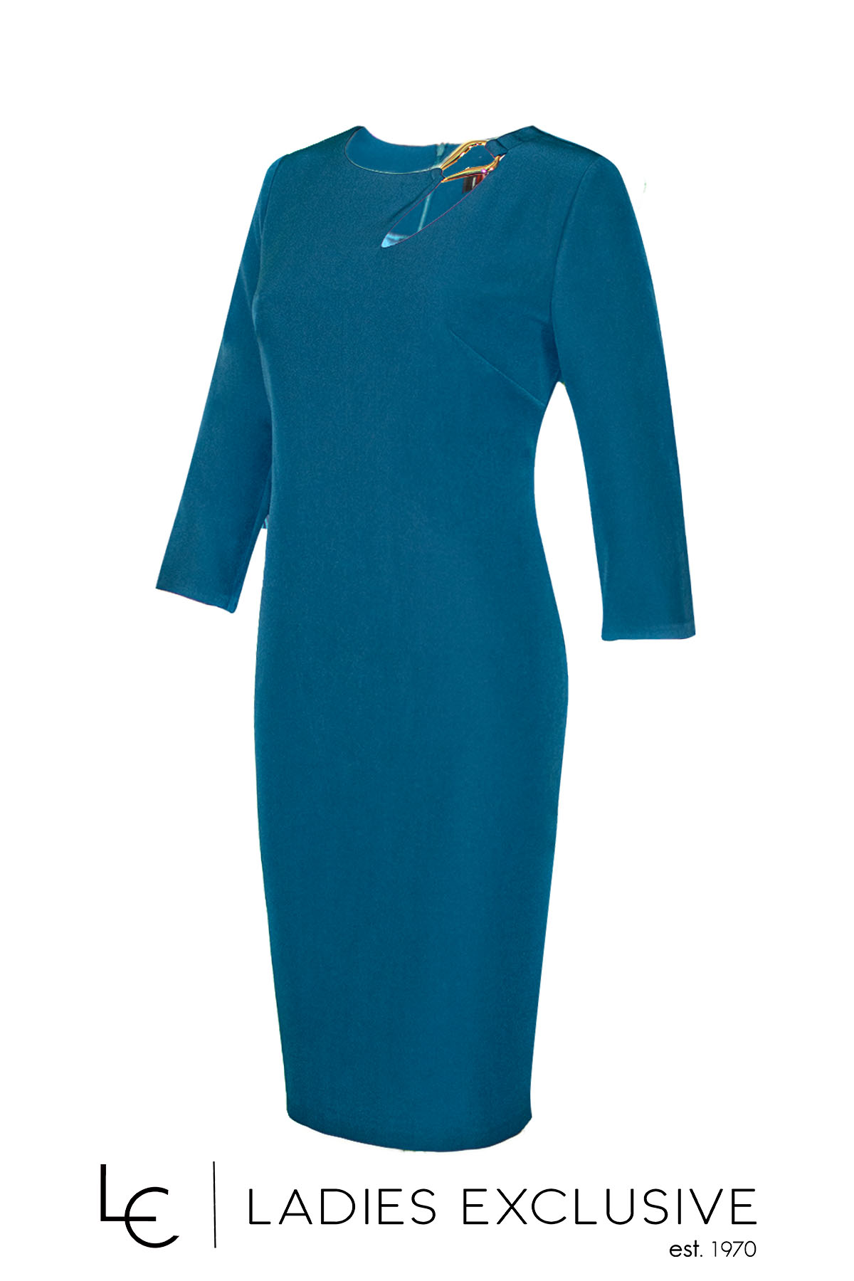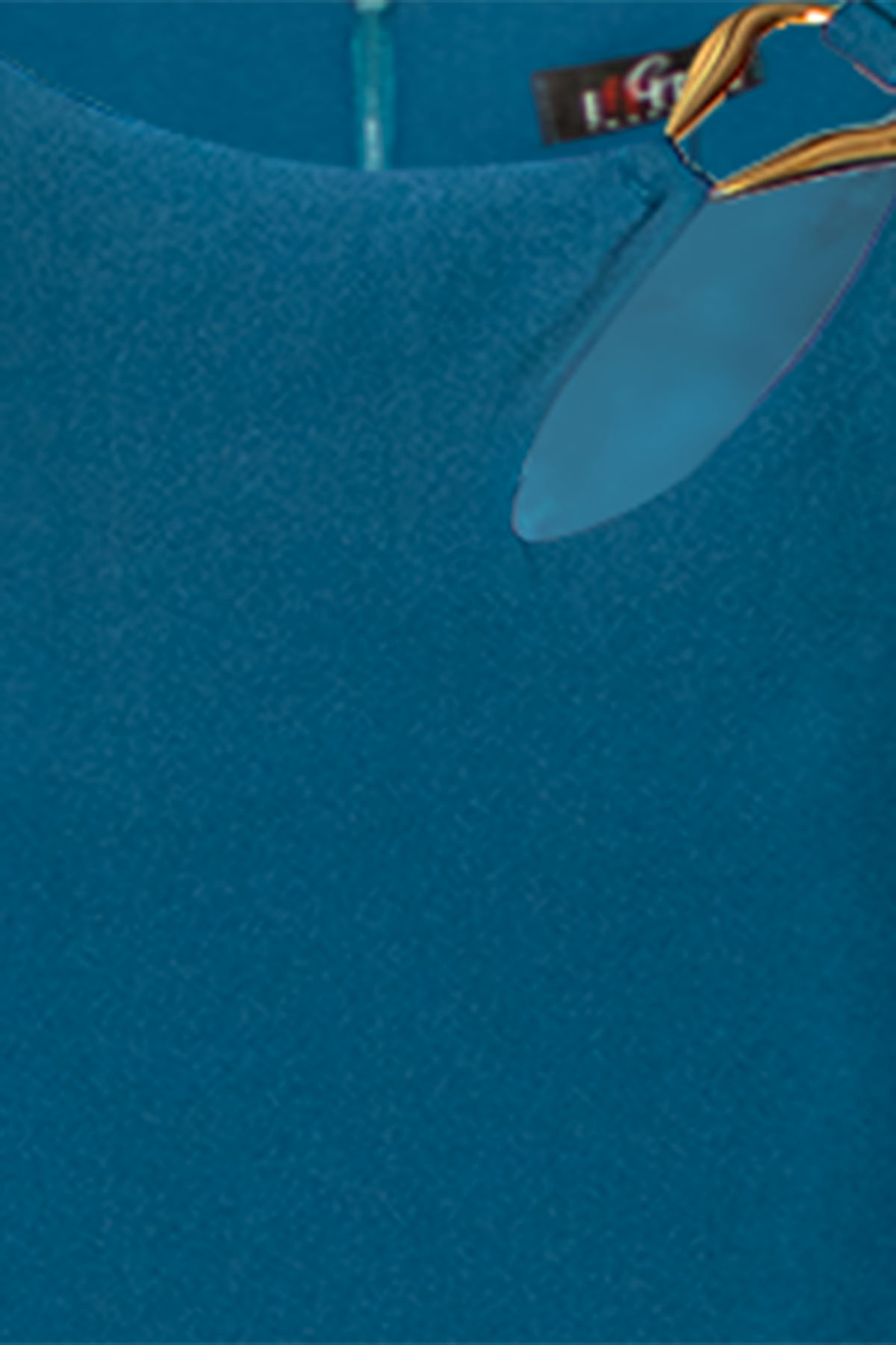 EFFECT Φόρεμα πετρόλ κρεπ με μανίκι 3/4 και ιδιαίτερο άνοιγμα με χρυσή αγκράφα στο μπροστινό μέρος.
