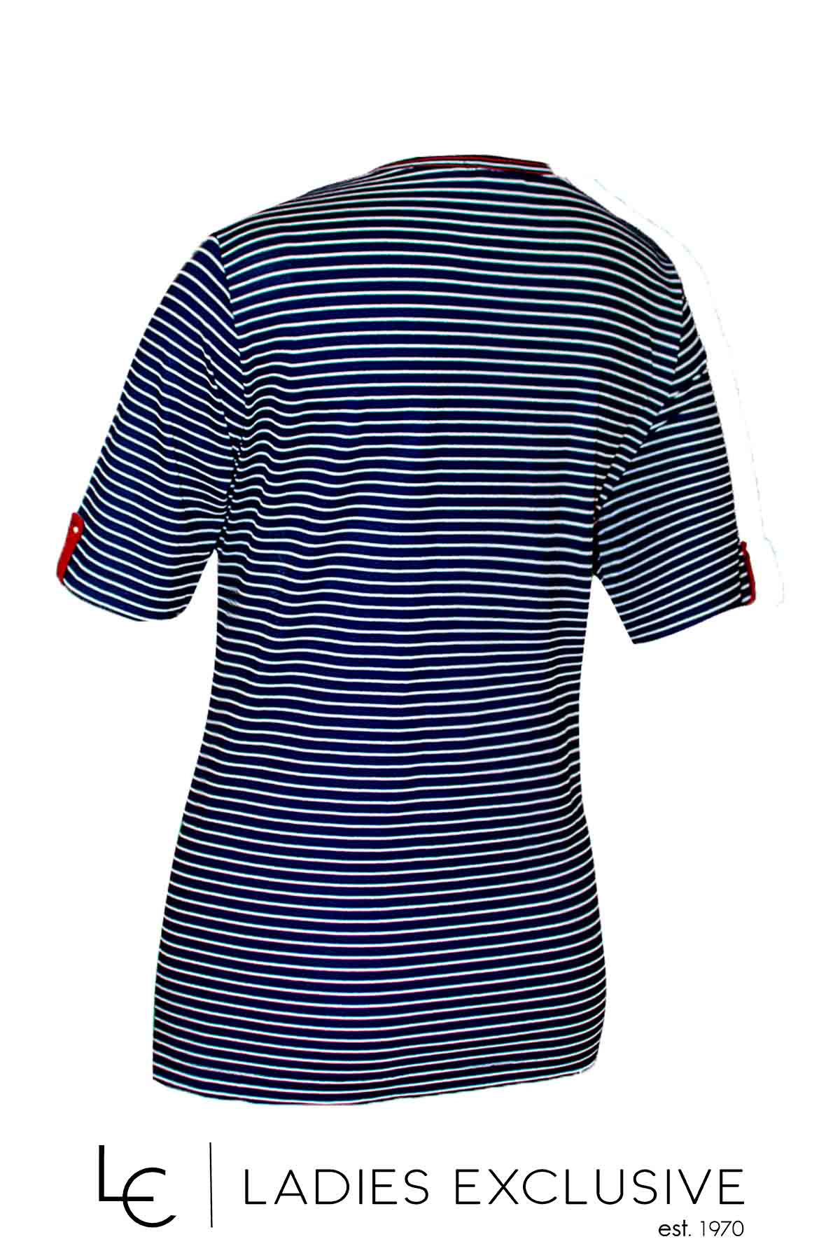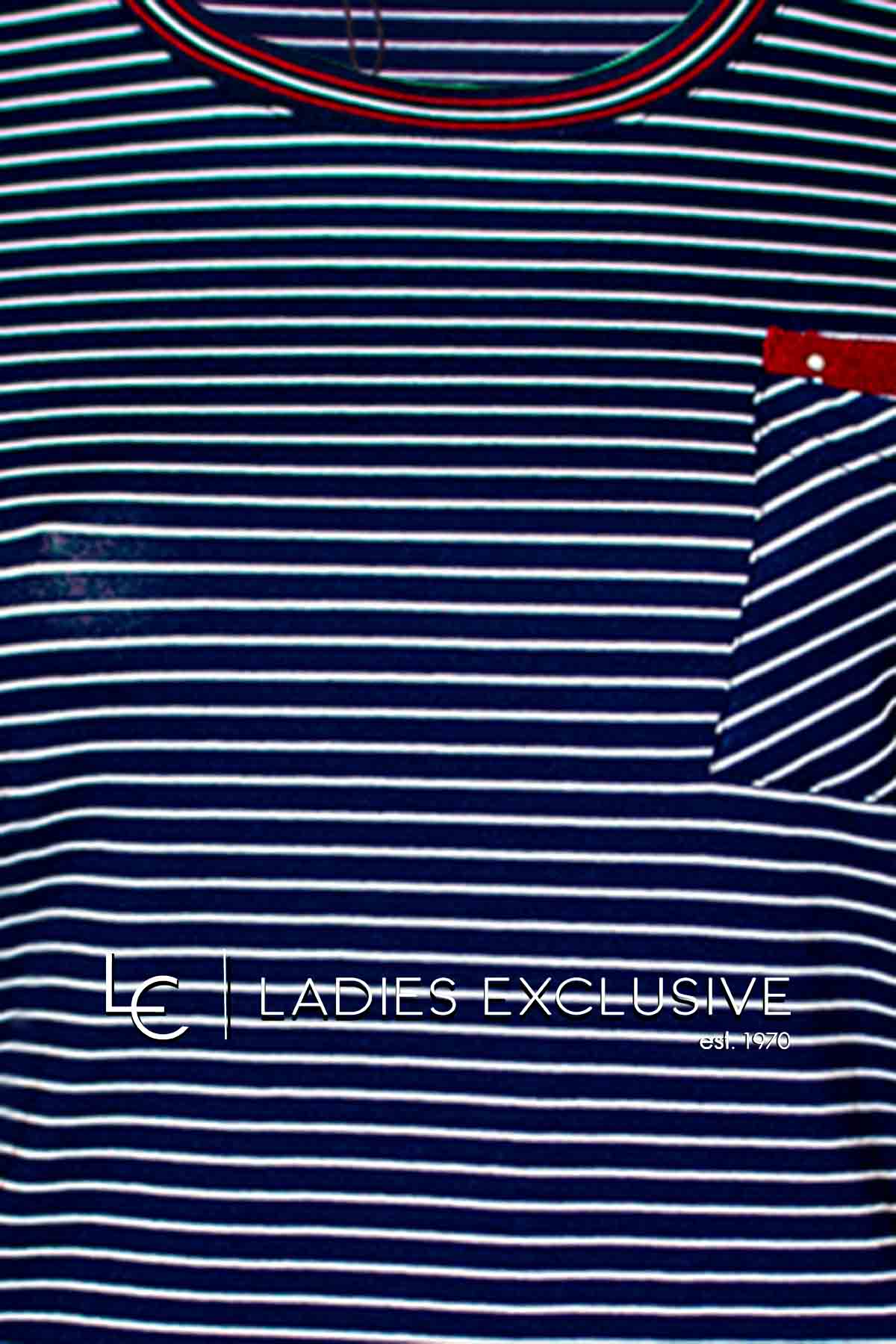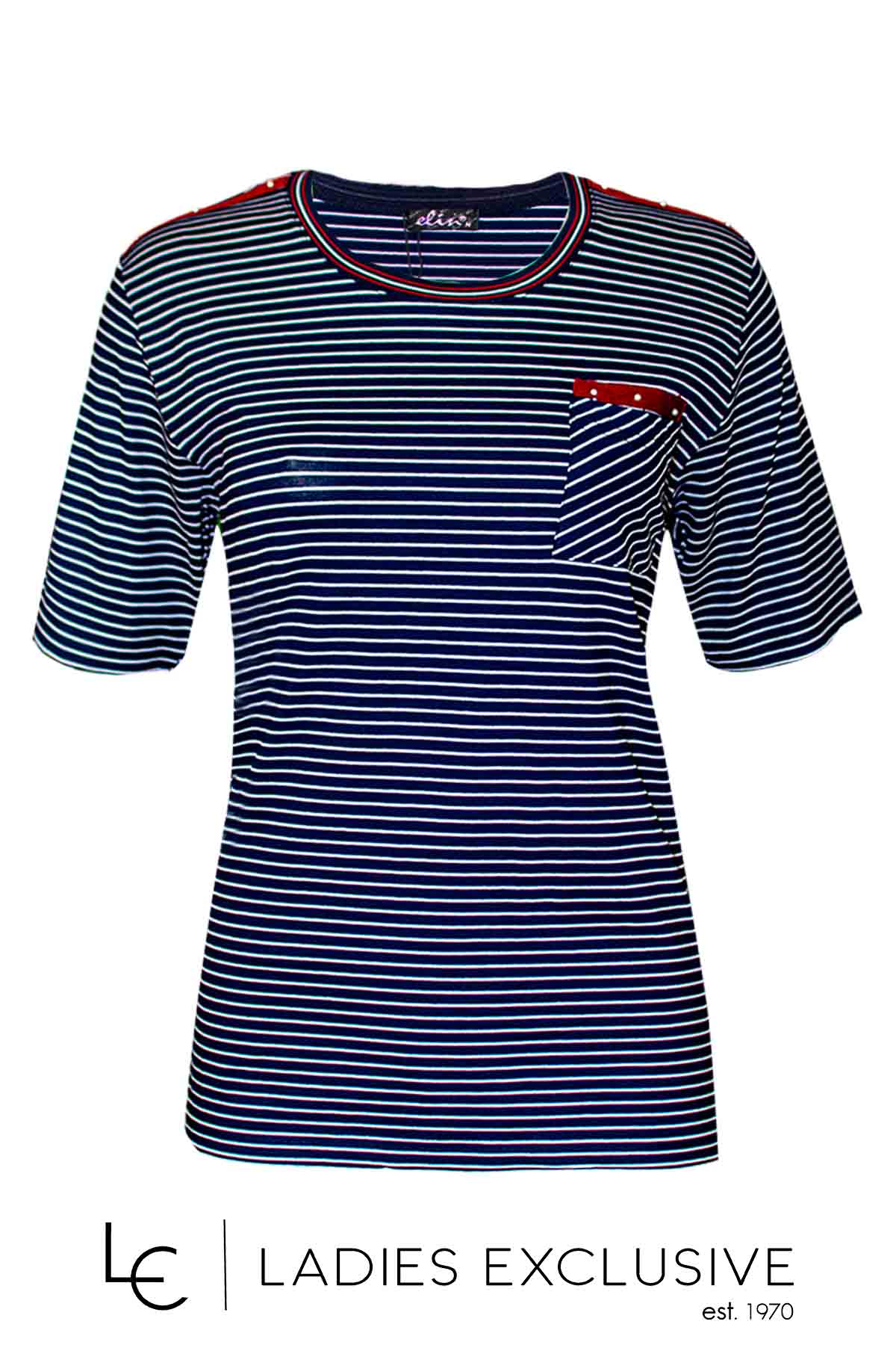 ELIN Μπλούζα άσπρη μπλε ριγέ κοντομάνικη με ελαστική λαιμόκοψη και μπορντώ λεπτομέρειες με μικρές πέρλες.