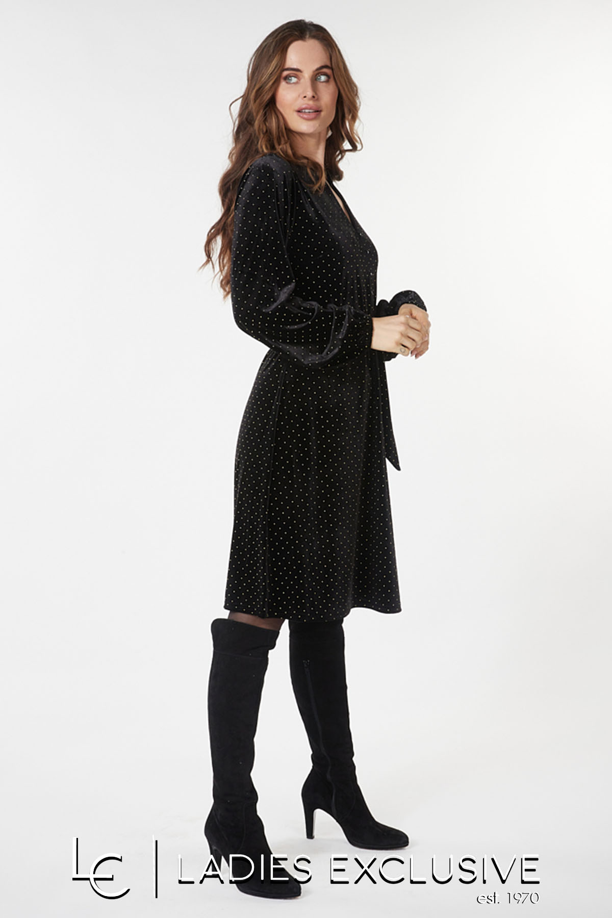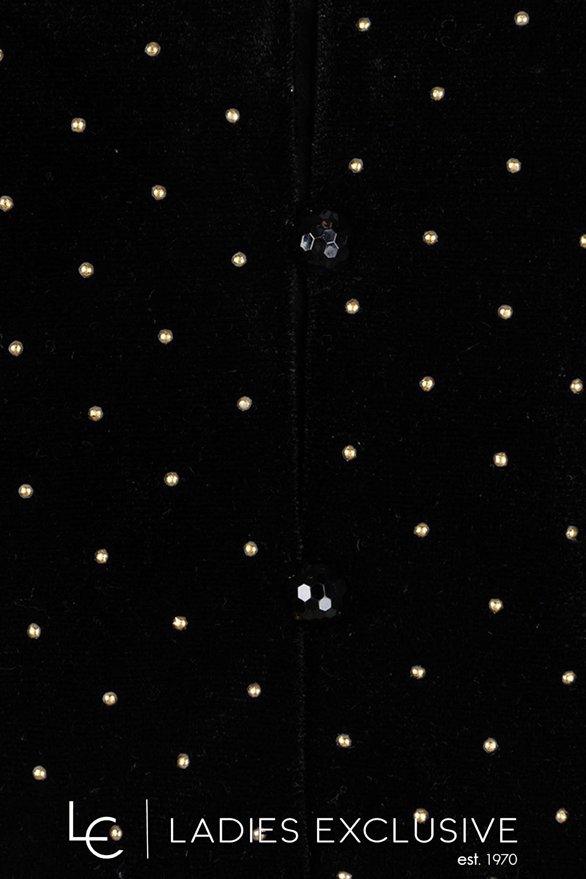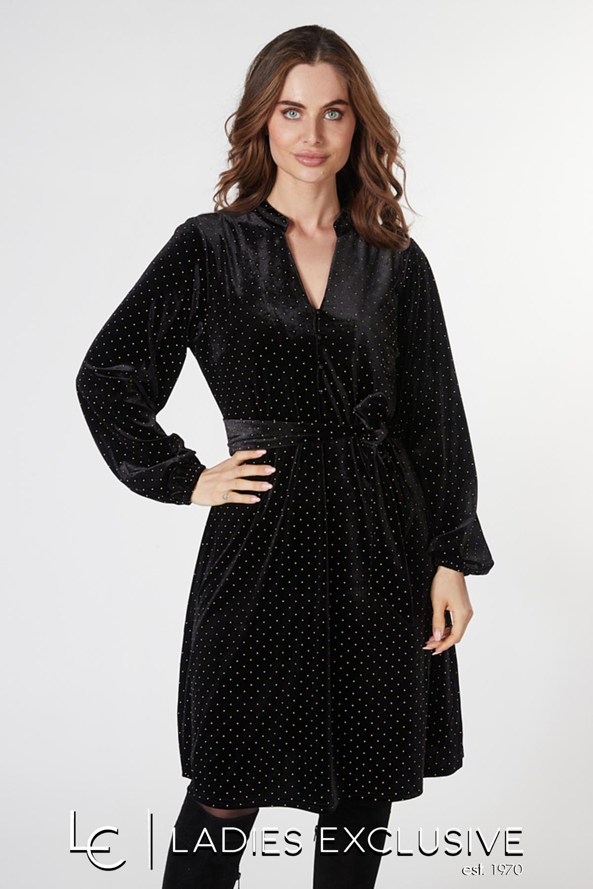 ESQUALO Φόρεμα μαύρο βελουτέ με χρυσά τρουκς σε γραμμή A, με ζώνη από το ίδιο ύφασμα.