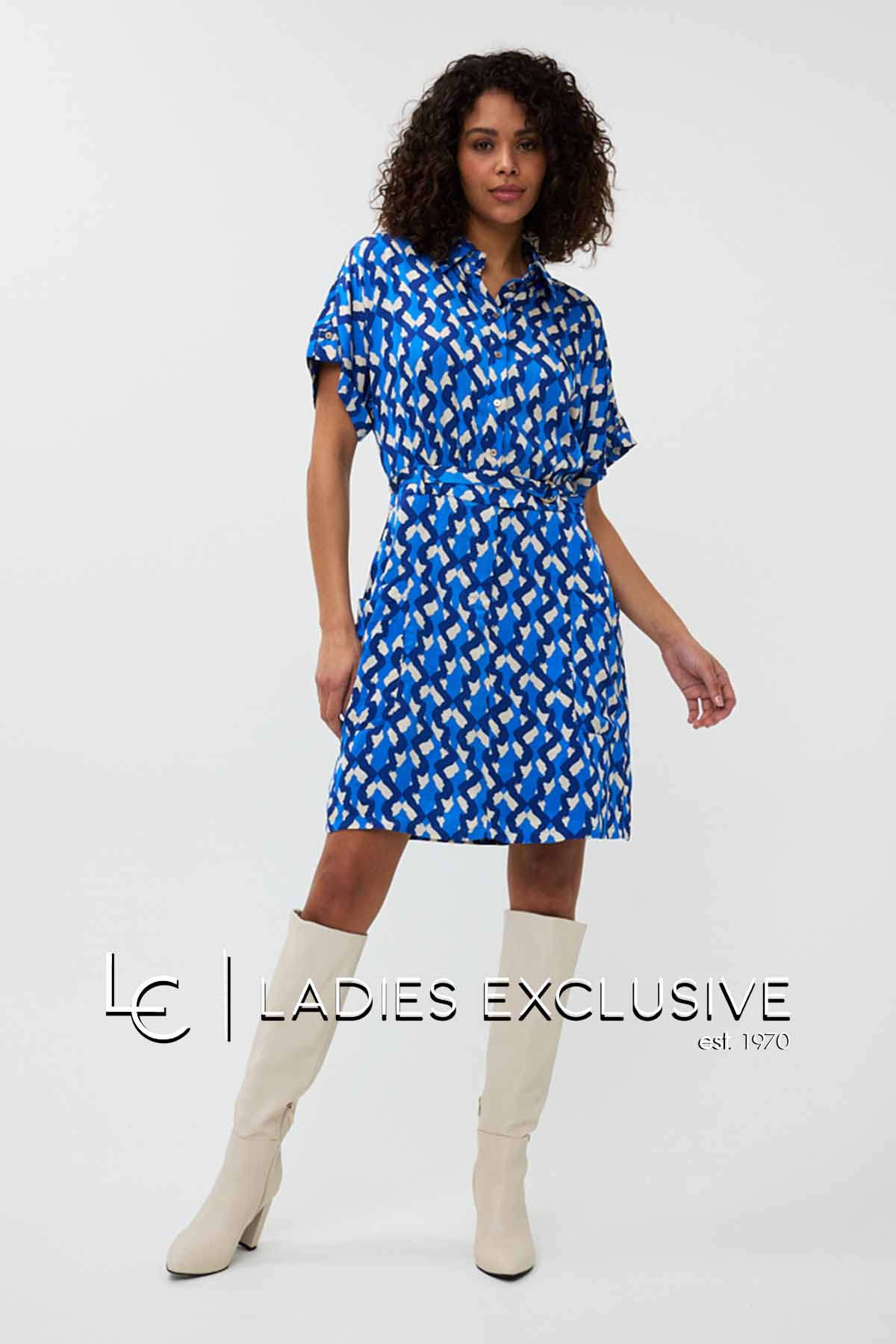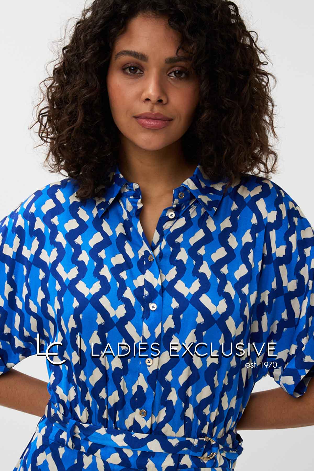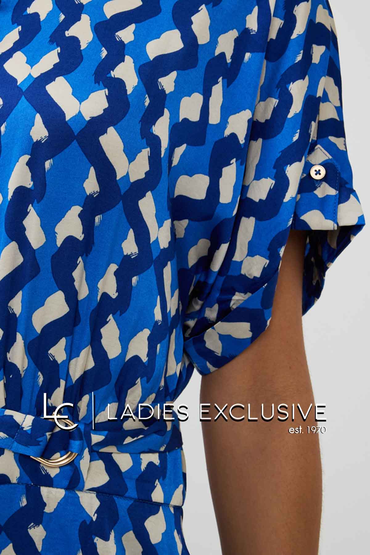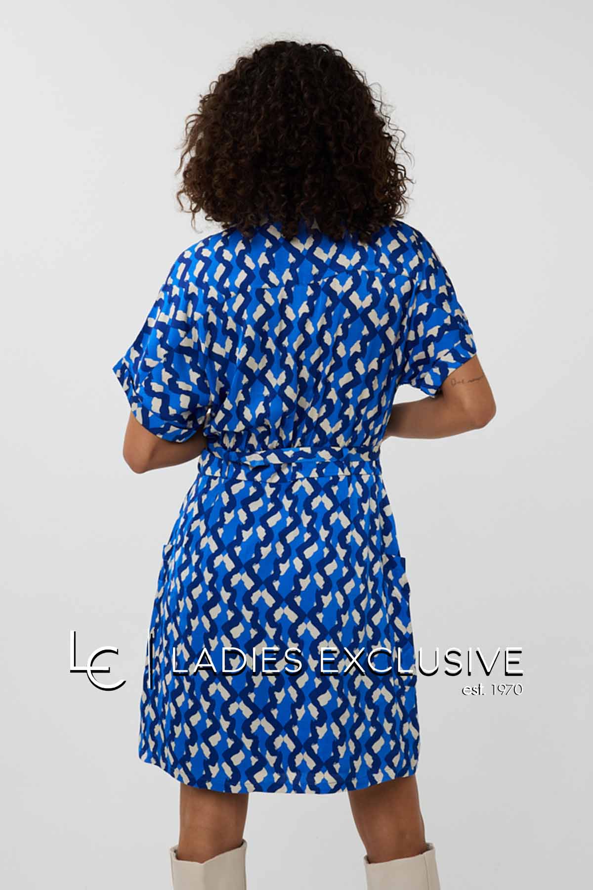 ESQUALO Φόρεμα μπλε με σιέλ και λευκά σχέδια κοντομάνικο σατέν, με κουμπιά στο μπροστινό μέρος και γιακά. Έχει ζώνη από το ίδιο ύφασμα και μεγάλες τσέπες.
