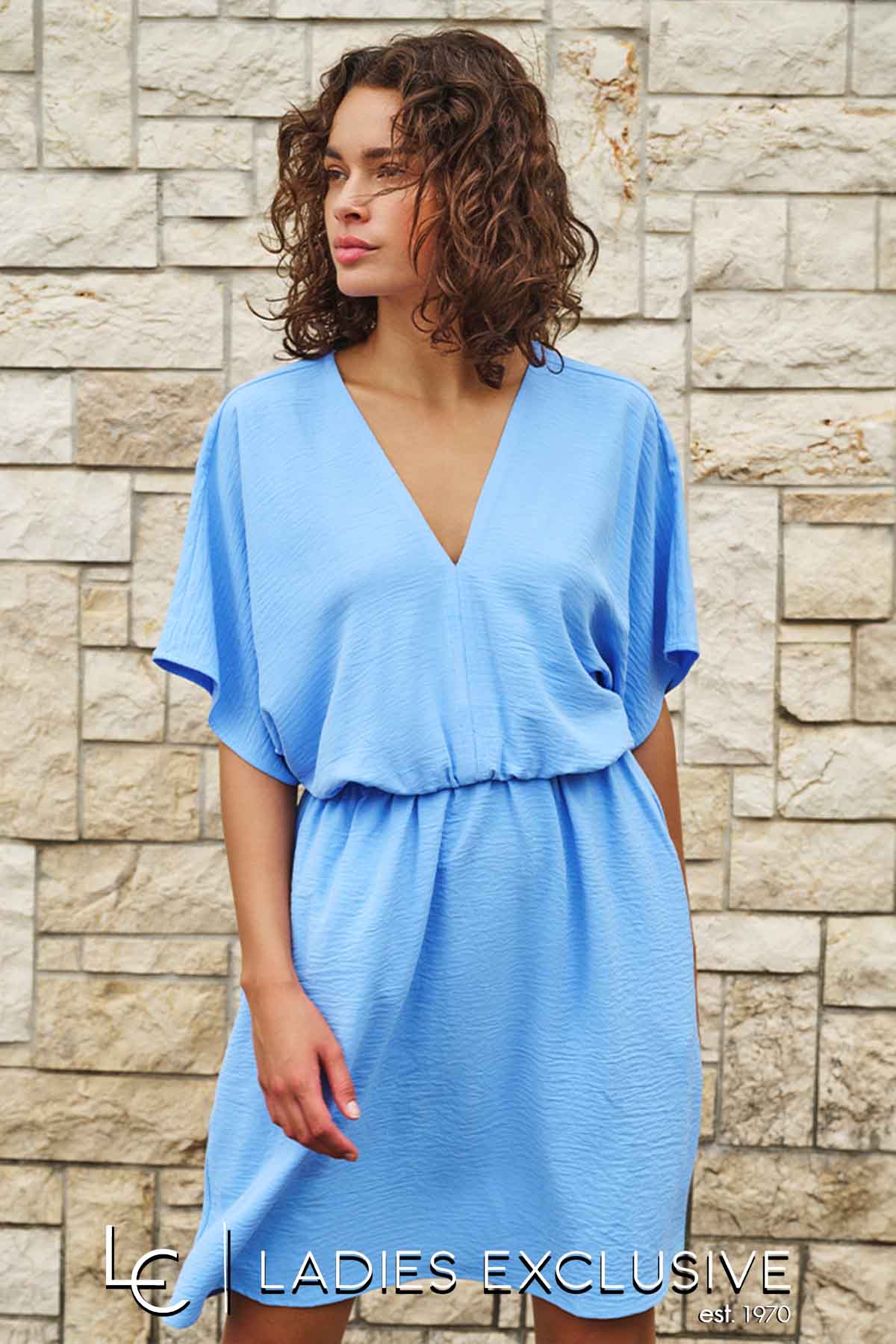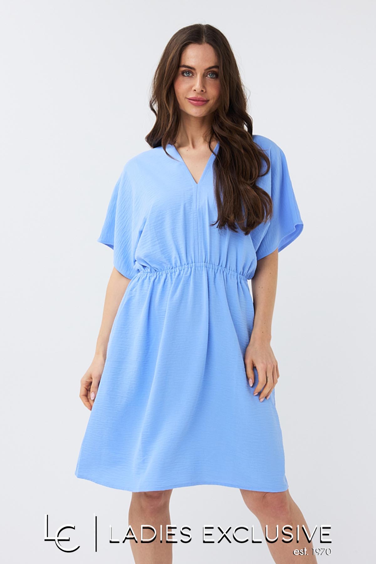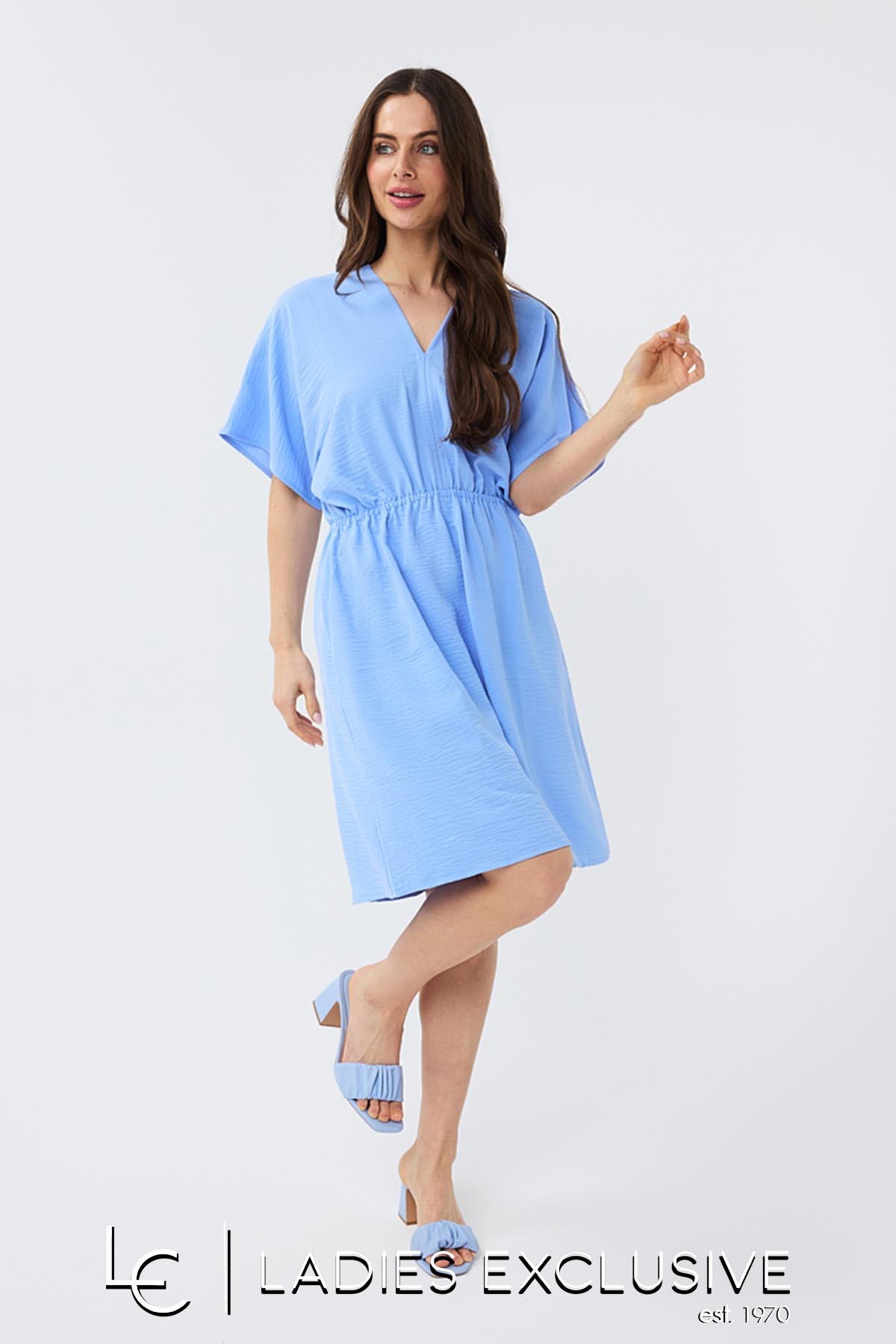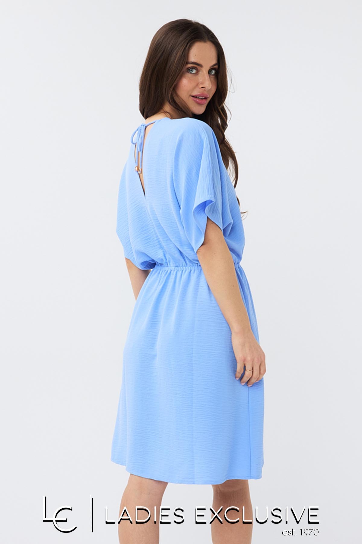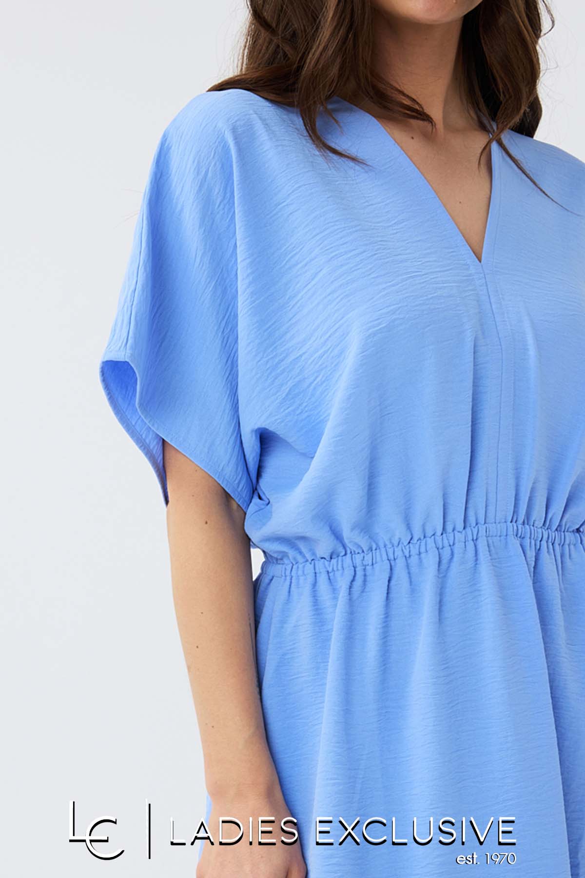 ESQUALO Φόρεμα σιέλ με άνοιγμα v μπροτα και πίσω και λάστιχο στη μέση. Έχει μανίκι φαρδύ ρεγκλάν.