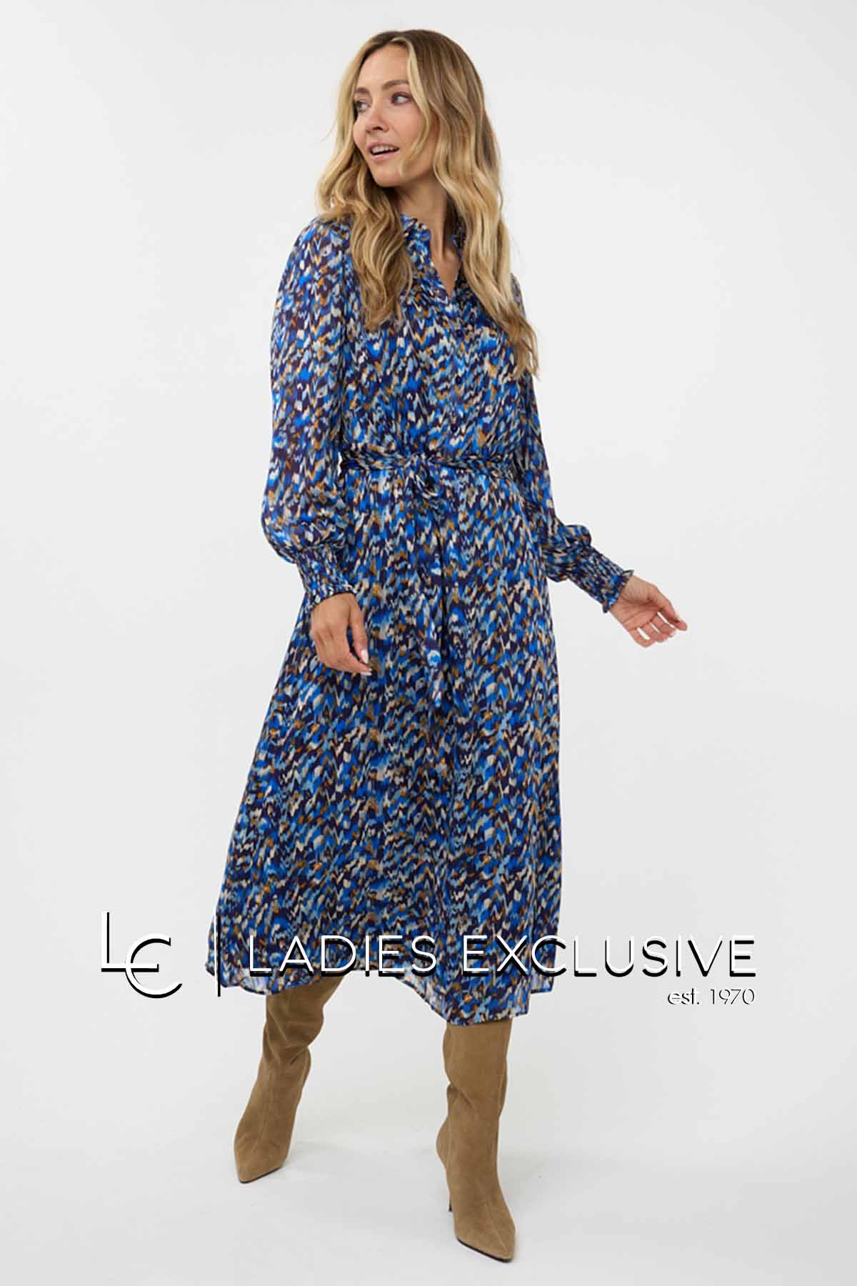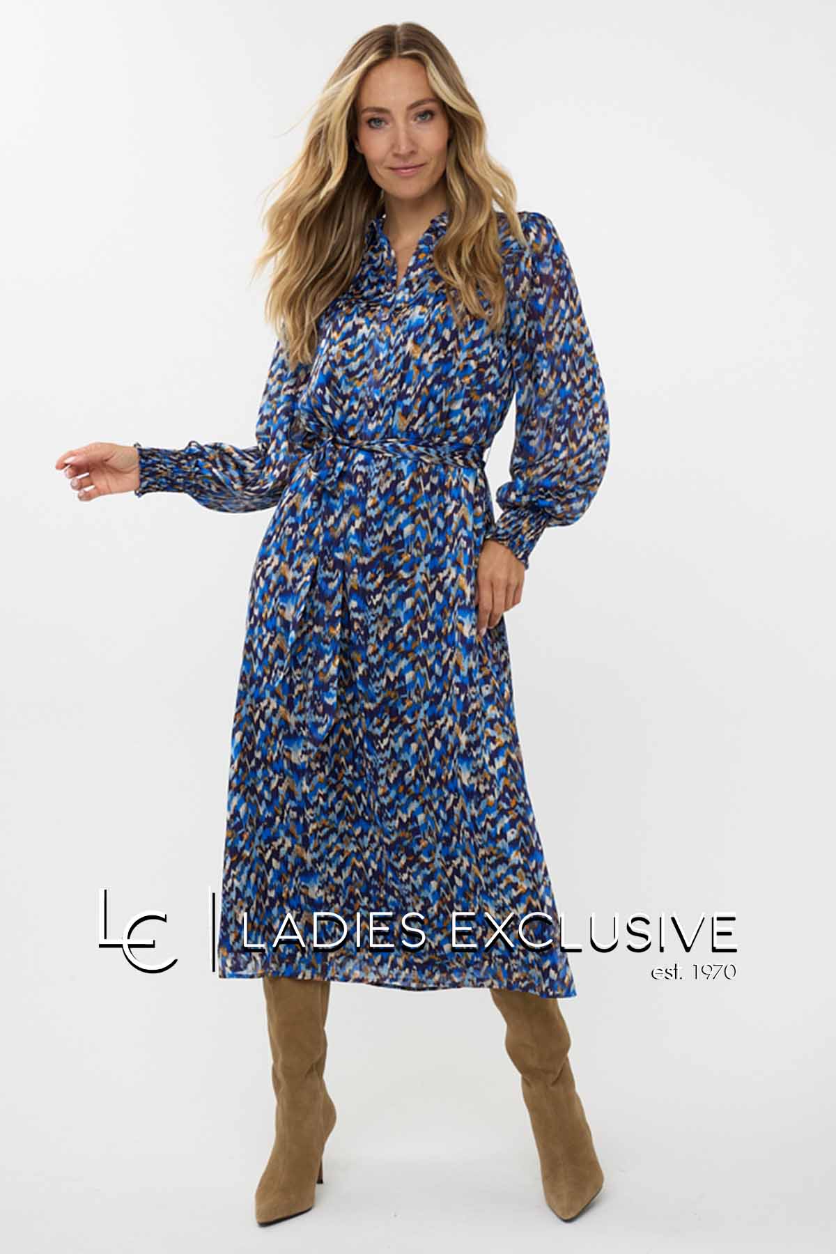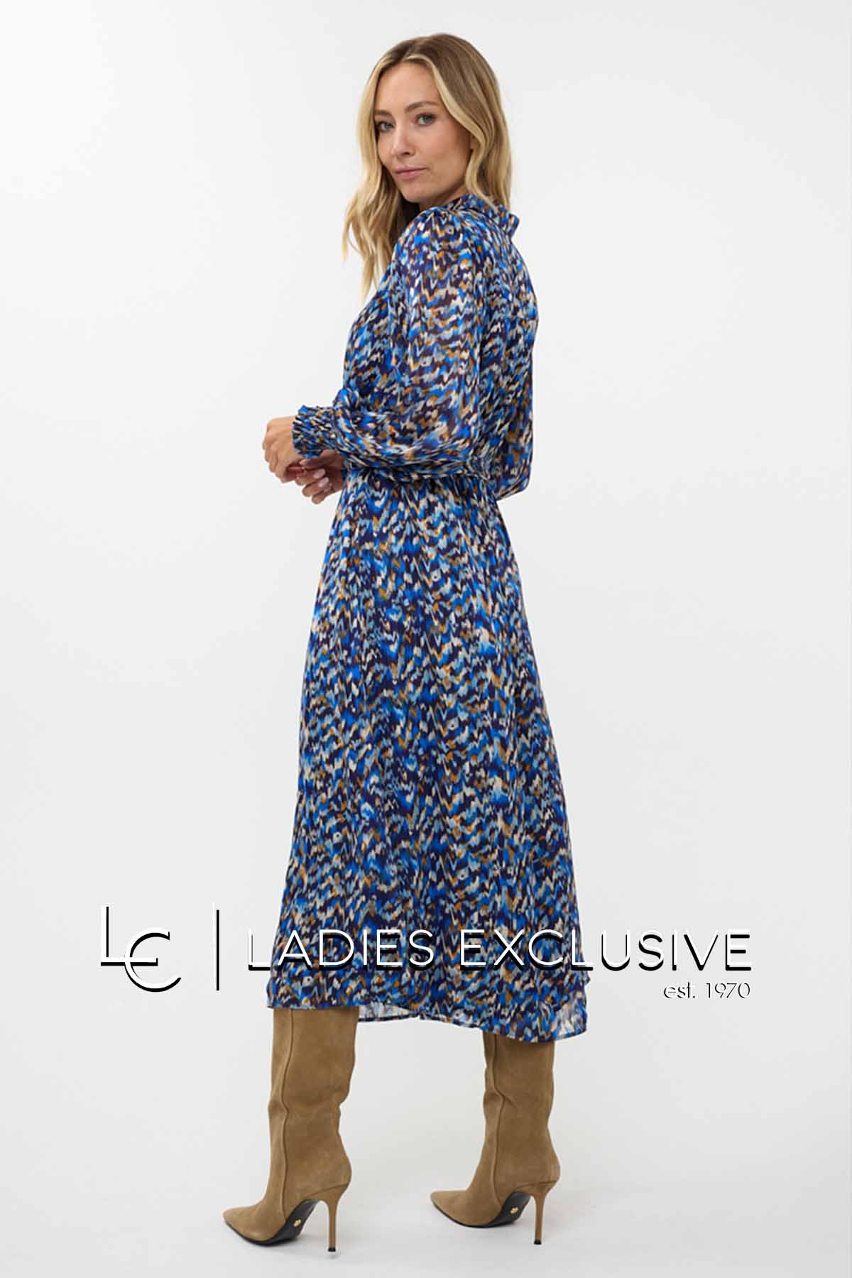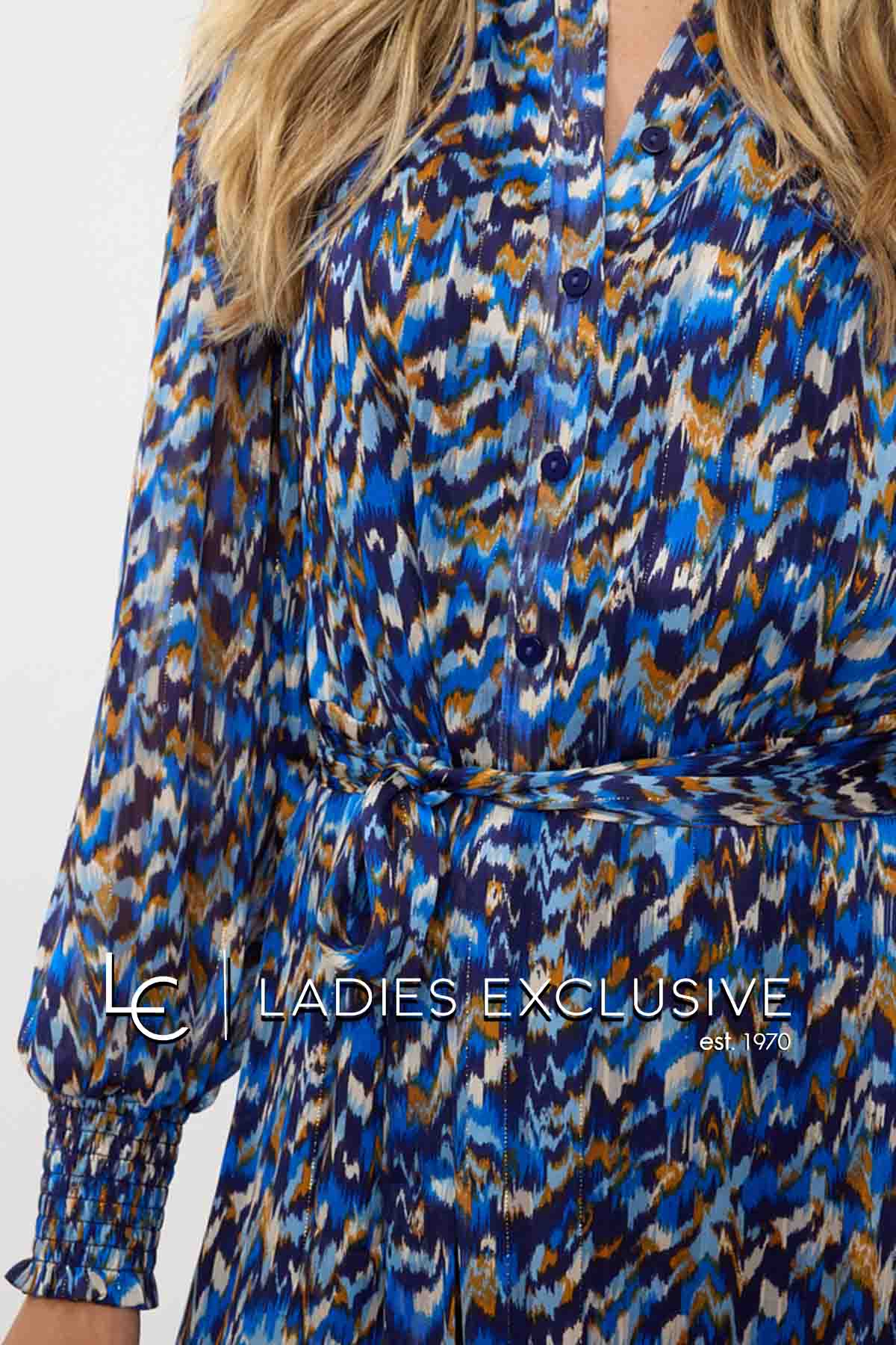 ESQUALO Φόρεμα εμπριμέ σε μπλε αποχρώσεις με χρυσοκλωστή στην ύφανση σε γραμμή A. Έχει μανίκι φαρδύ που καταλήγει σε λάστιχο και κουμπιά μέχρι τη μέση.