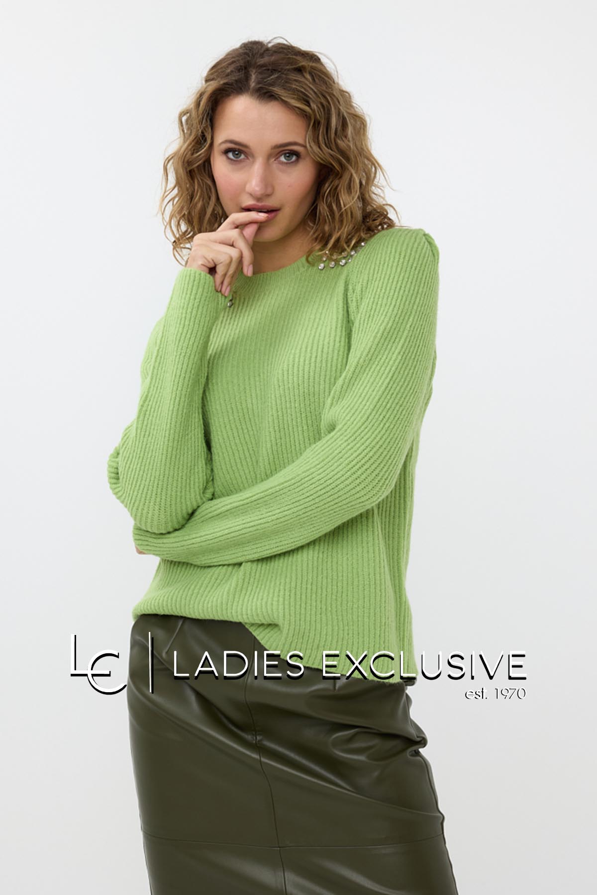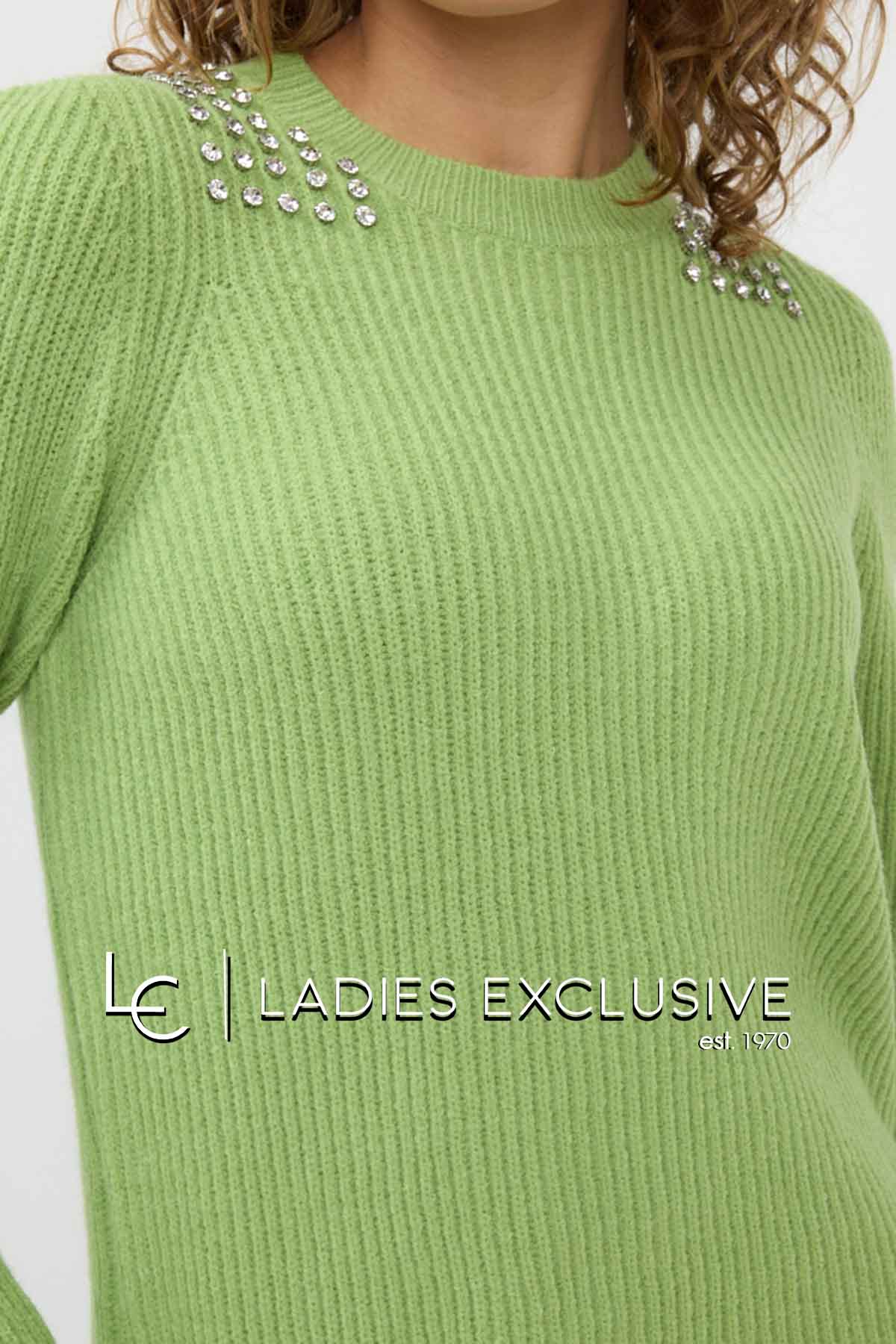 ESQUALO Πουλόβερ πράσινο με χοντρή πλέξη και στρας στους ώμους. Έχει μανίκι που ελαφρώς φουσκώνει.