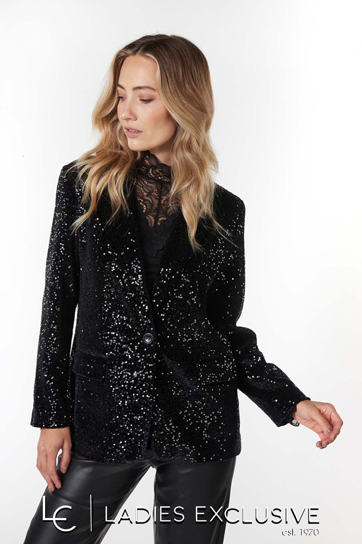 ESQUALO Σακάκι μαύρο από παγιέτες, με τσέπες με καπάκια. Γίνεται σετ με τη φούστα με κωδικό 23.17709.01