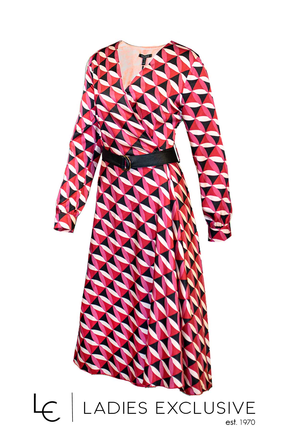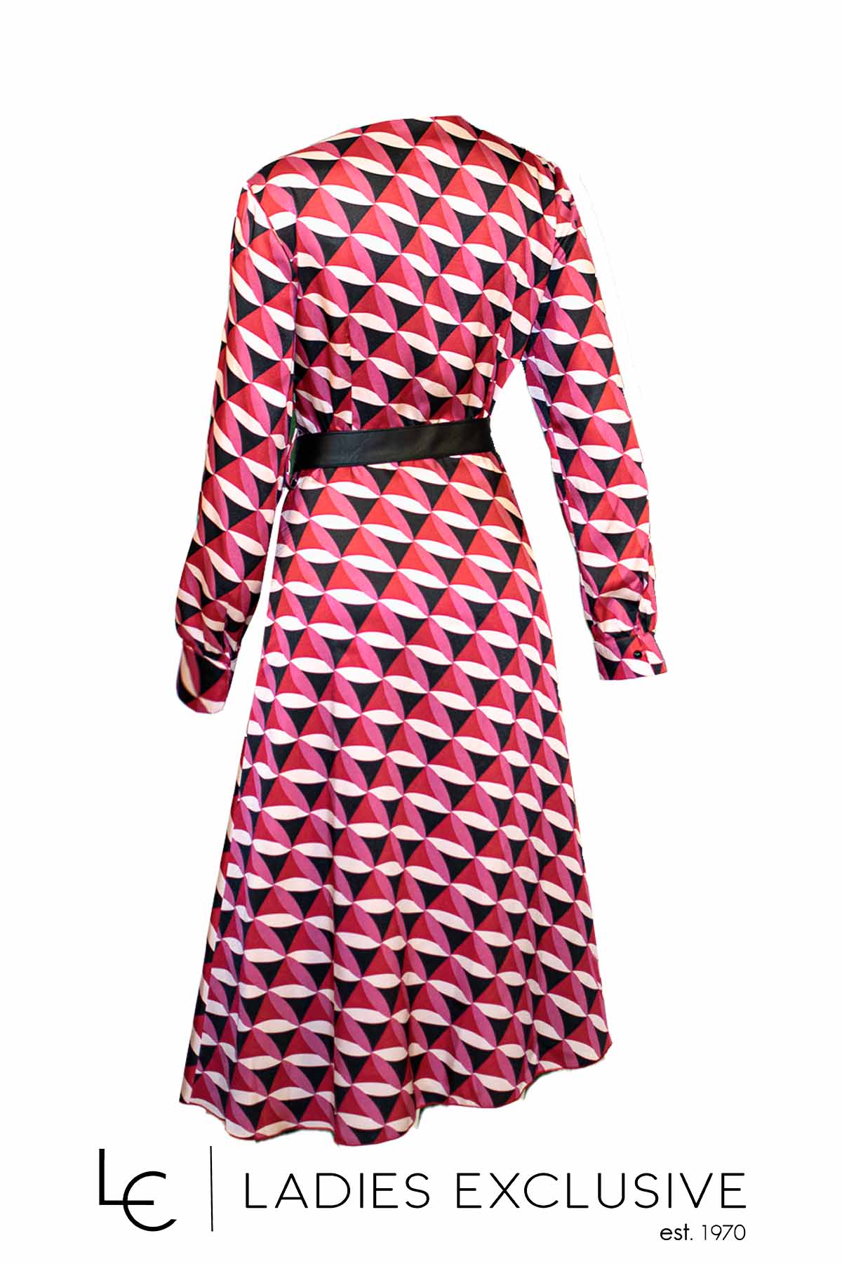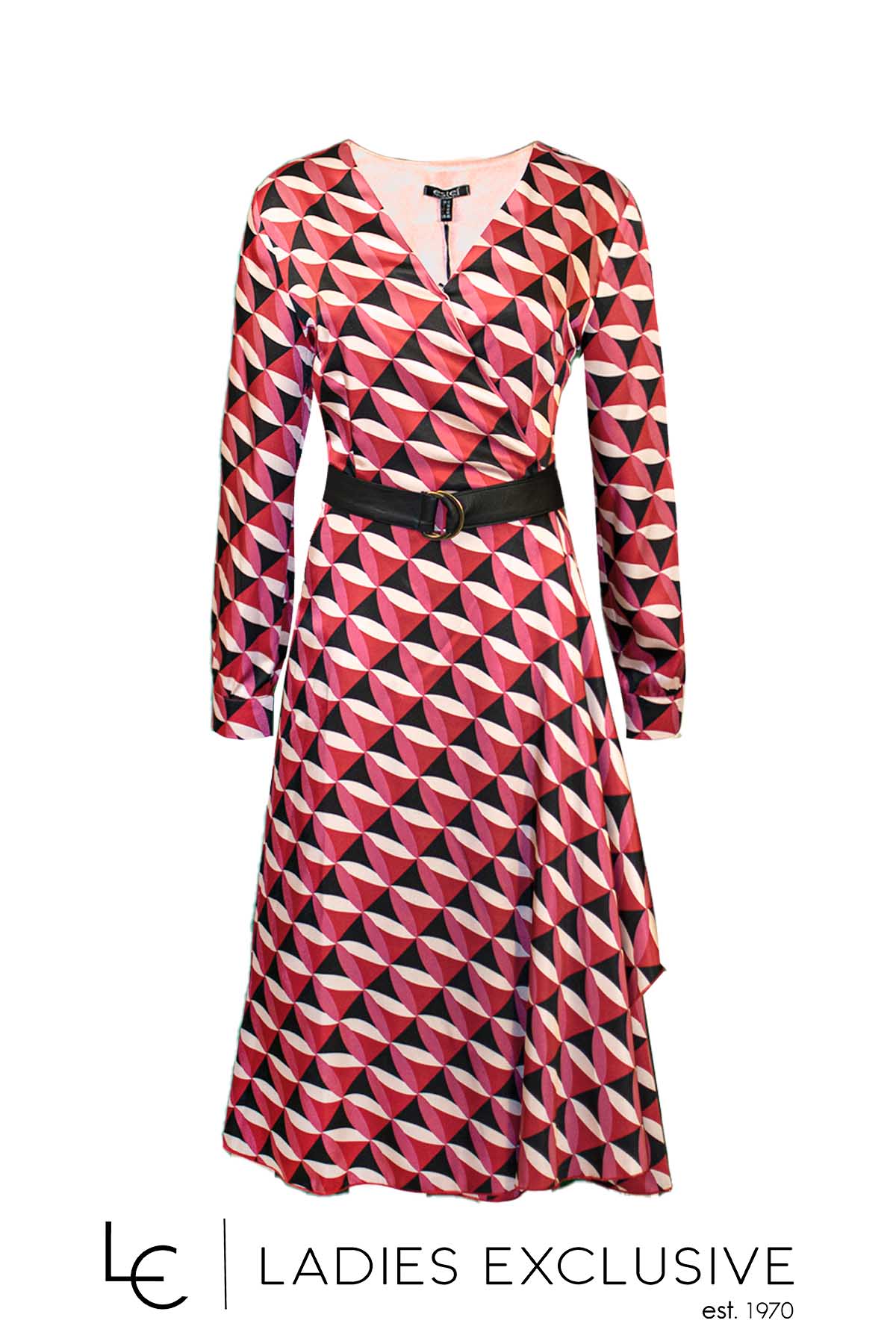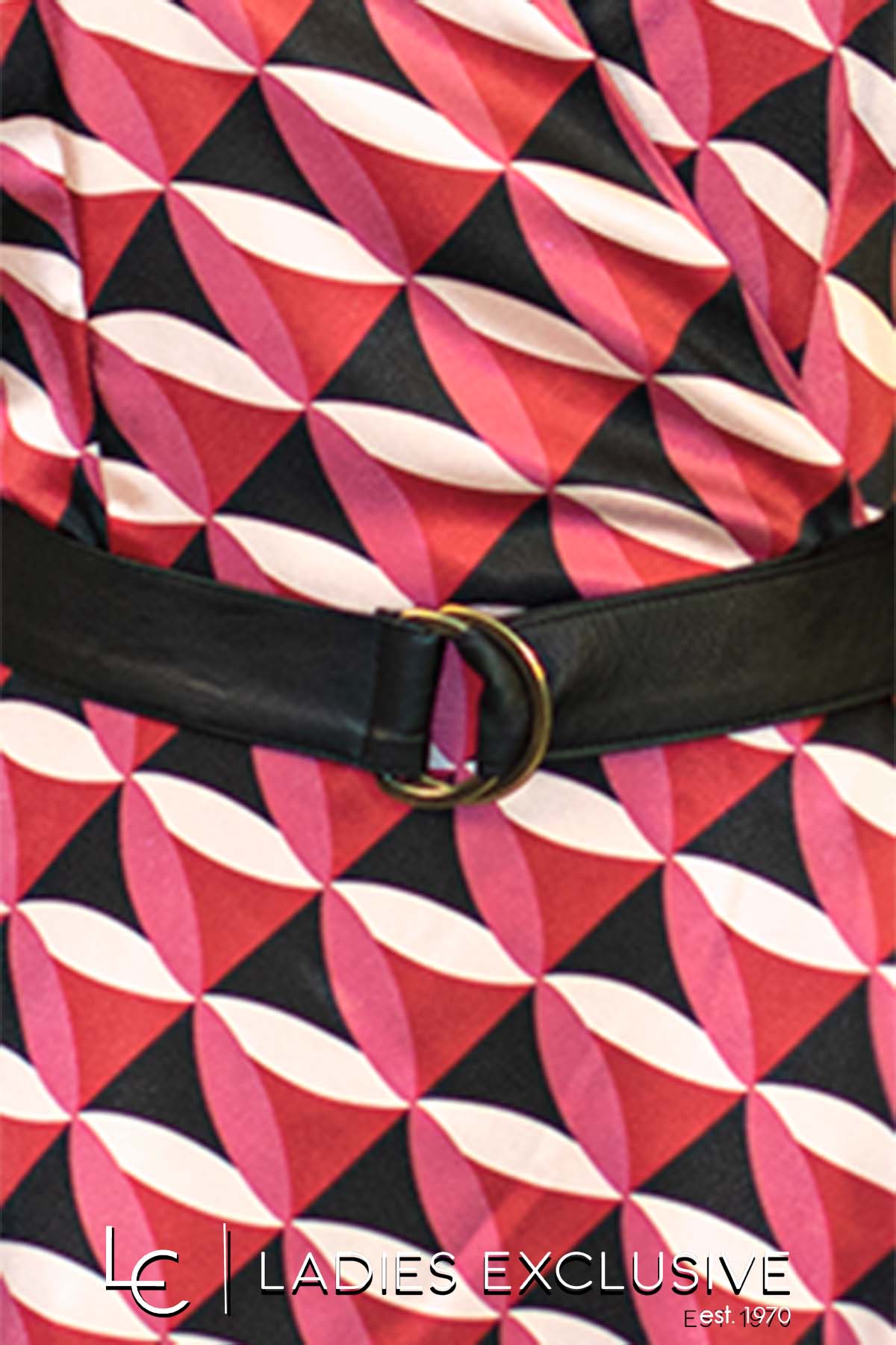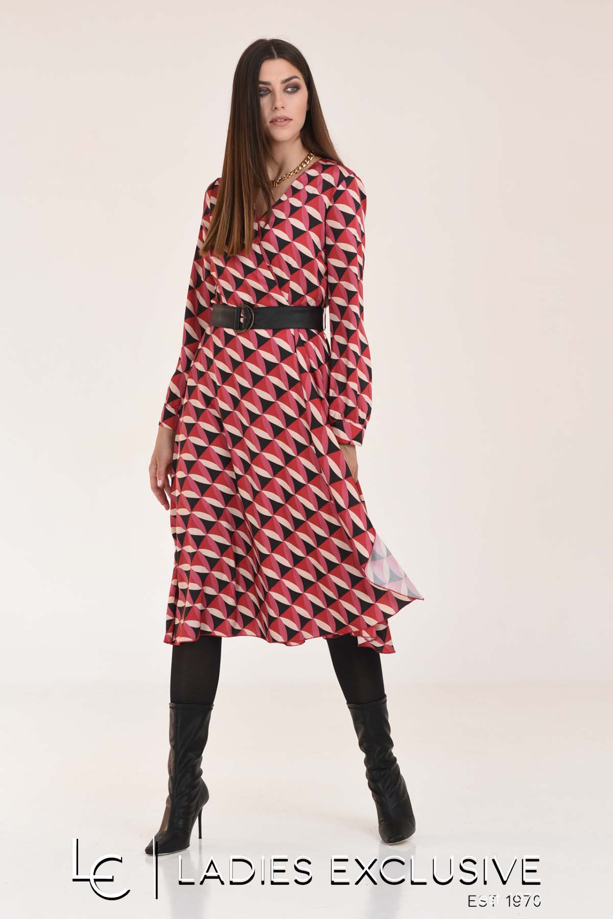 ESTEL Φόρεμα εμπριμέ με γεωμετρικά σχήματα κρουαζέ σε γραμμή A. Έχει ζώνη από δερματίνη και στο μπροστινό μέρος κλείνει σαν φάκελος.