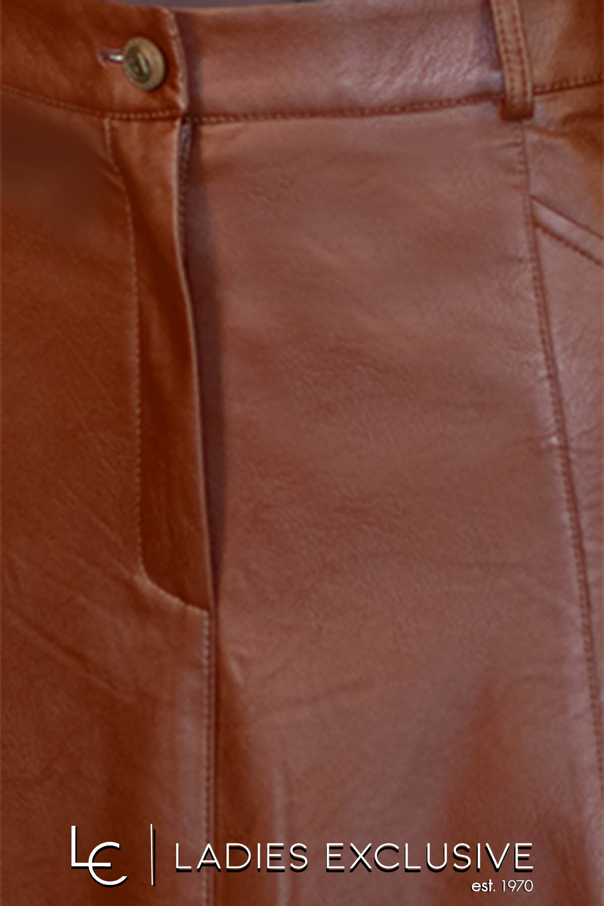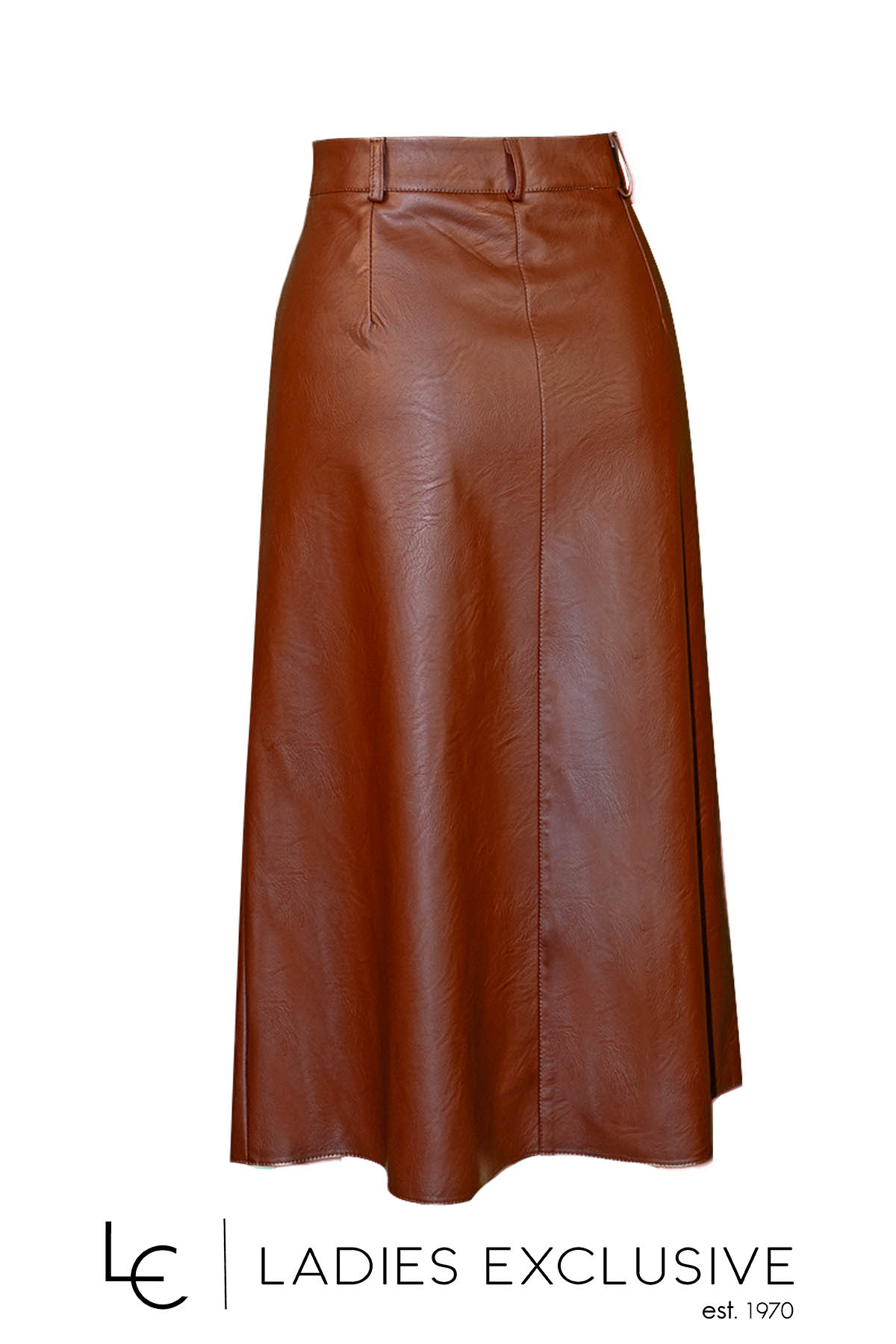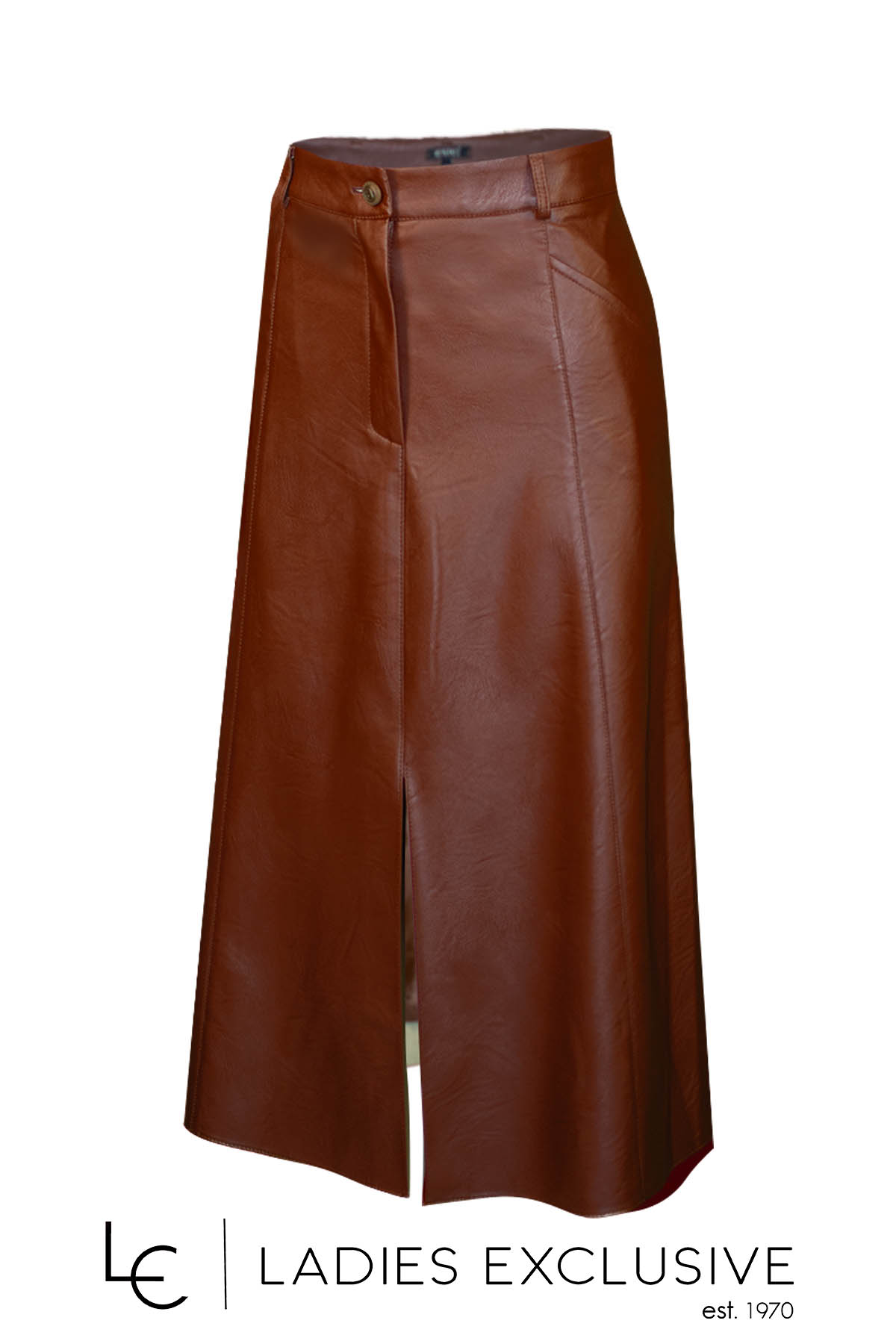 ESTEL Φούστα καφέ από τεχνόδερμα σε γραμμή A, με μεγάλο άνοιγμα στο μπροστινό μέρος και τσέπες στο πλάι.