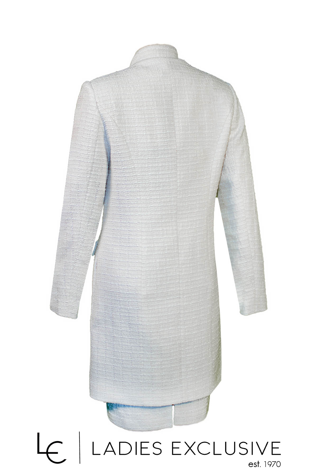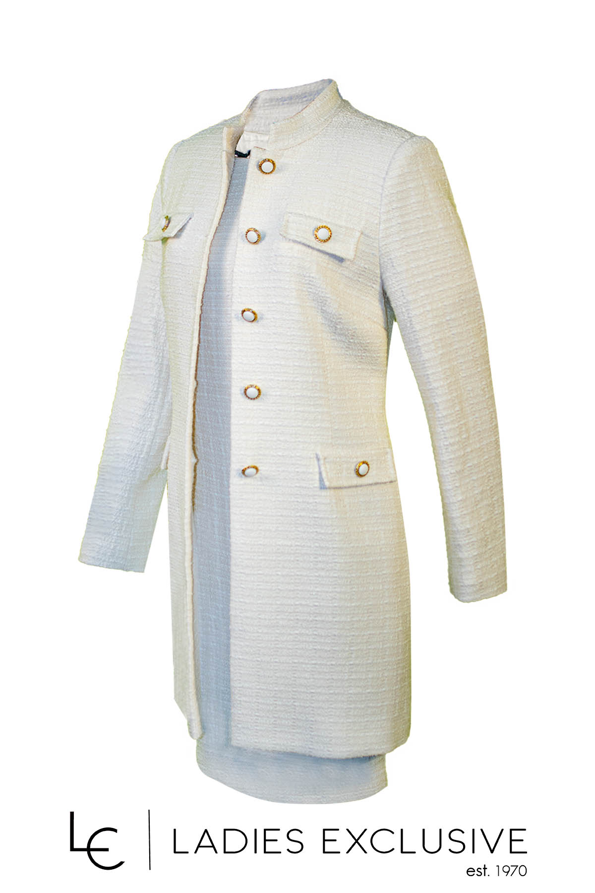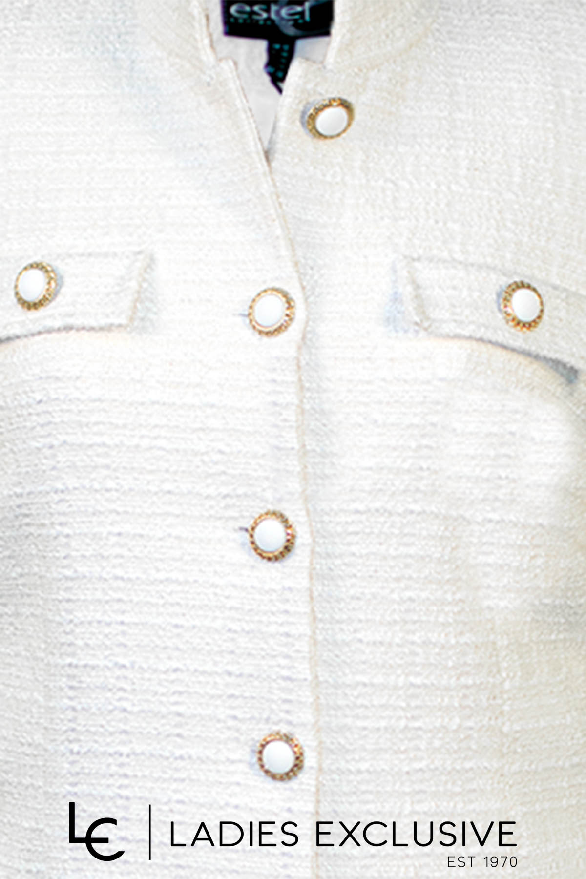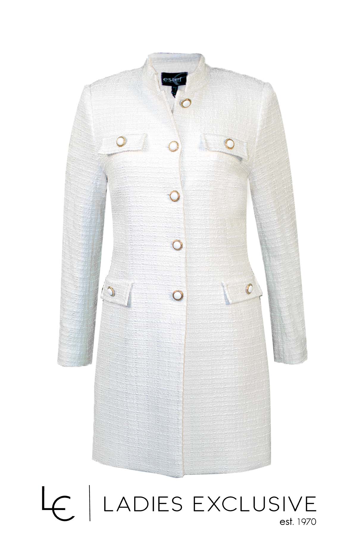ESTEL Μαντώ λευκό μπουκλέ με μάο γιακά και ιδιαίτερα κουμπιά. Γίνεται σετ με το φόρεμα με κωδικό 07230-00.06.