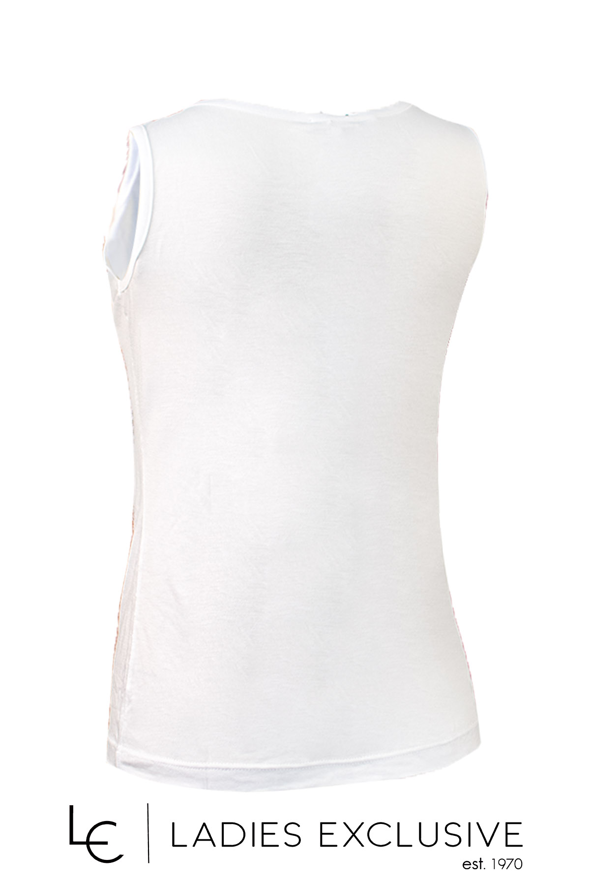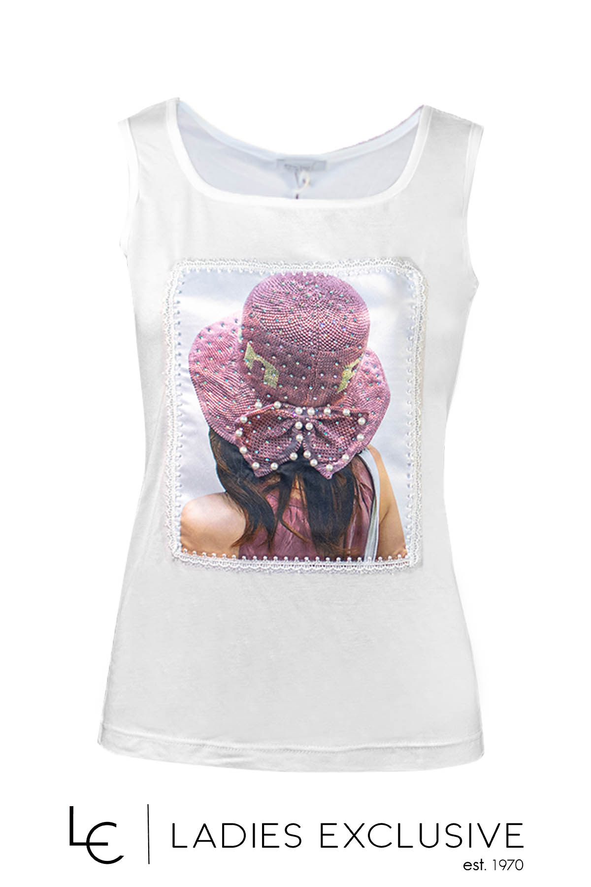 ESTEL Μπλούζα λευκή αμάνικη με στάμπα με δαντέλα, πέρλες και στρας.