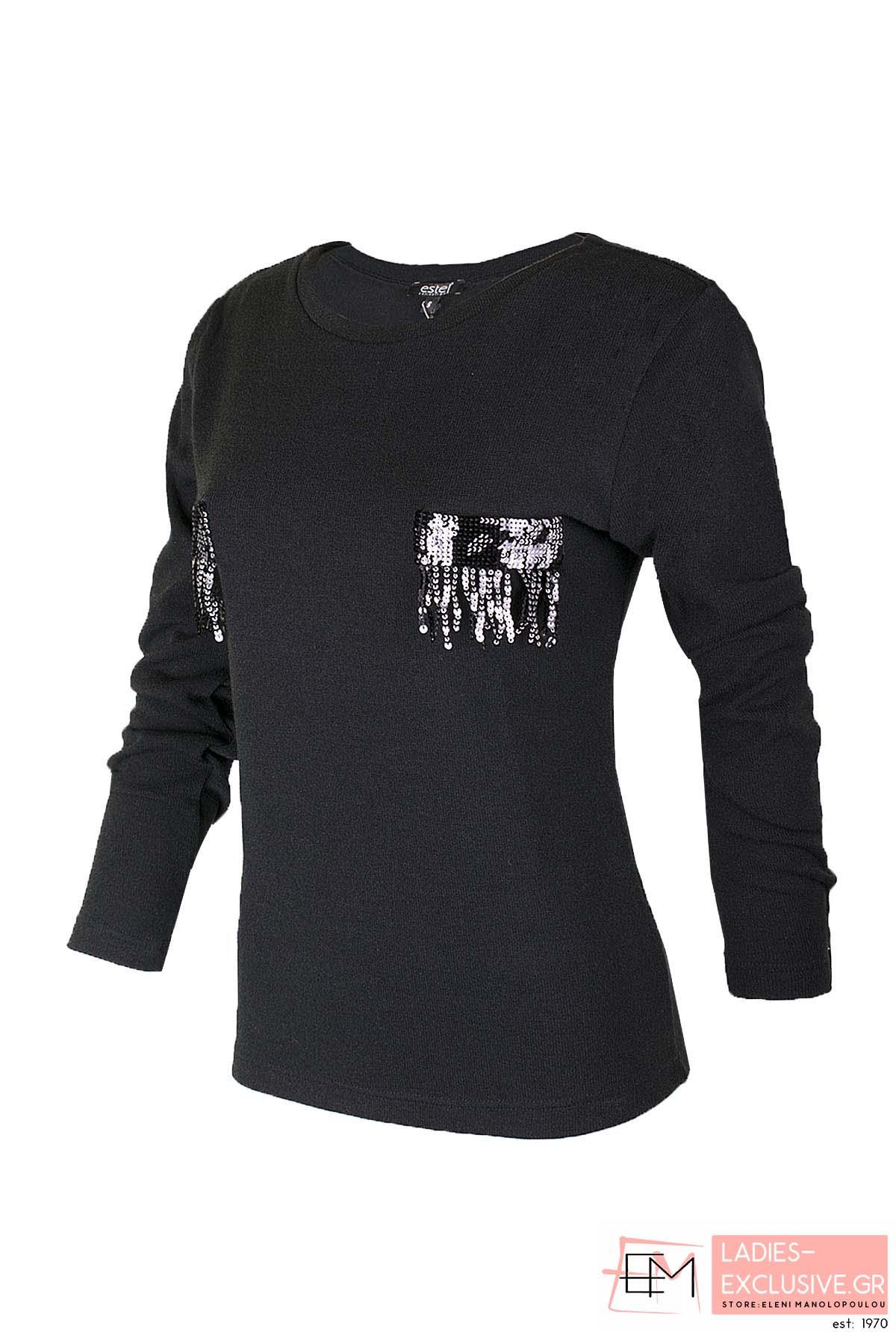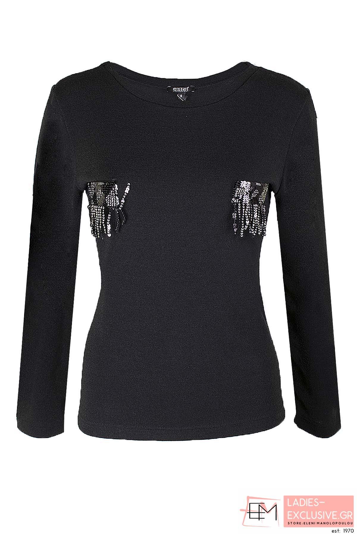 ESTEL Μπλούζα μαύρη λεπτή πλεκτή με λαιμόκοψη και παγιέτες στο μπροστινό μέρος.