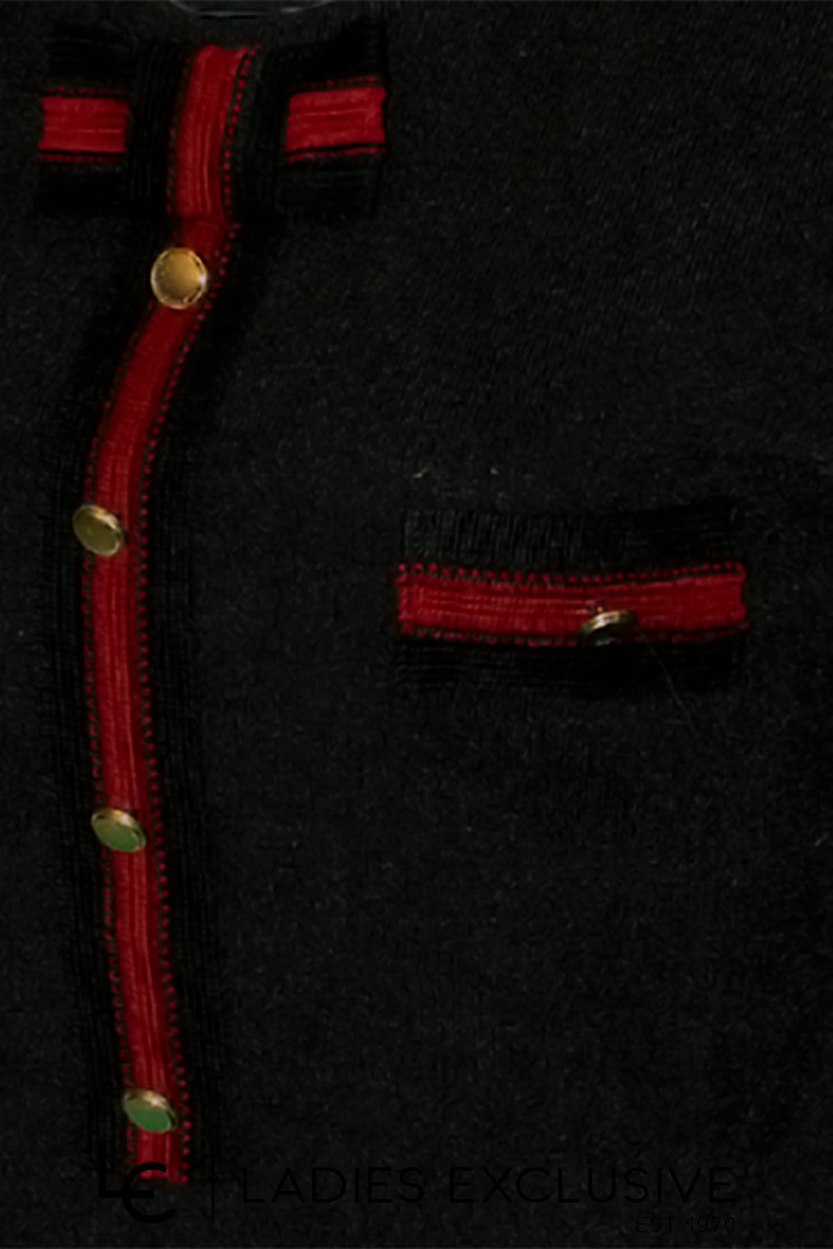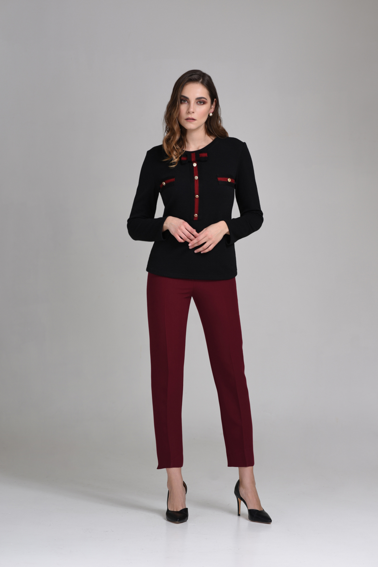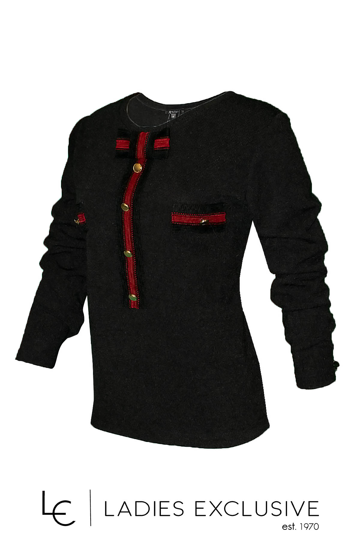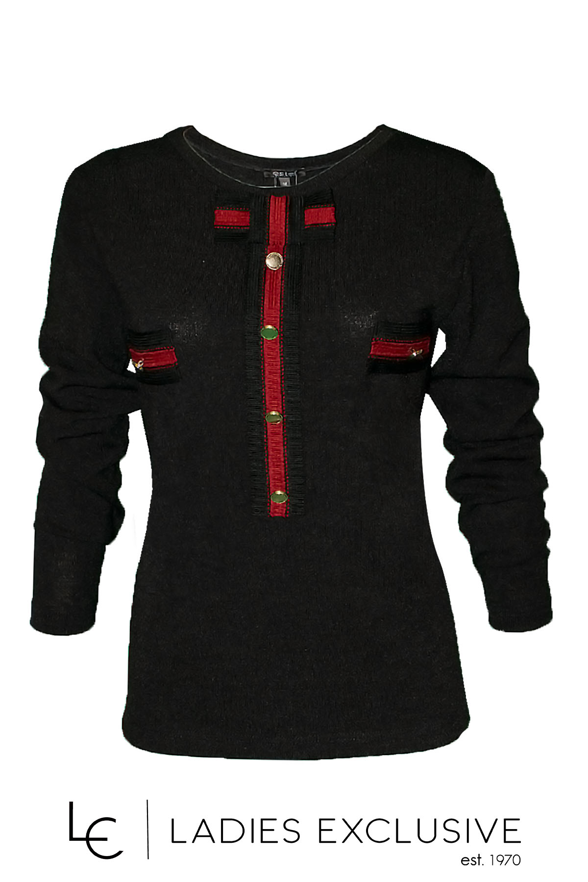 ESTEL Μπλούζα μαύρη πλεκτή μακρυμάνικη με κόκκινες λεπτομέρειες με χρυσά κουμπιά και φιόγκο στη λαιμόκοψη.
