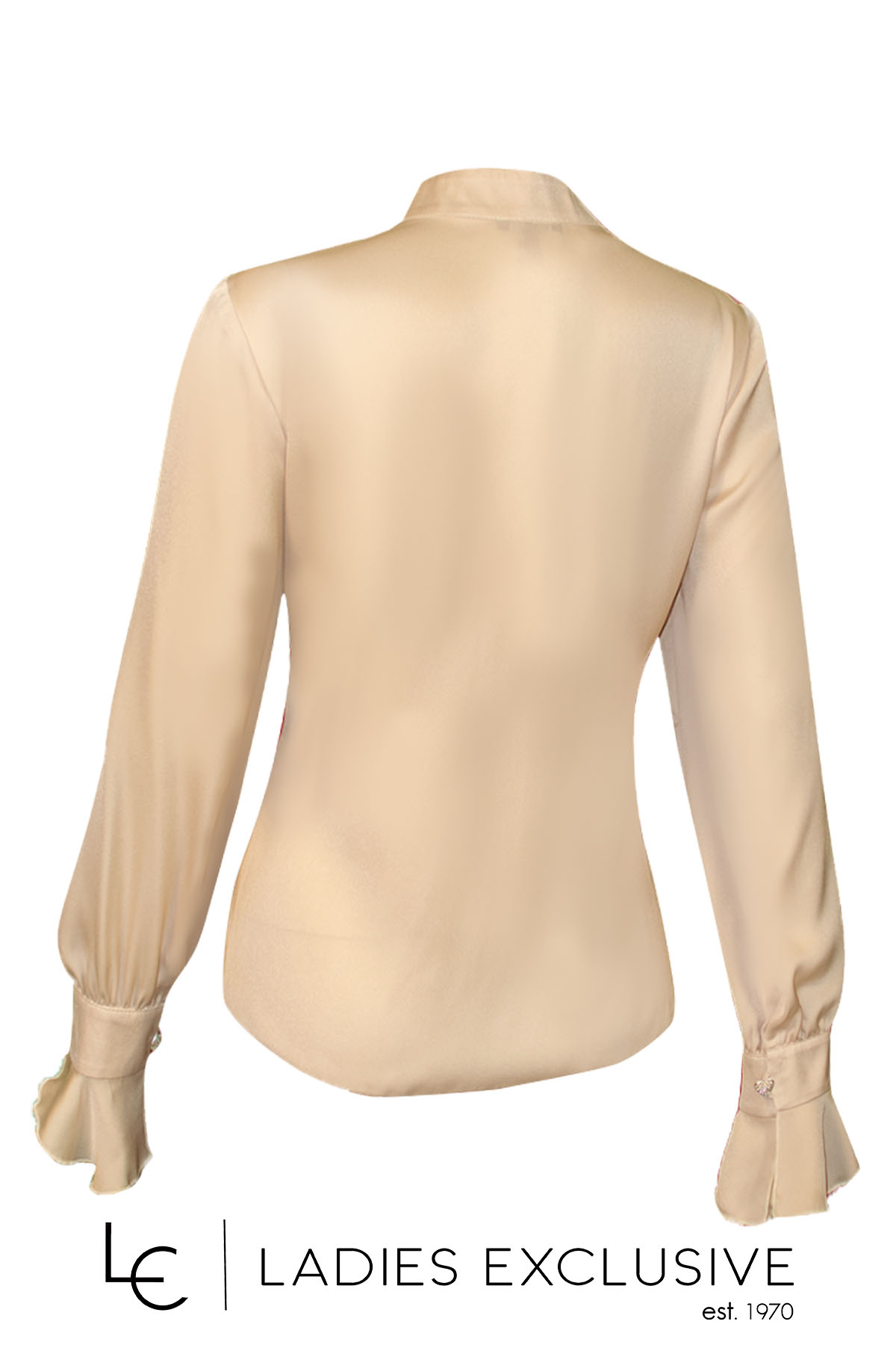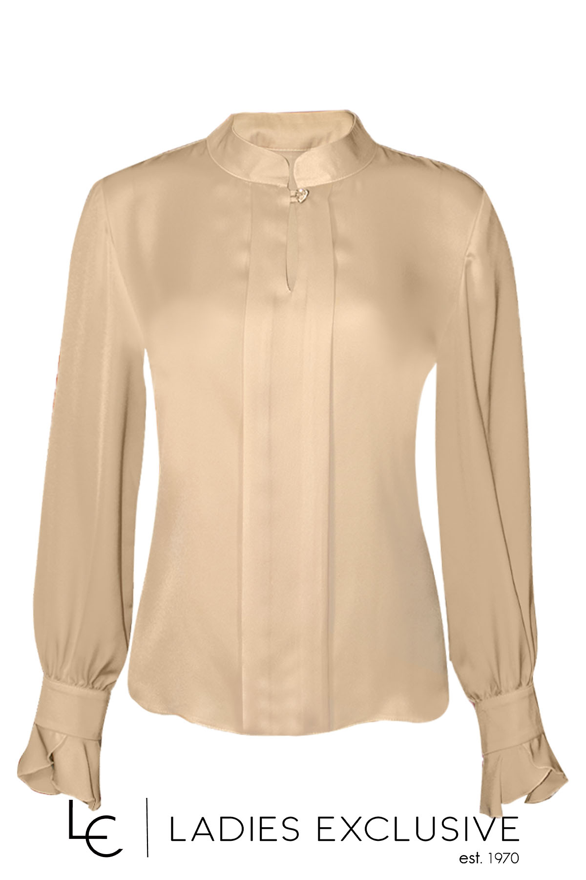 ESTEL Μπλούζα μπεζ σατέν με κλειστό γιακά, που κλείνει με κουμπί καρδιά. Στα μανίκια έχει βολάν.