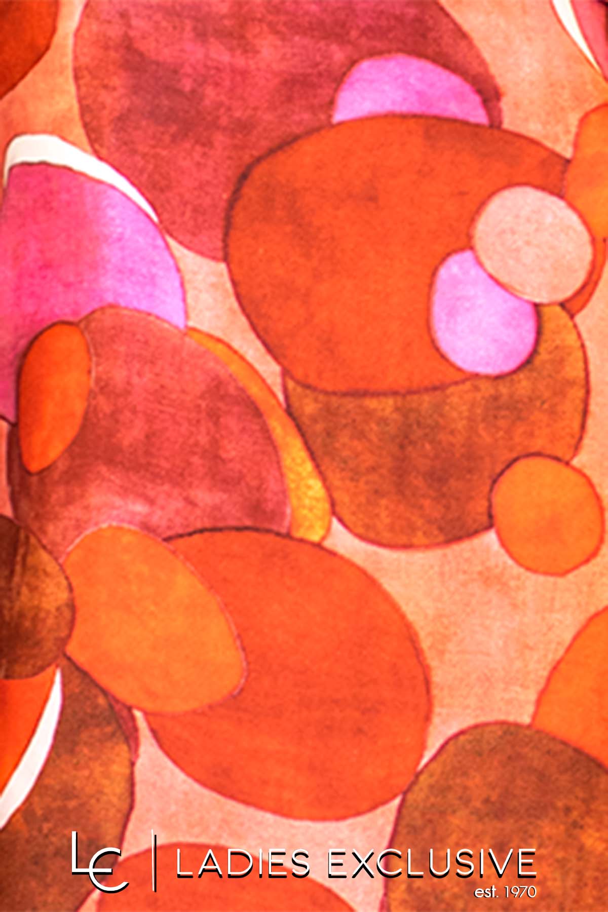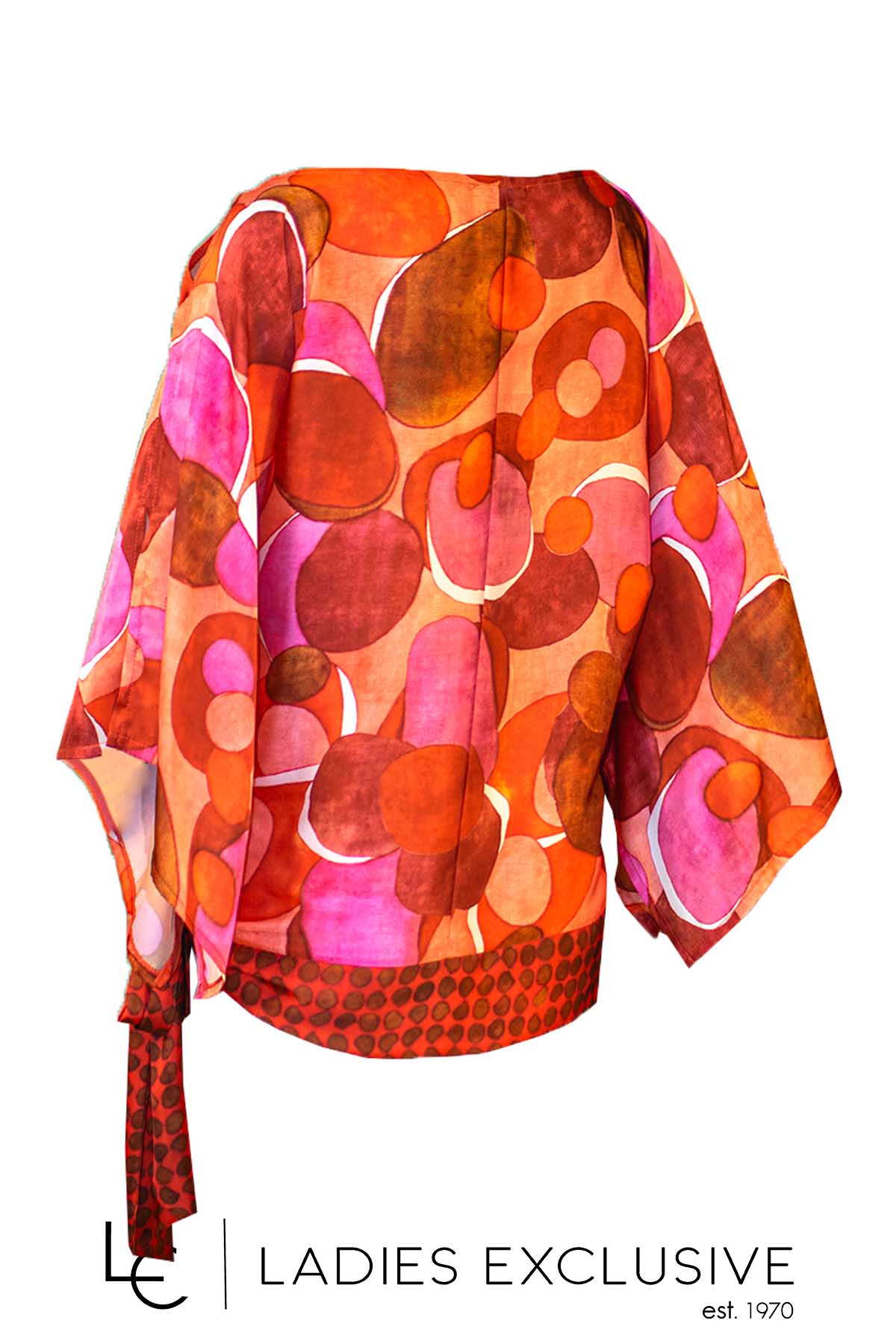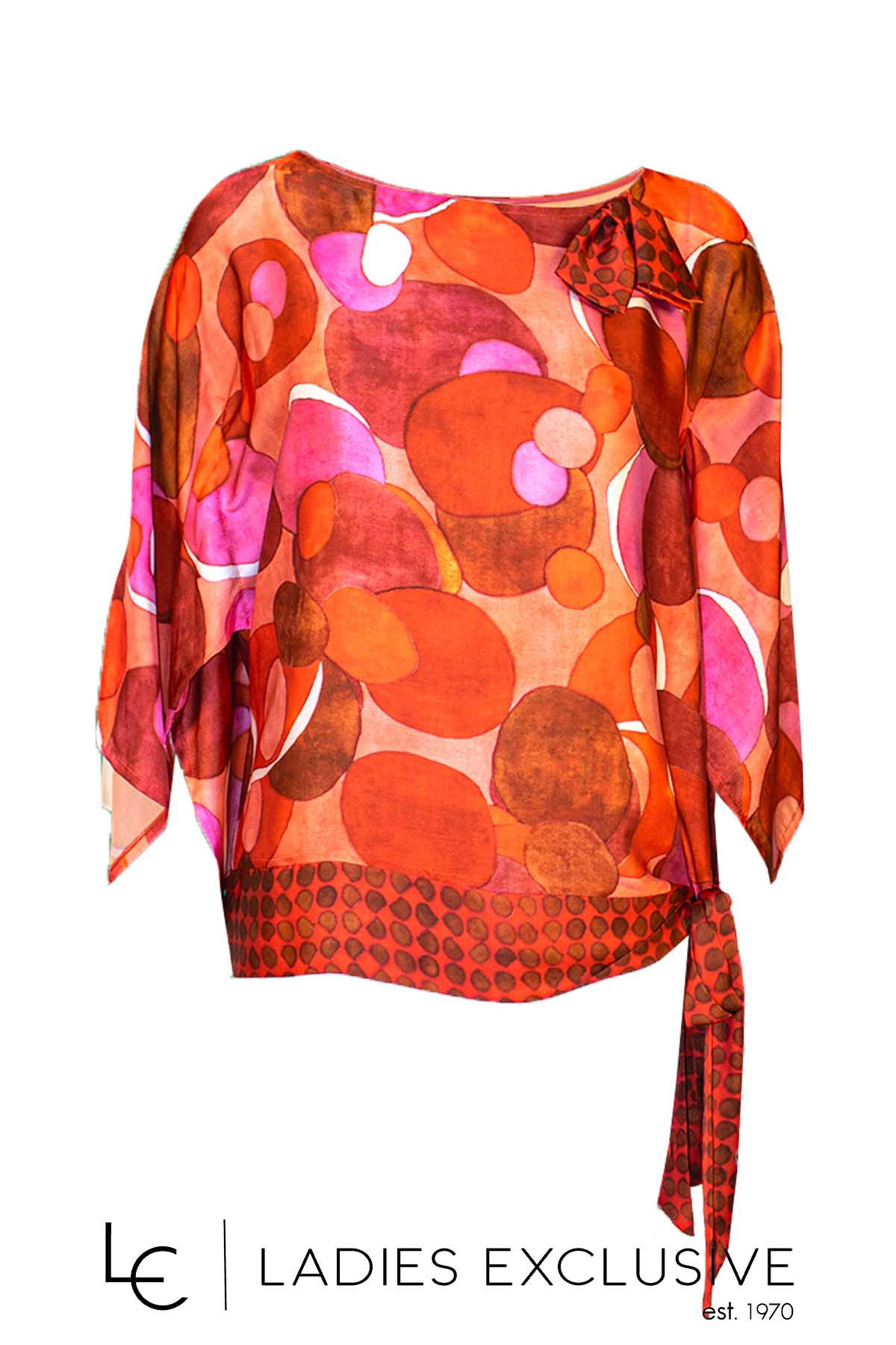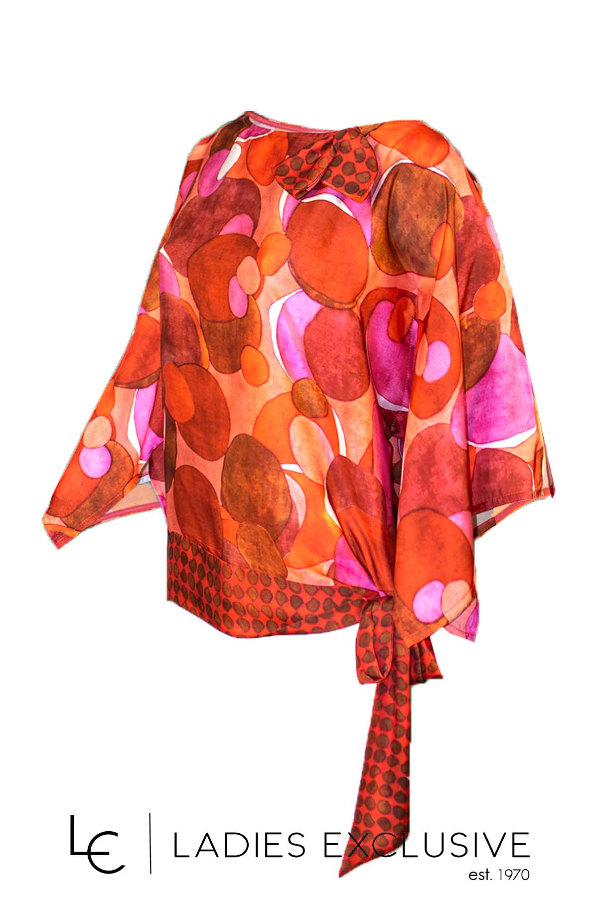ESTEL Μπλούζα σατέν σε τόνους κοραλί, σε άνετη γραμμή, με πολύ φαρδύ μανίκι και ανοίγματα στους ώμους και στους αγκώνες. Στο τελείωμά τους έχει ιδιαίτερο δέσιμο.