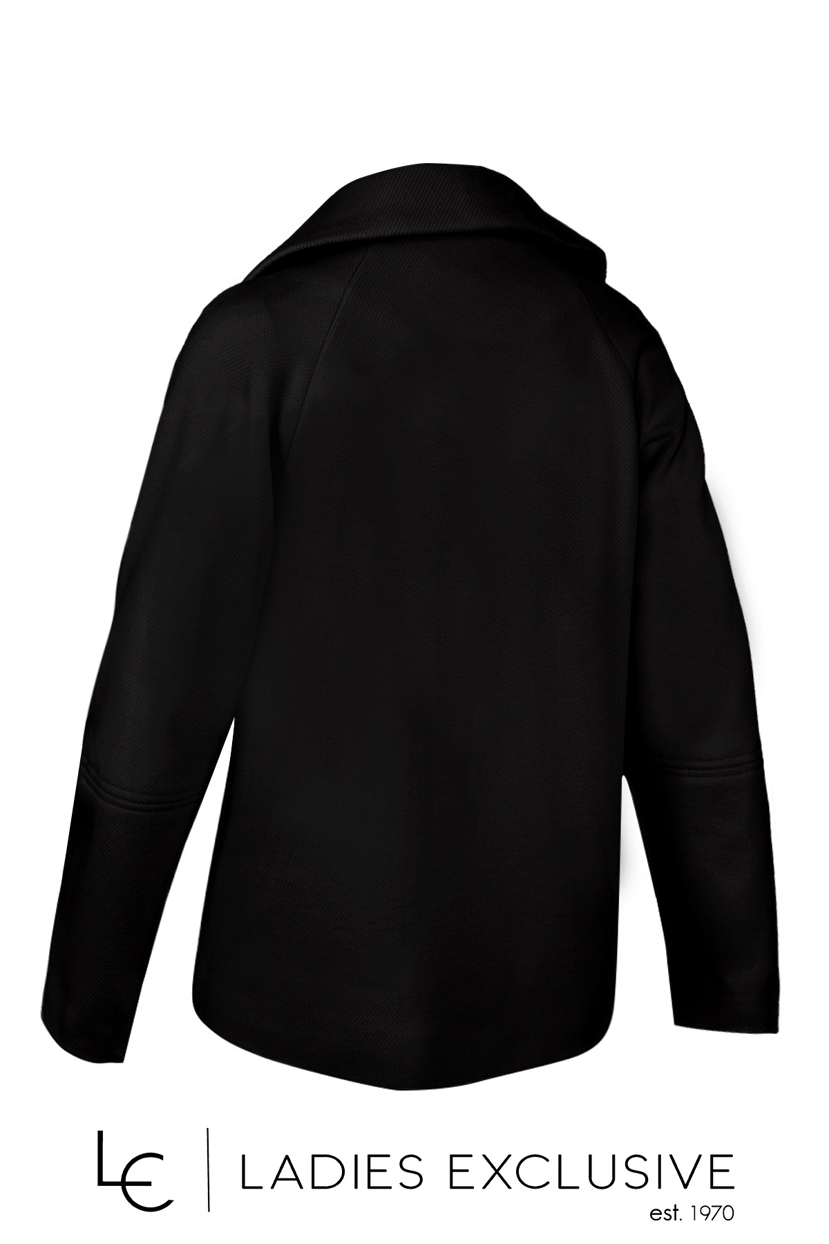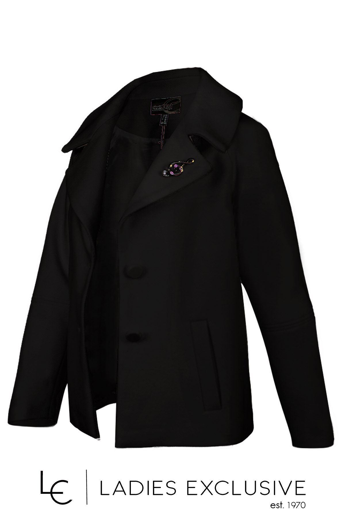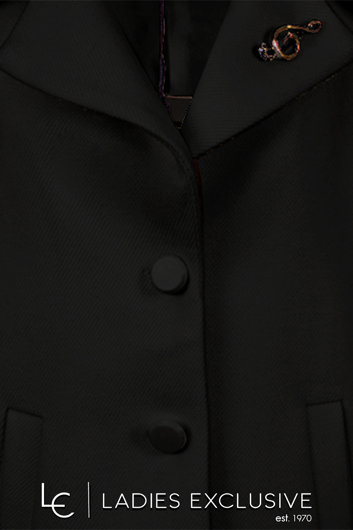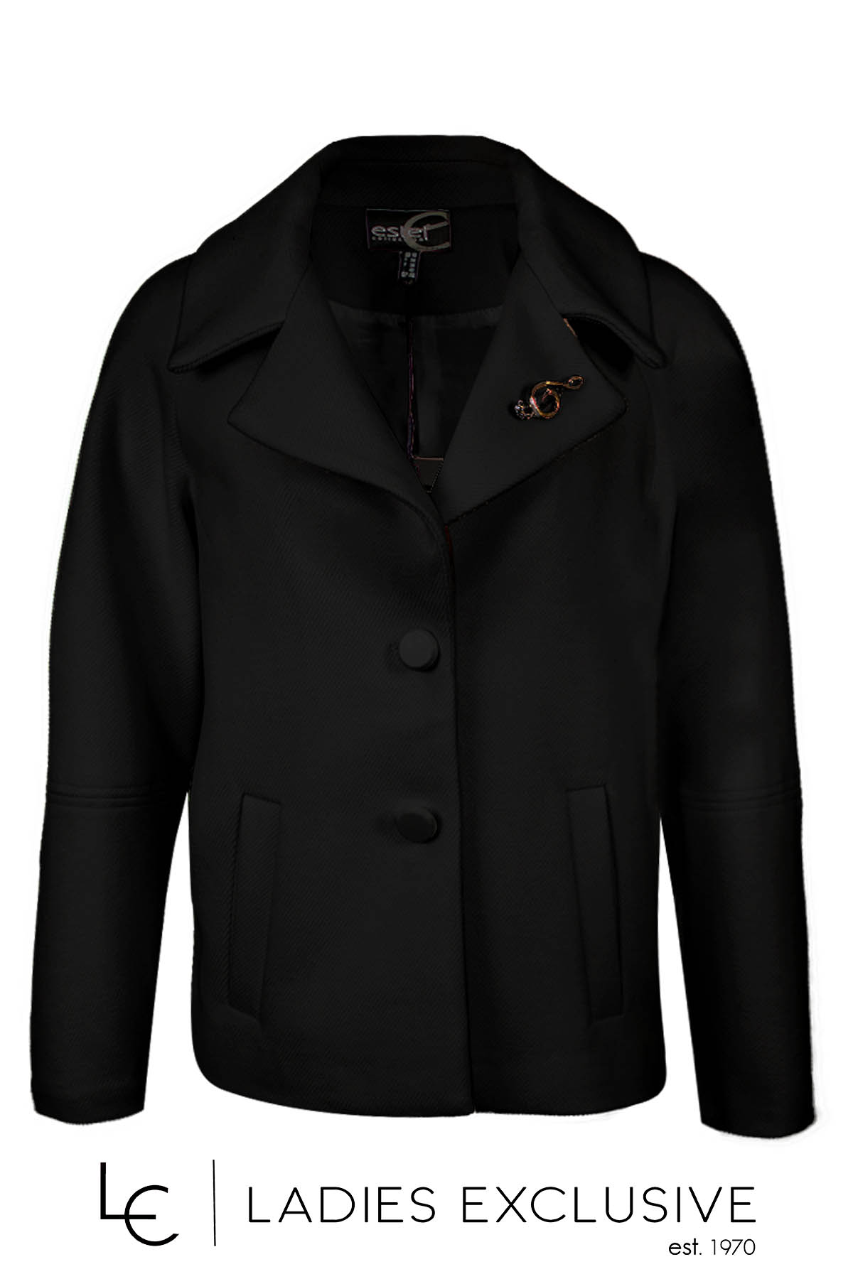 ESTEL Παλτοζακέτα μαύρη σε γραμμή A, με ιδιαίτερη καρφίτσα στο πέτο.