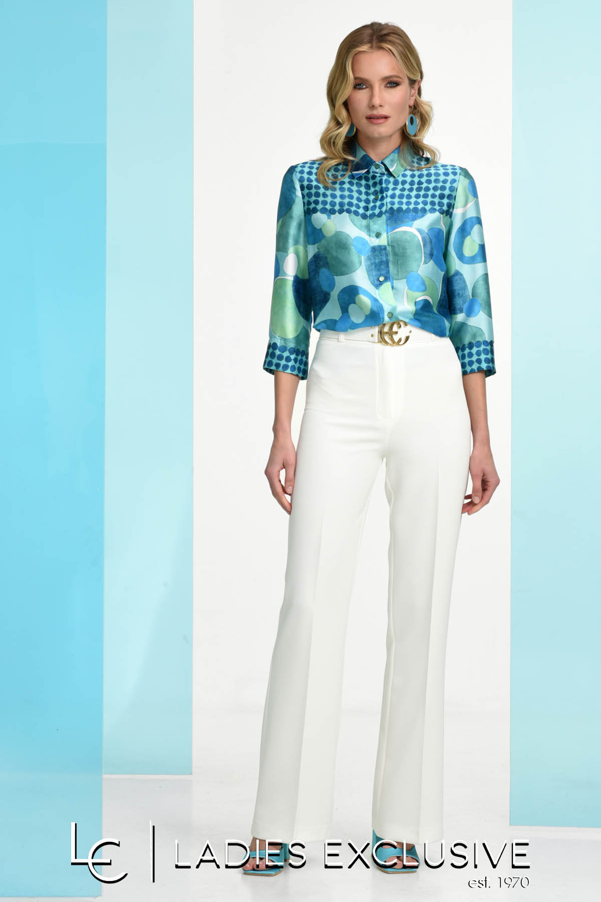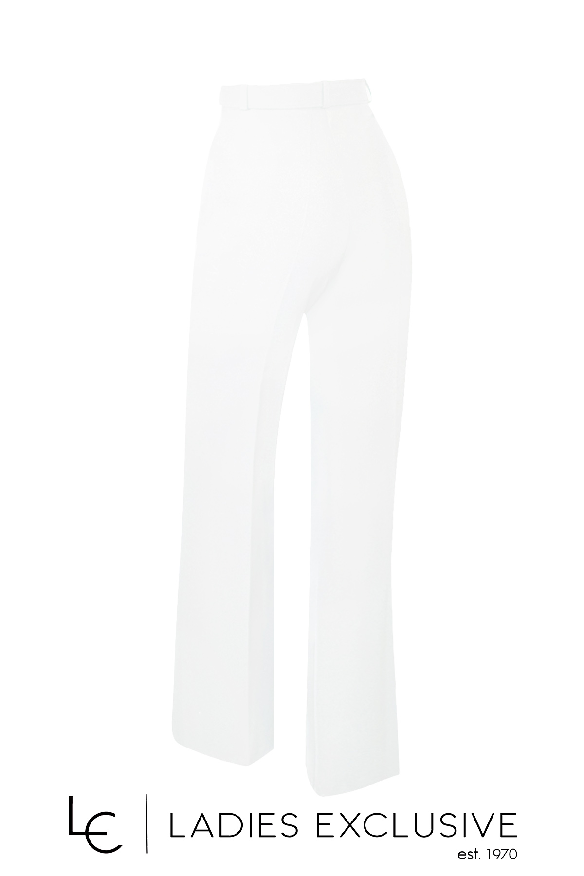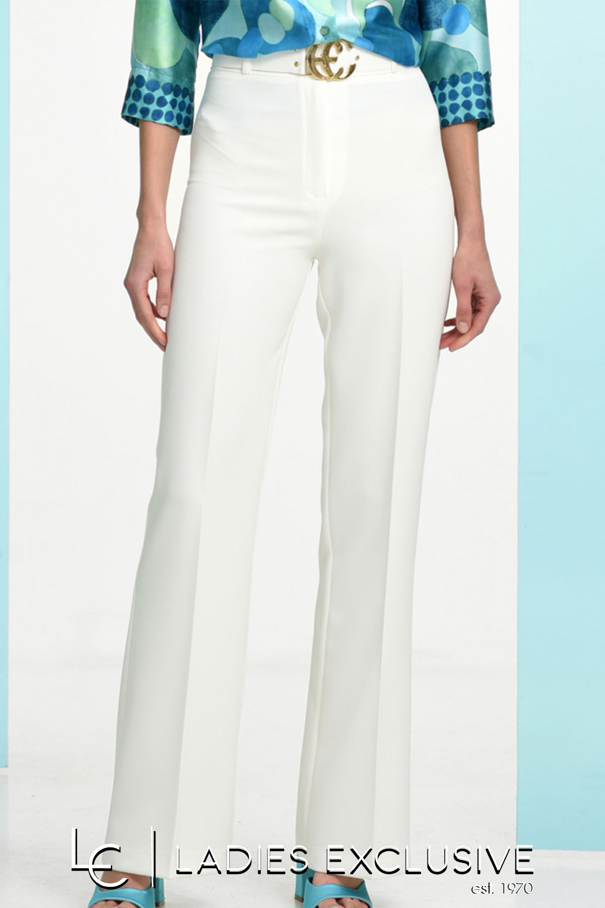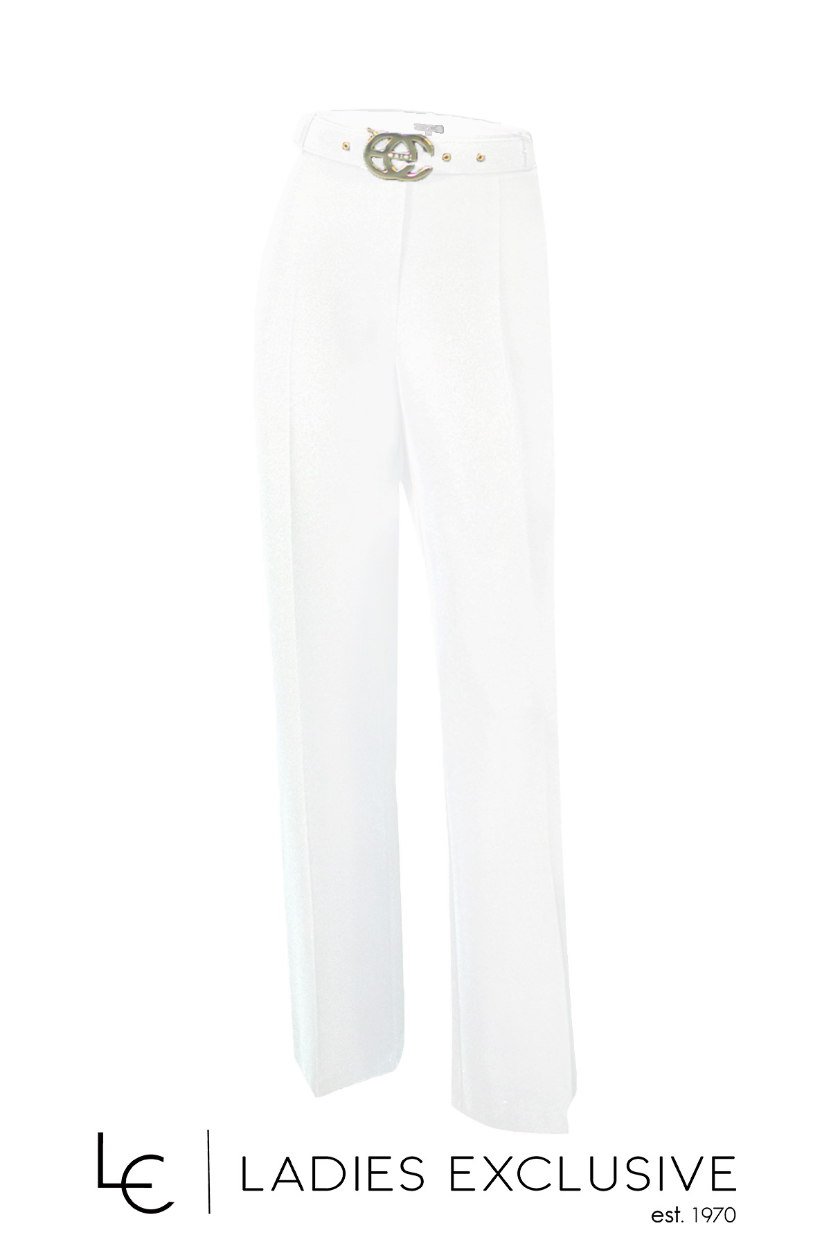 ESTEL Παντελόνα άσπρη καμπάνα με ζώνη στη μέση και ιδιαίτερη αγκράφα.