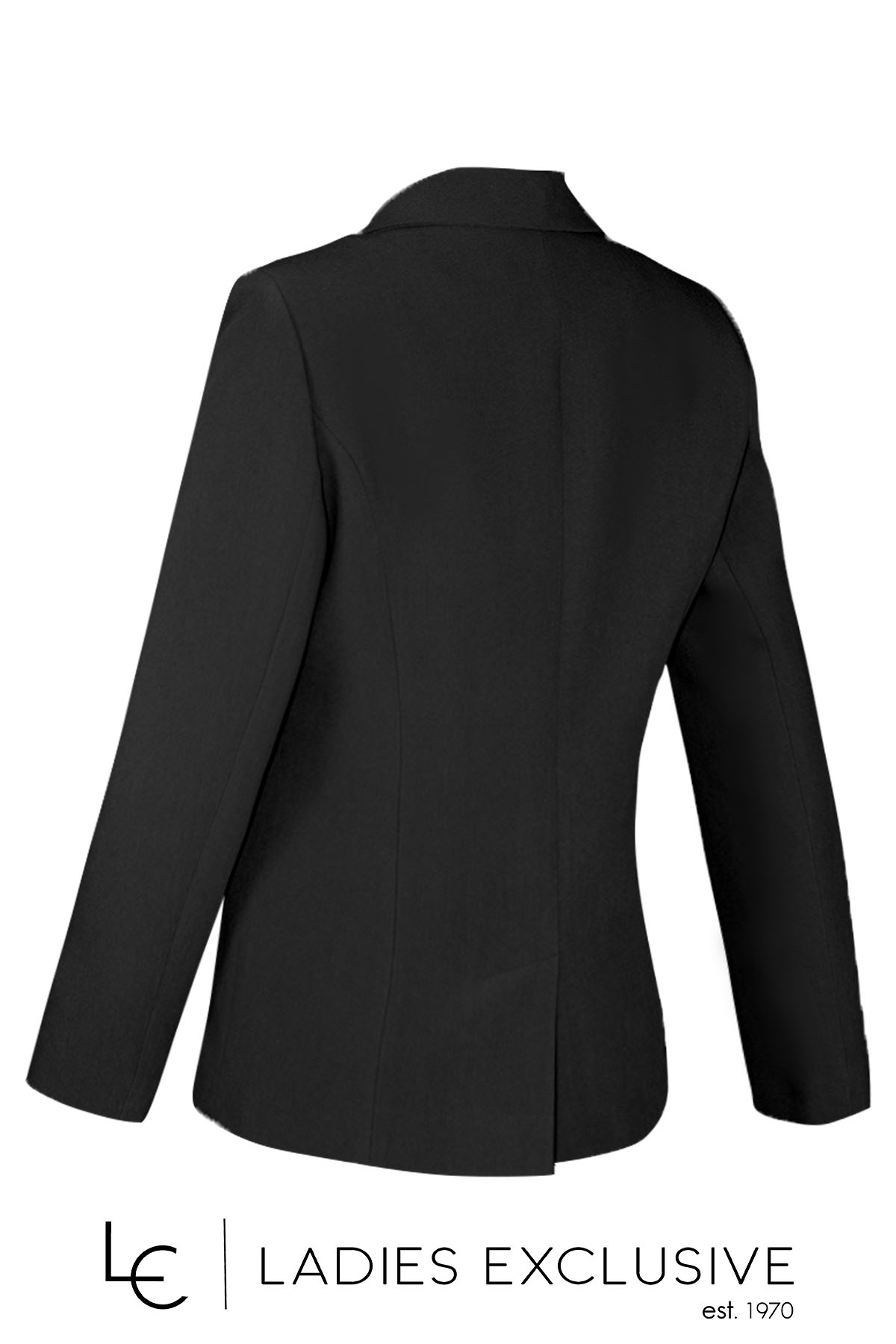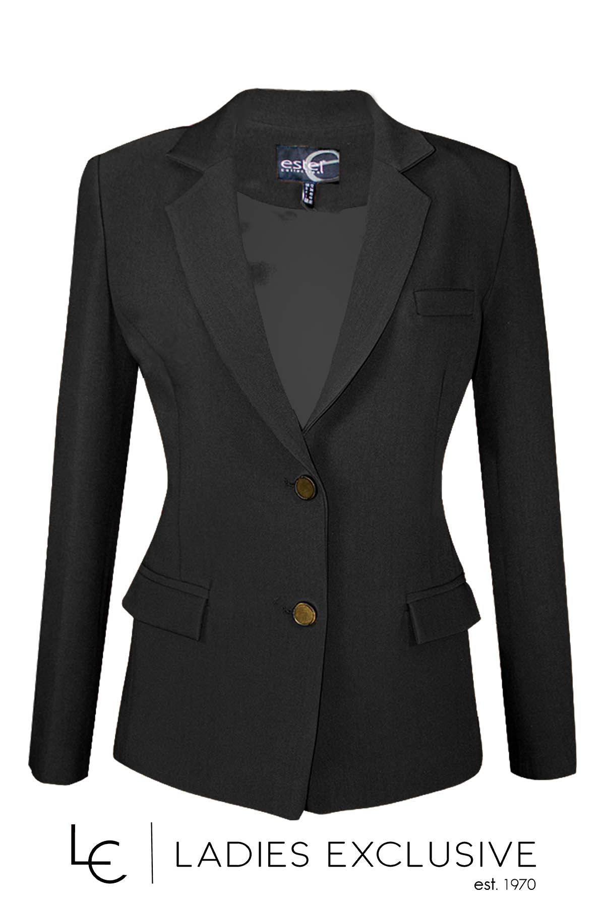 ESTEL Σακάκι μαύρο κρεπ με ρεγιόν, με πέτο γιακά και τσέπες με καπάκια. Γίνεται σετ με το παντελόνι με κωδικό 08103-00.01.