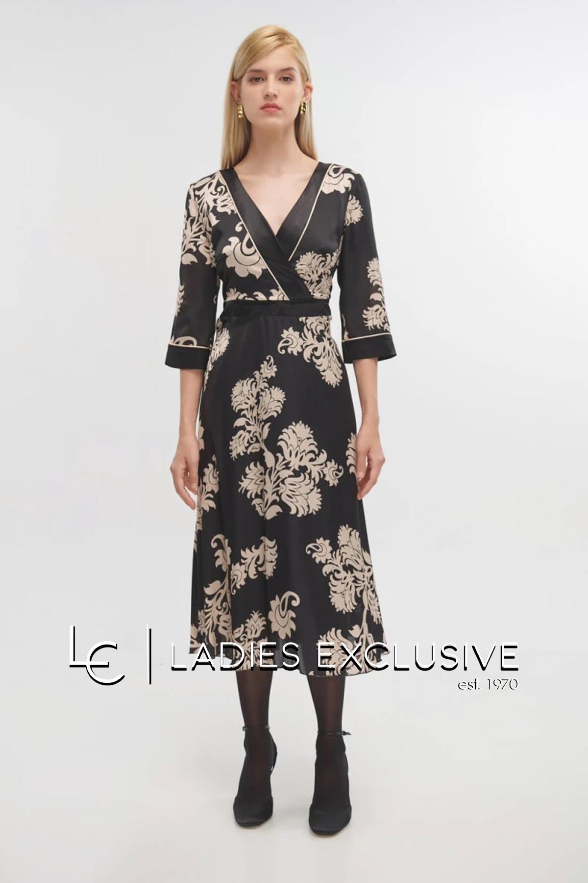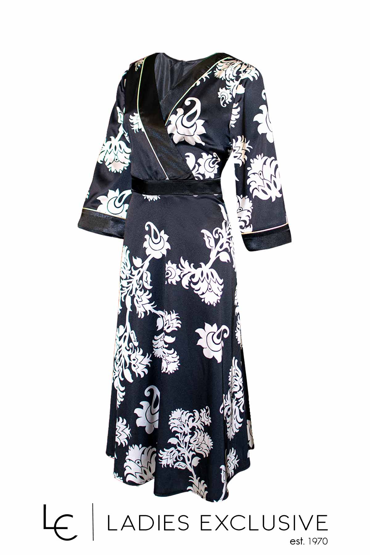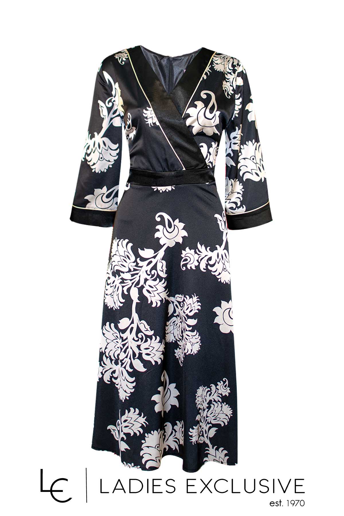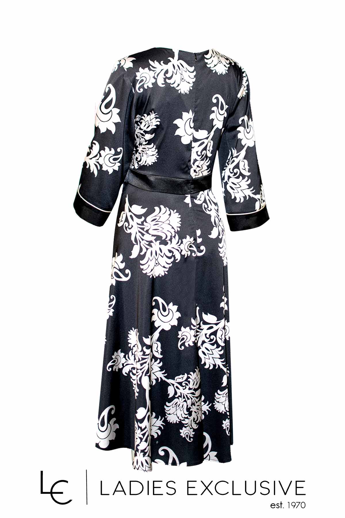 FIBES Φόρεμα ασπρόμαυρο σατέν κρουαζέ, που κλοσάρει στο κάτω μέρος, με μανίκι 3/4.