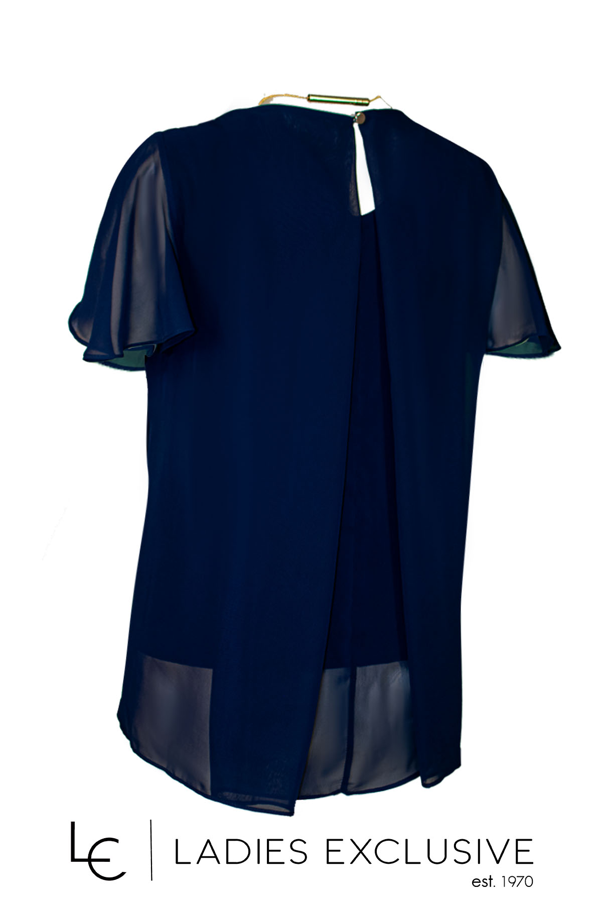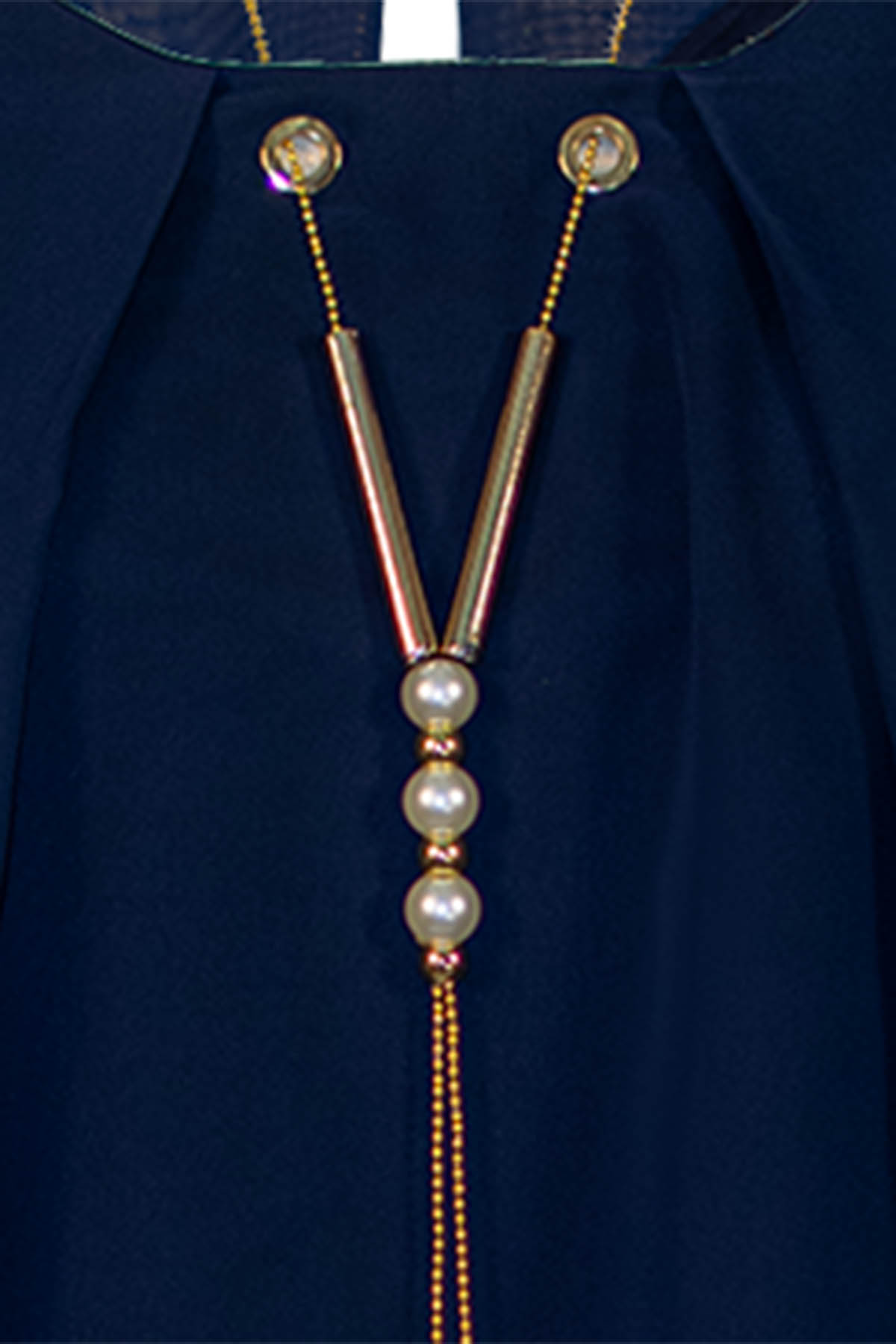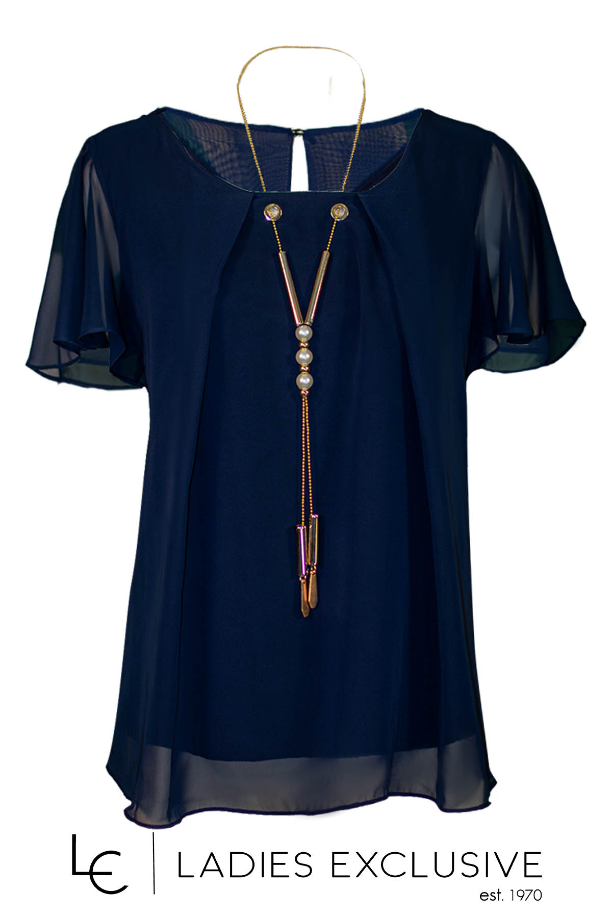 FIBES Μπλούζα μπλε κοντομάνικη από διπλή μουσελίνα, με ενσωματωμένο κολιέ.