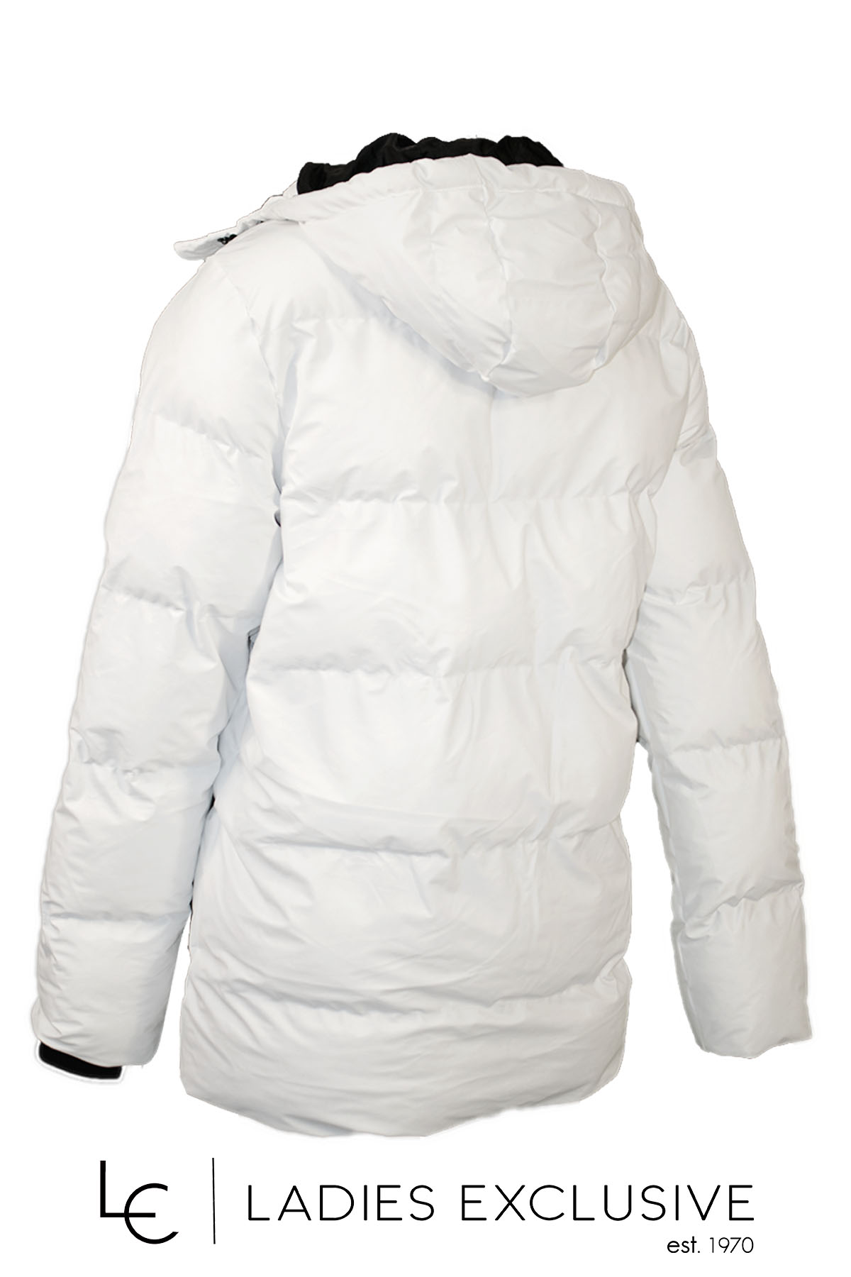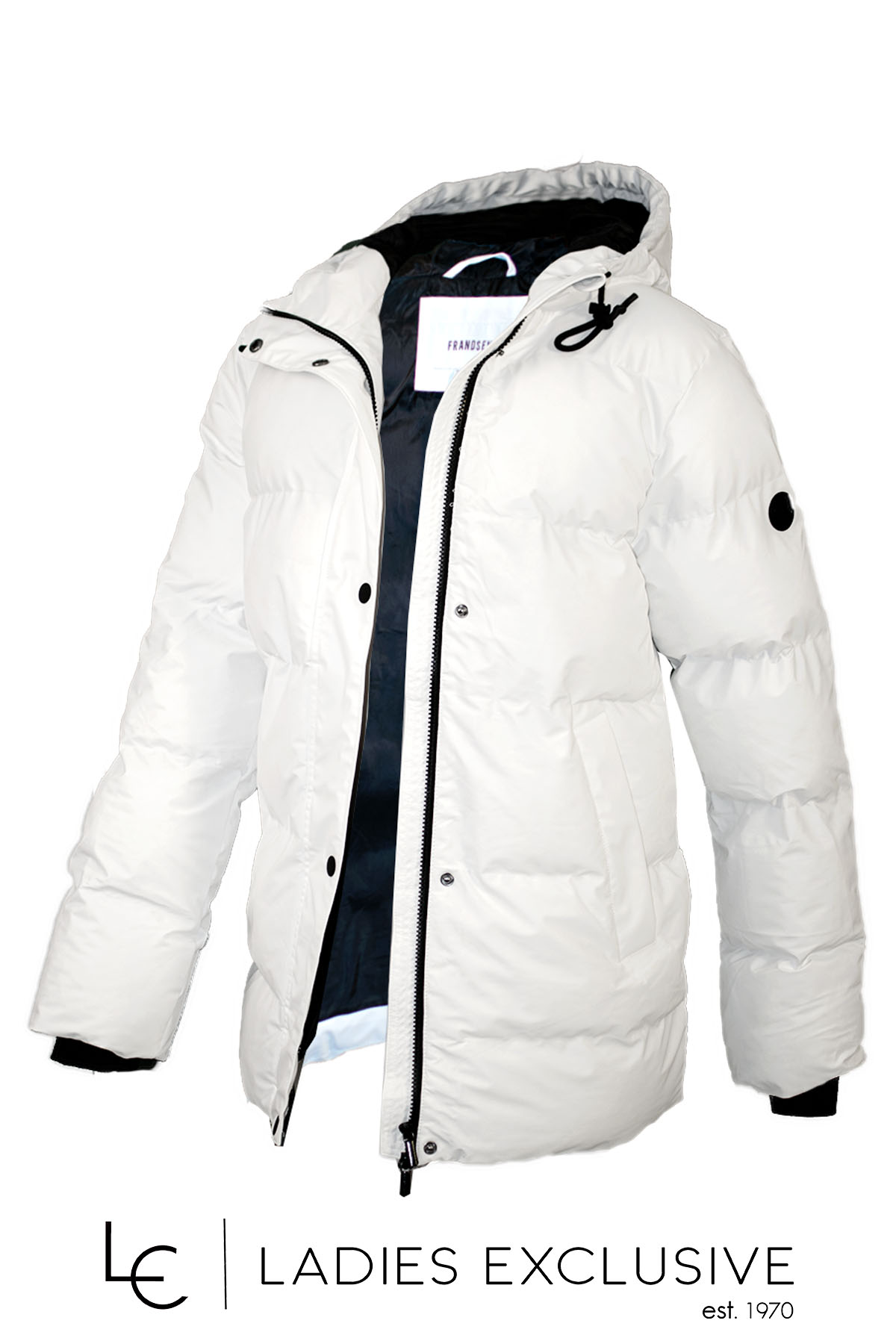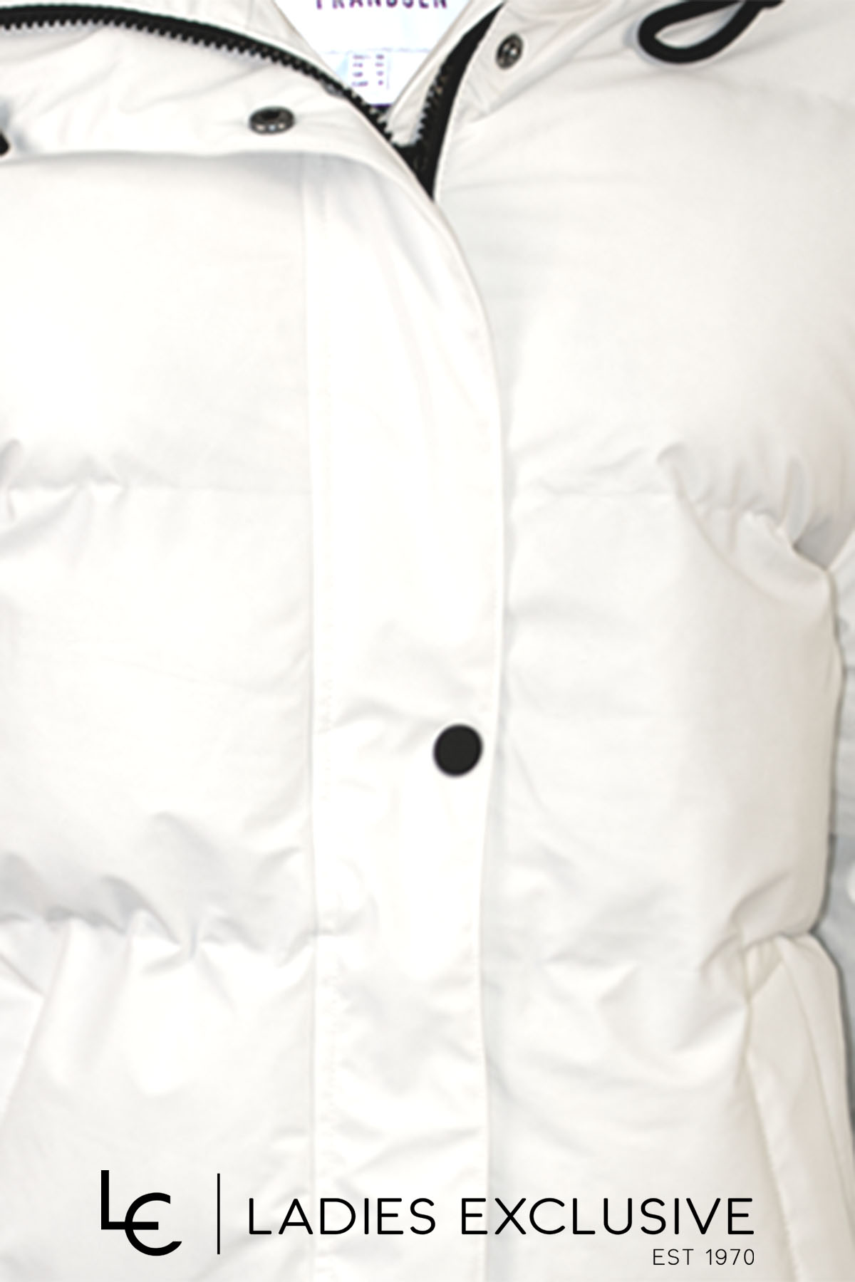 FRANDSEN Μπουφάν λευκό oversized με κουκούλα, που κλείνει με φερμουάρ και μαύρα τρουκς. Καλύπτει και μεγάλα μεγέθη.
