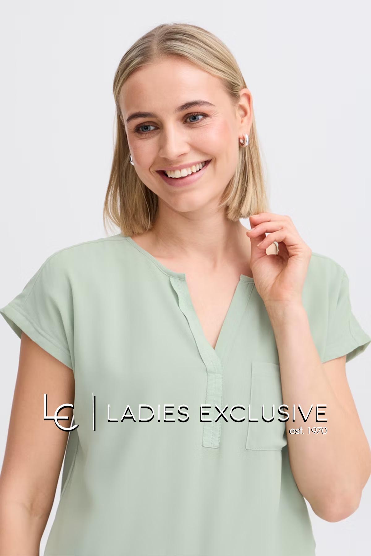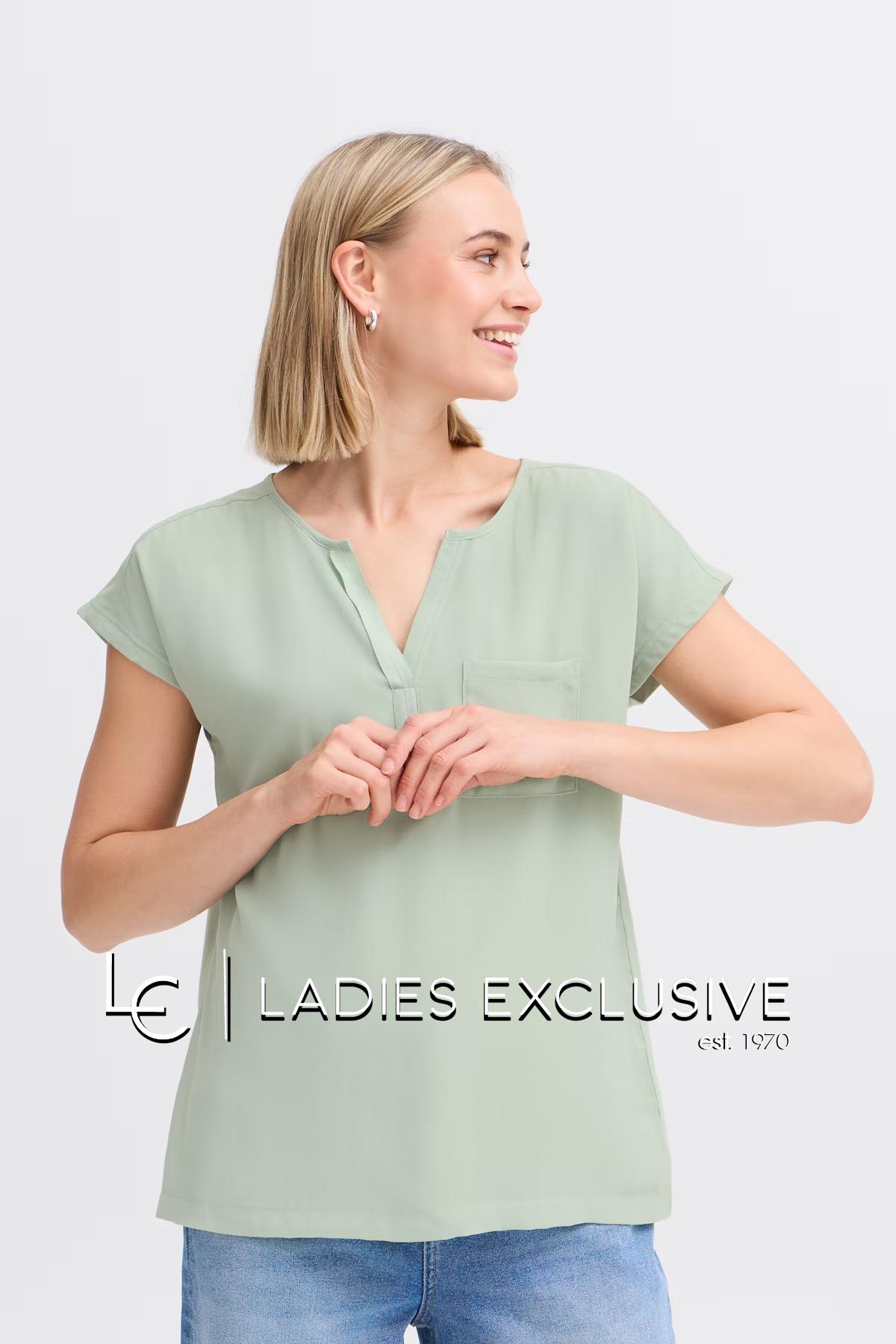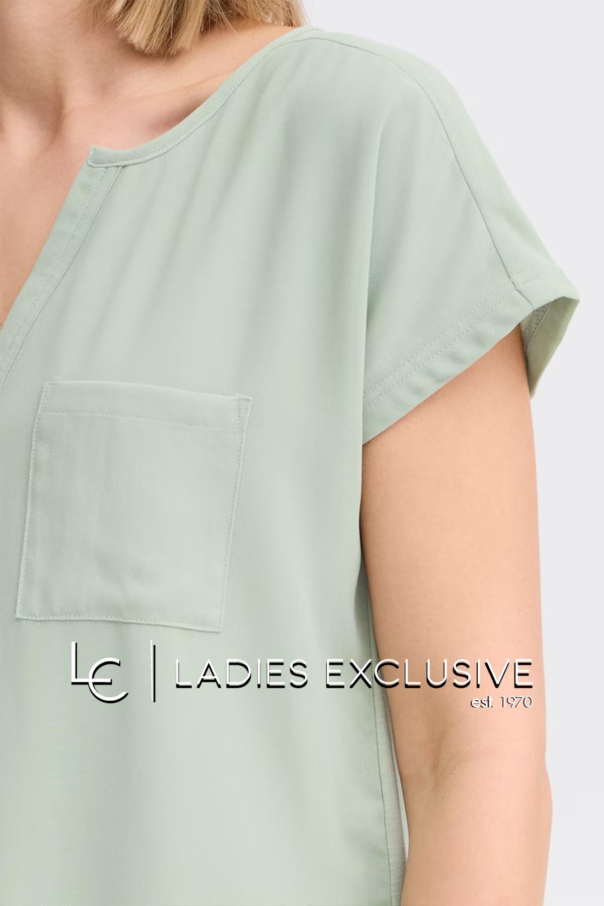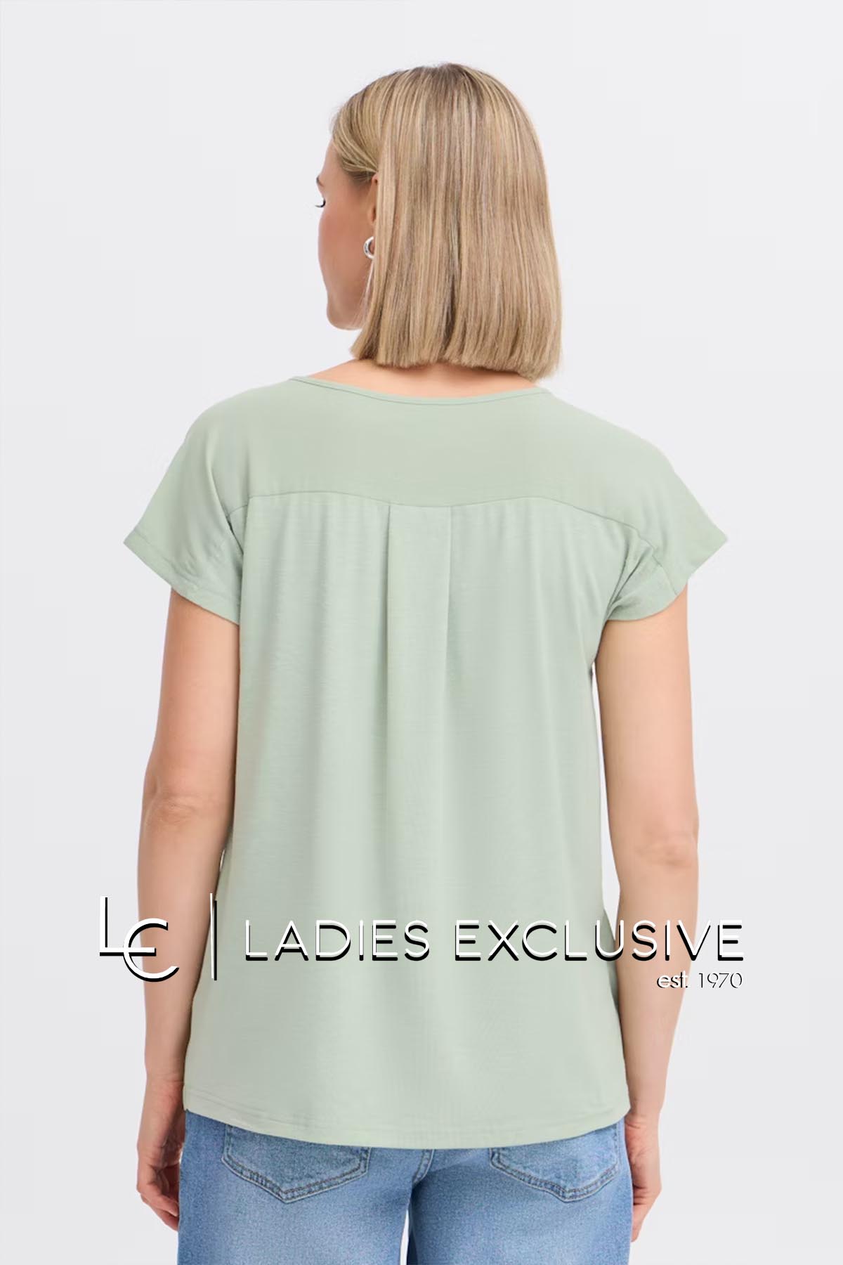 FRANSA Μπλούζα μέντα κοντομάνικη με διπλό ύφασμα, με άνοιγμα v και μικρή τσέπη.