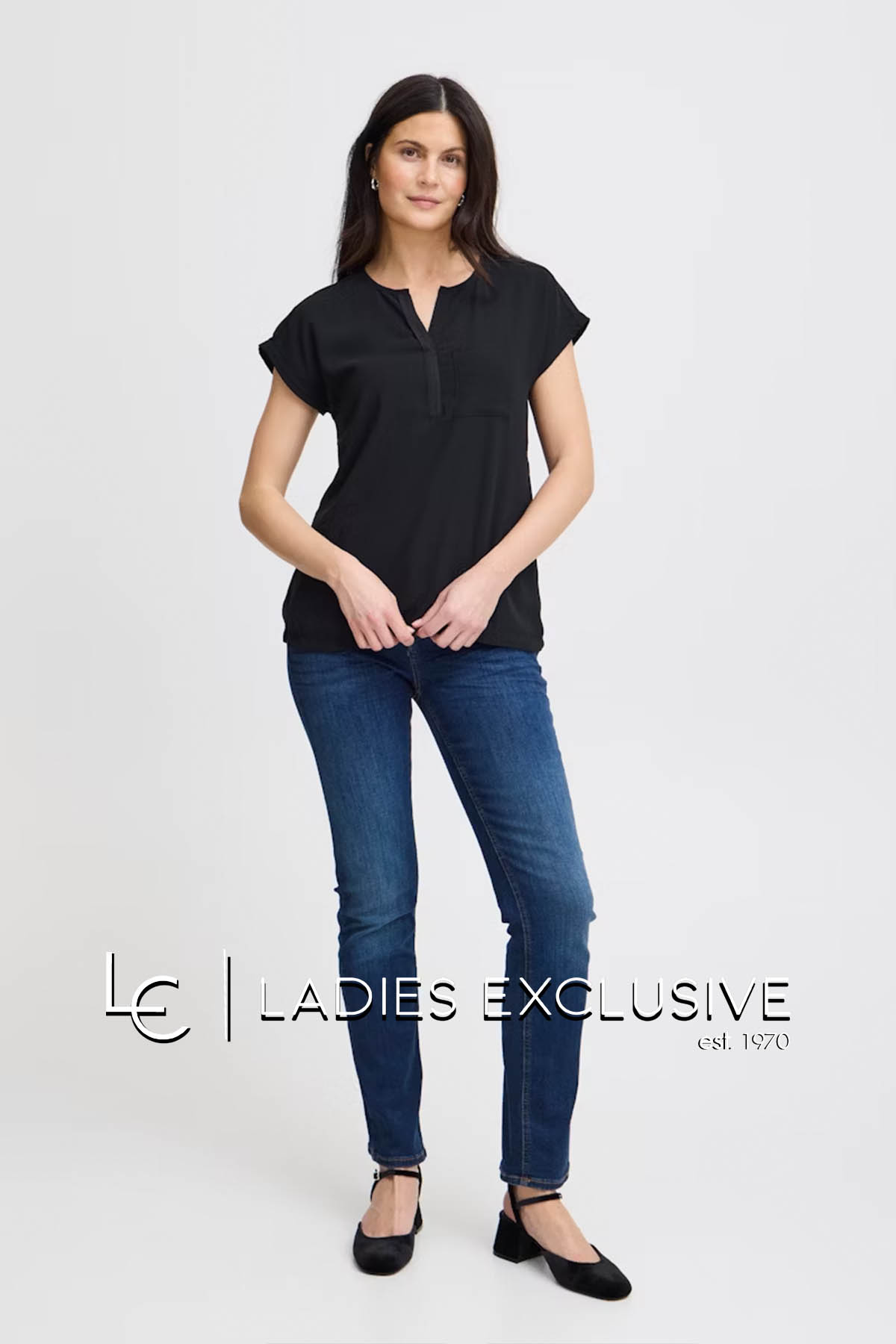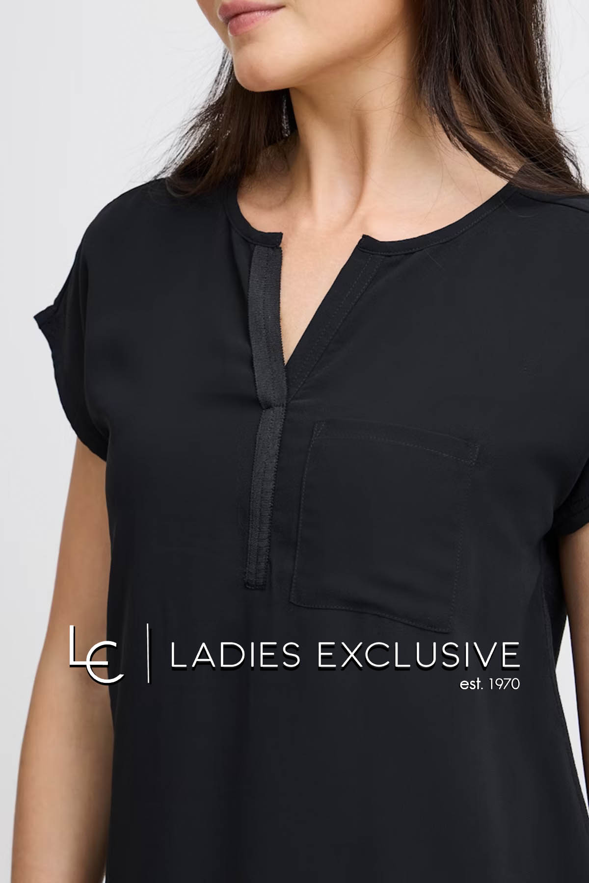 FRANSA Μπλούζα μαύρη κοντομάνικη με διπλό ύφασμα, με άνοιγμα v και μικρή τσέπη.