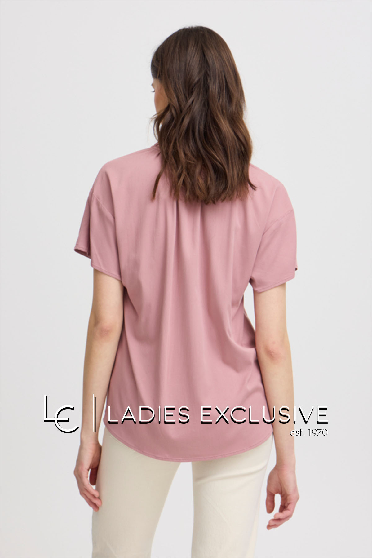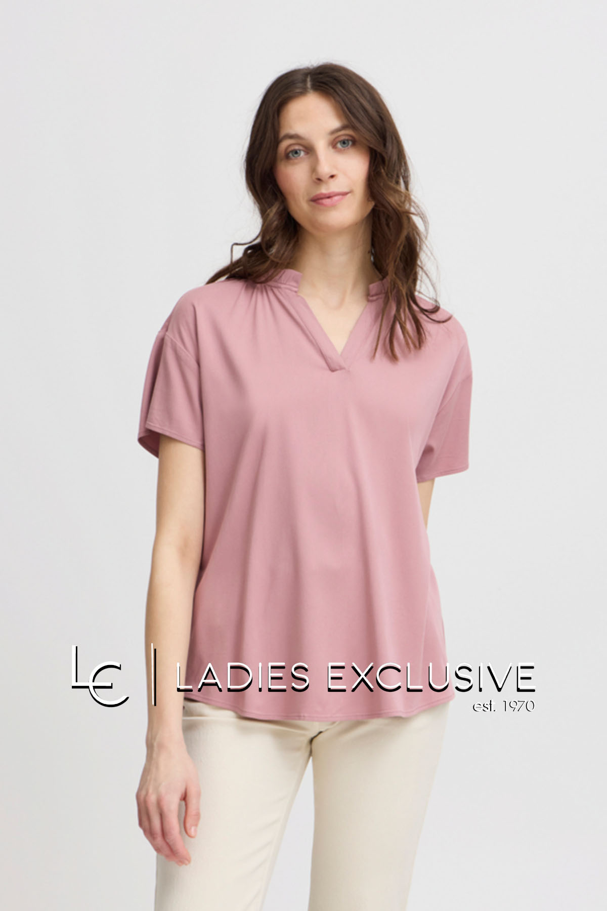 FRANSA Μπλούζα ροζ κοντομάνικη με μικρό βολάν και άνοιγμα v.