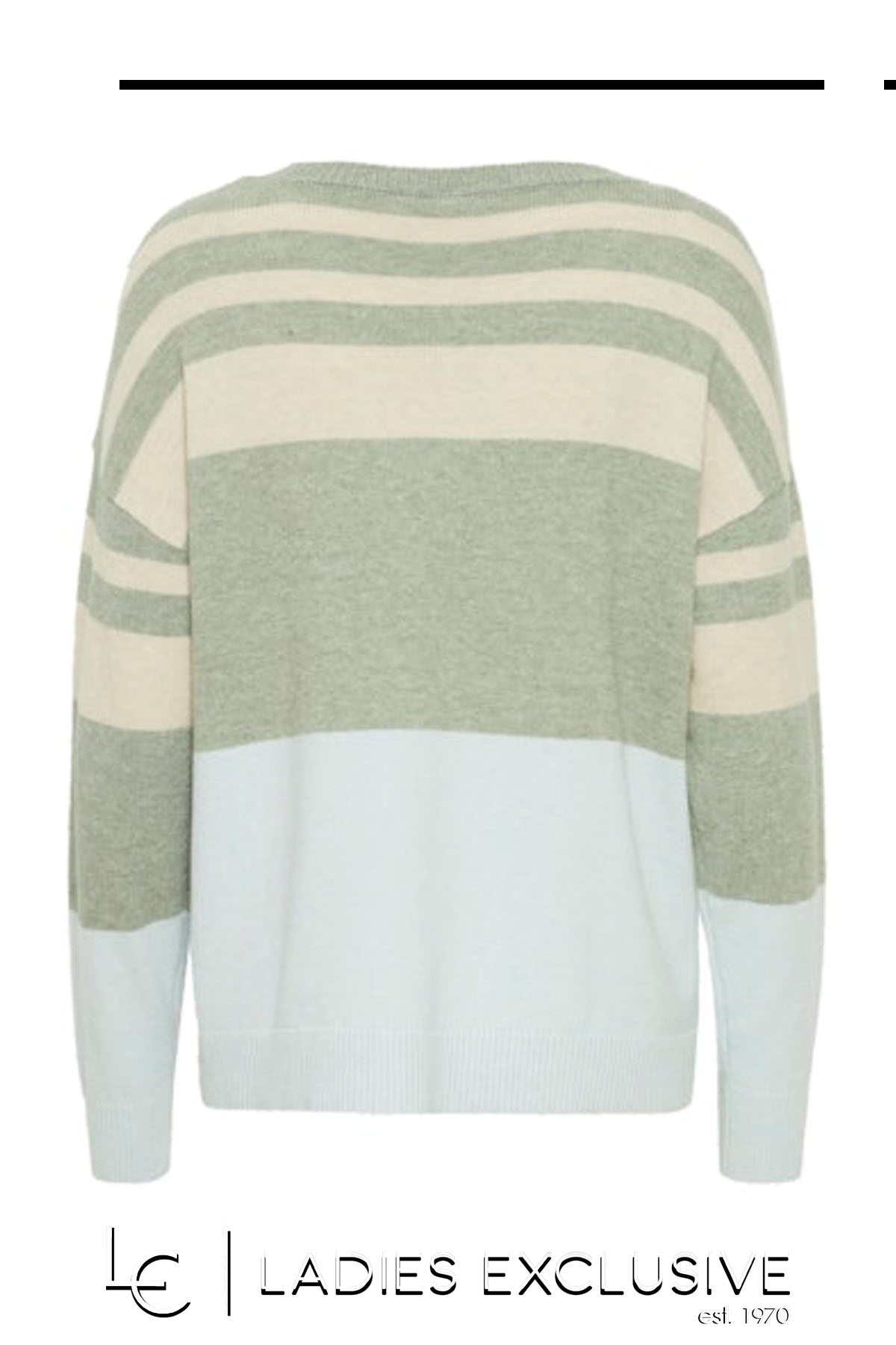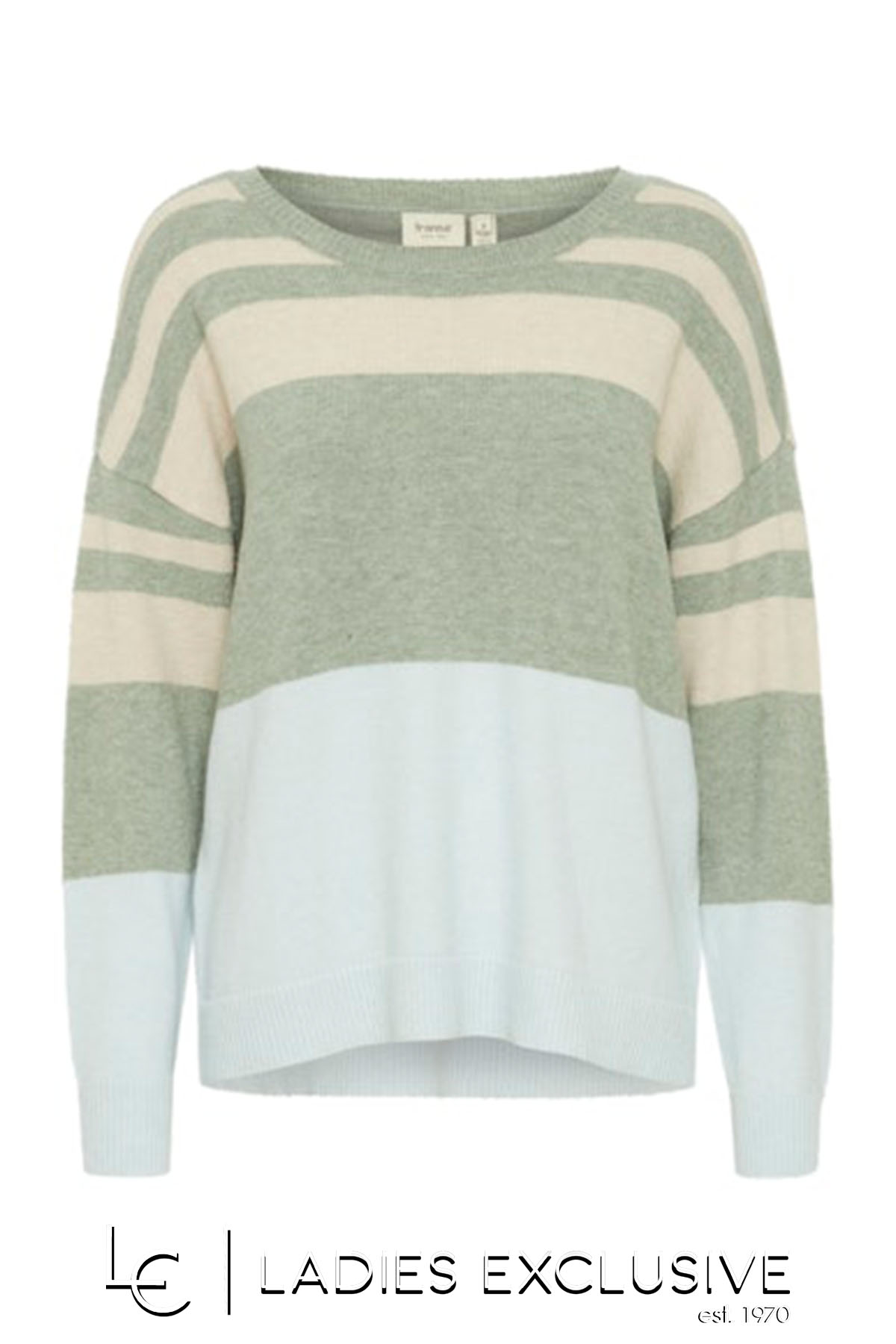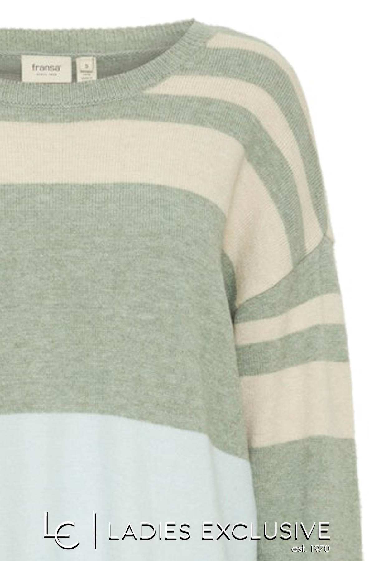 FRANSA Μπλούζα πλεκτή ριγέ σε αποχρώσεις μπεζ και μέντα, με στρογγυλη λαιμόκοψη και άνετο λάστιχο στο τελείωμα.