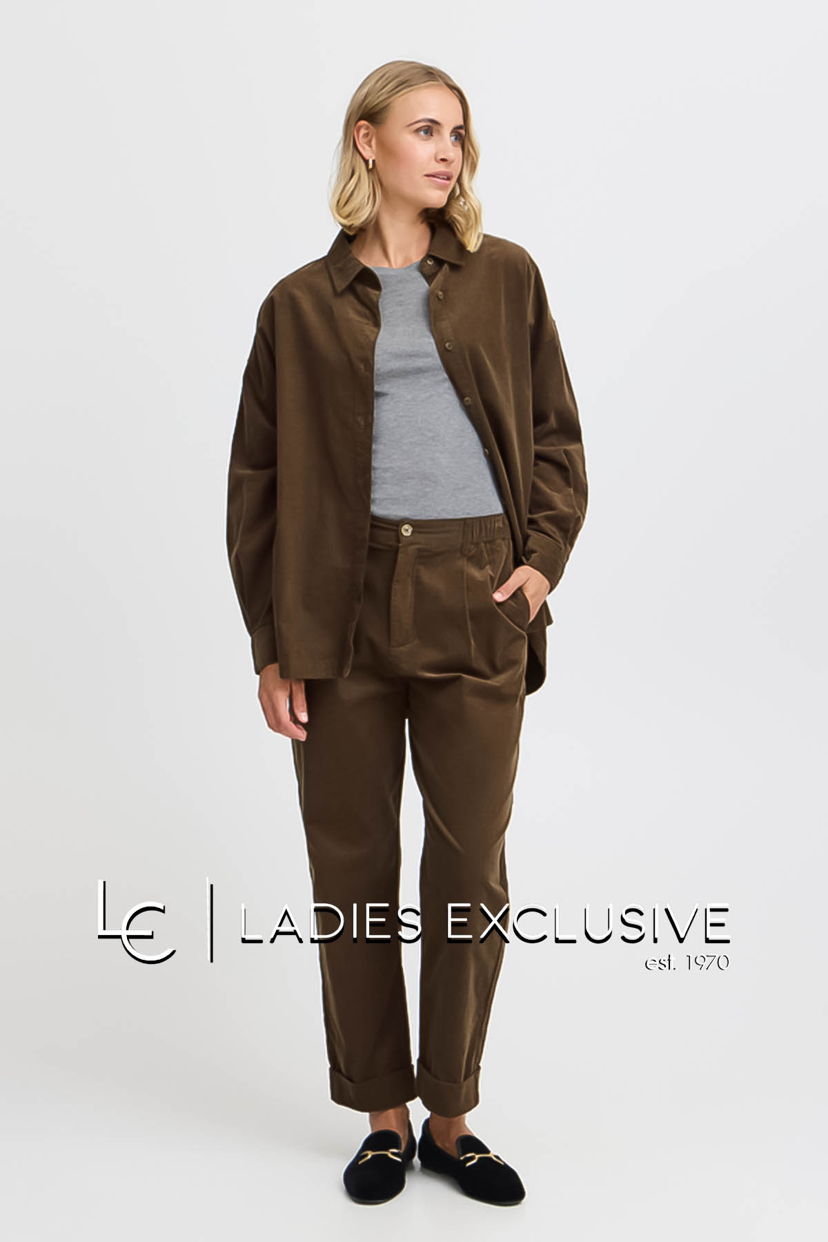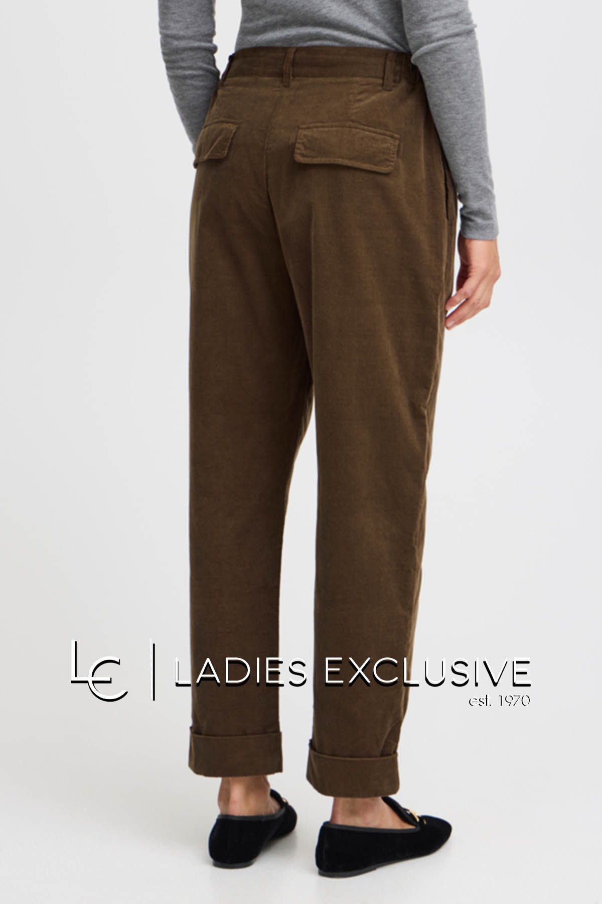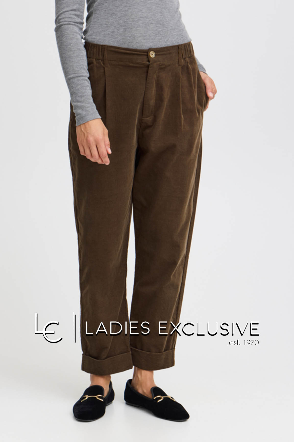 FRANSA Παντελόνι καφέ κοτλέ με λάστιχο στα πλαϊνά της μέσης και ρεβέρ στο κάτω μέρος. Έχει άνετη γραμμή.
