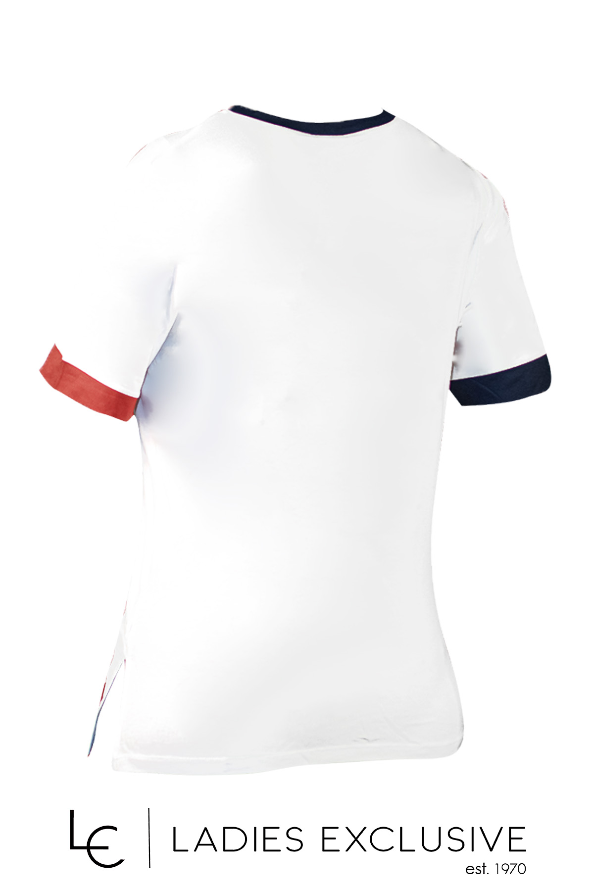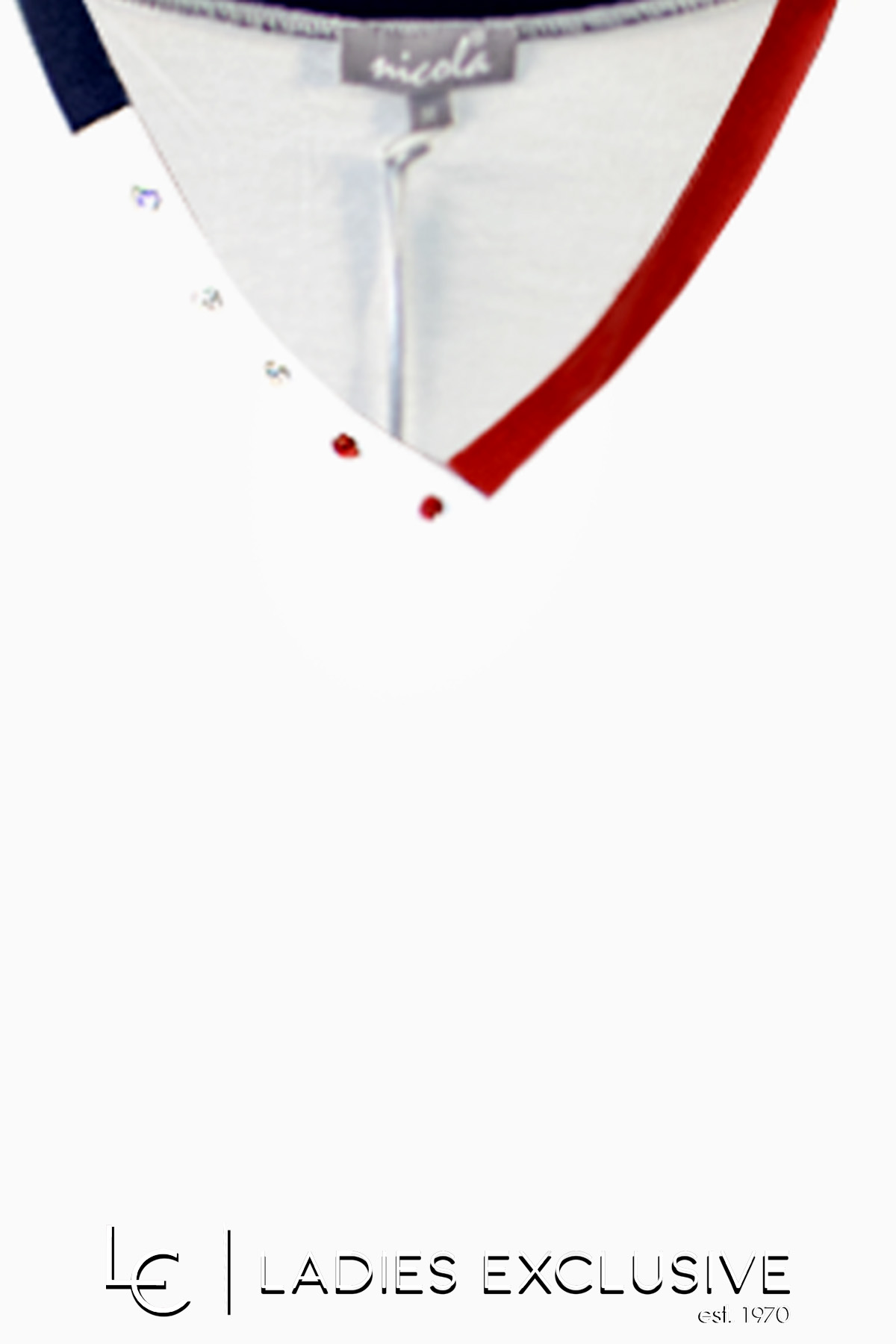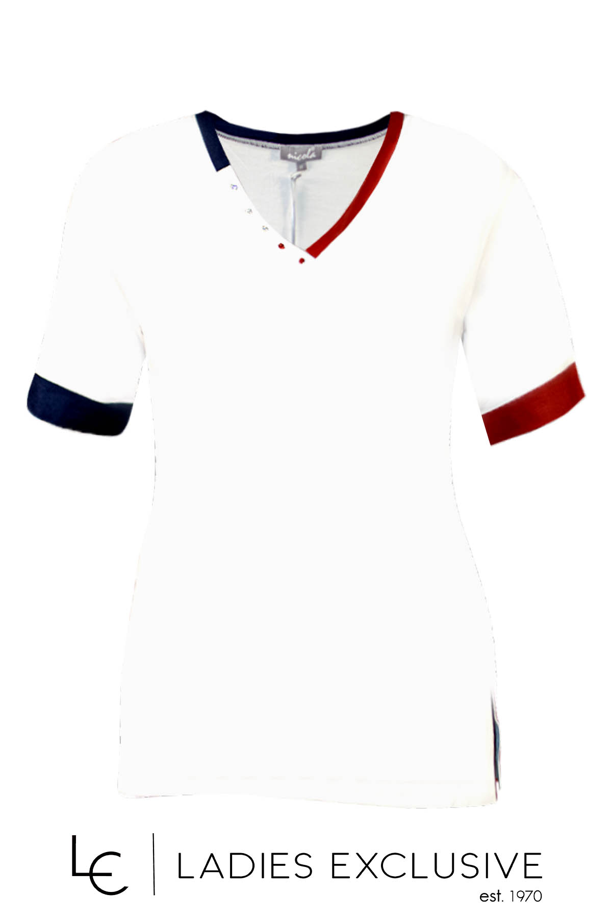 NICOLA Μπλούζα λευκή κοντομάνικη με άνοιγμα v, με κόκκινες και μπλε λεπτομέρειες και μικρές πέτρες.