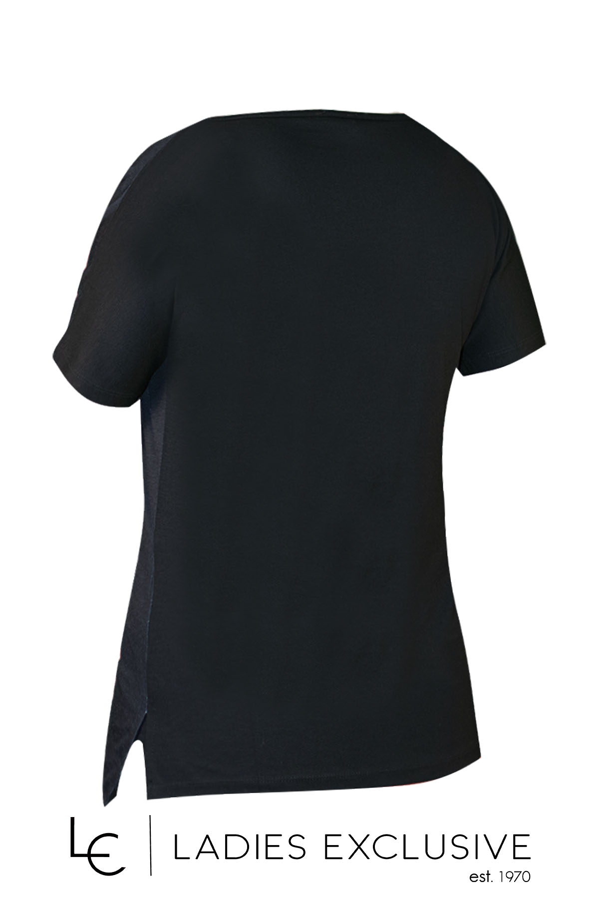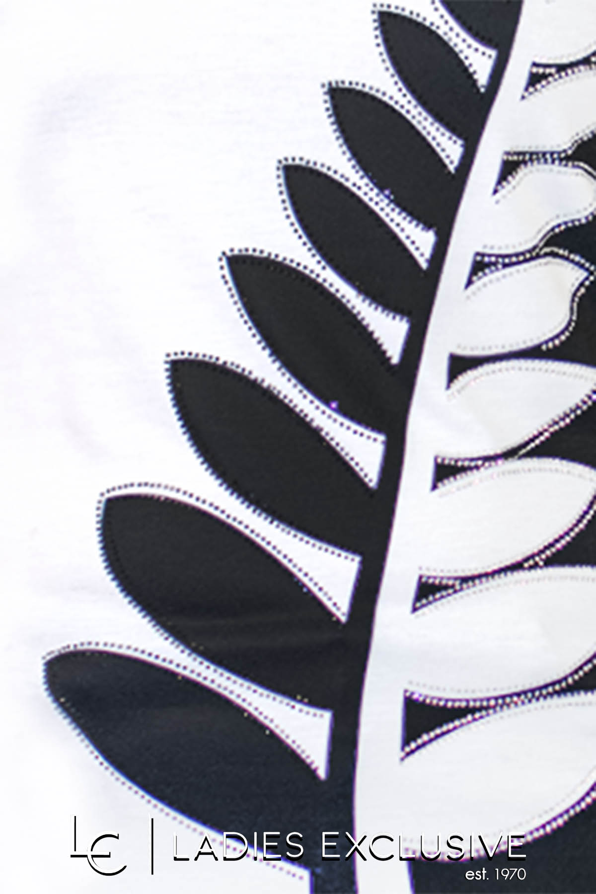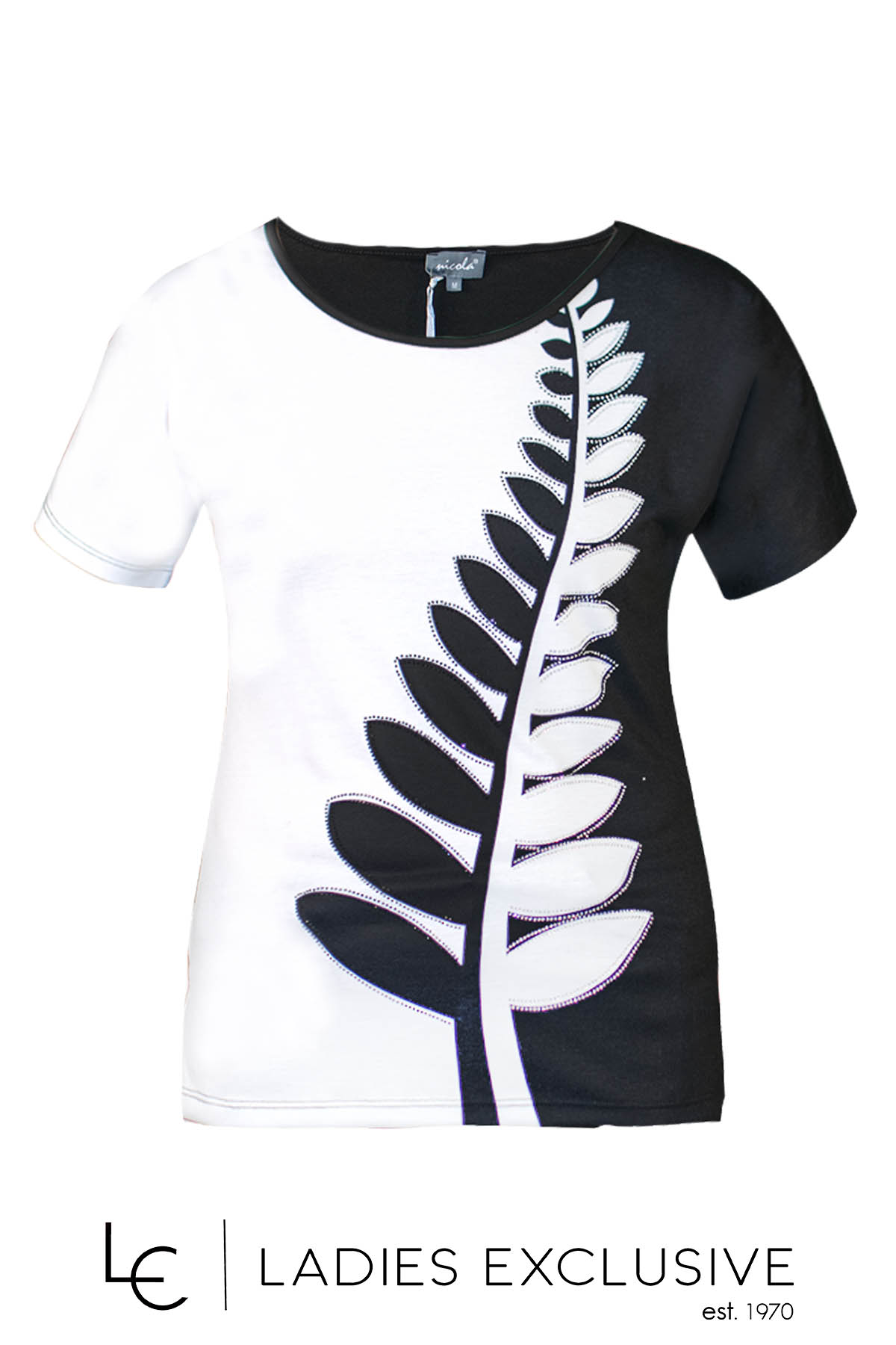NICOLA Μπλούζα ασπρόμαυρη κοντομάνικη με σχέδιο φύλλα και στρας και μανίκι ρεγκλάν.